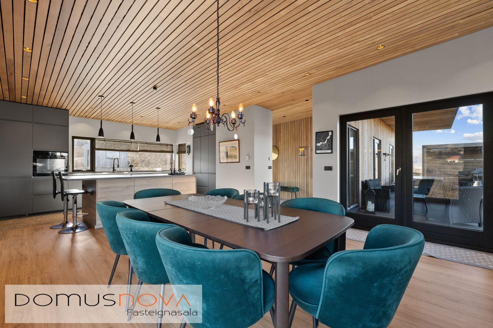 Borðstofa - stendur miðsvæðis í mjög björtu rými og er útsýni úr henni til allra átta einstakt, útgengt út á verönd og harðparket á gólfi.