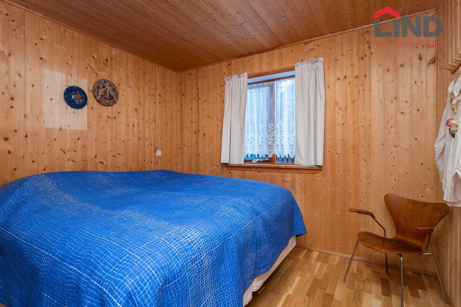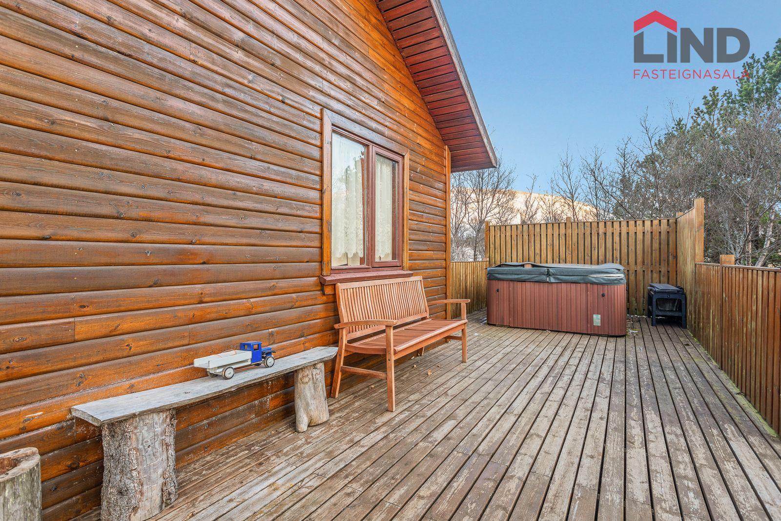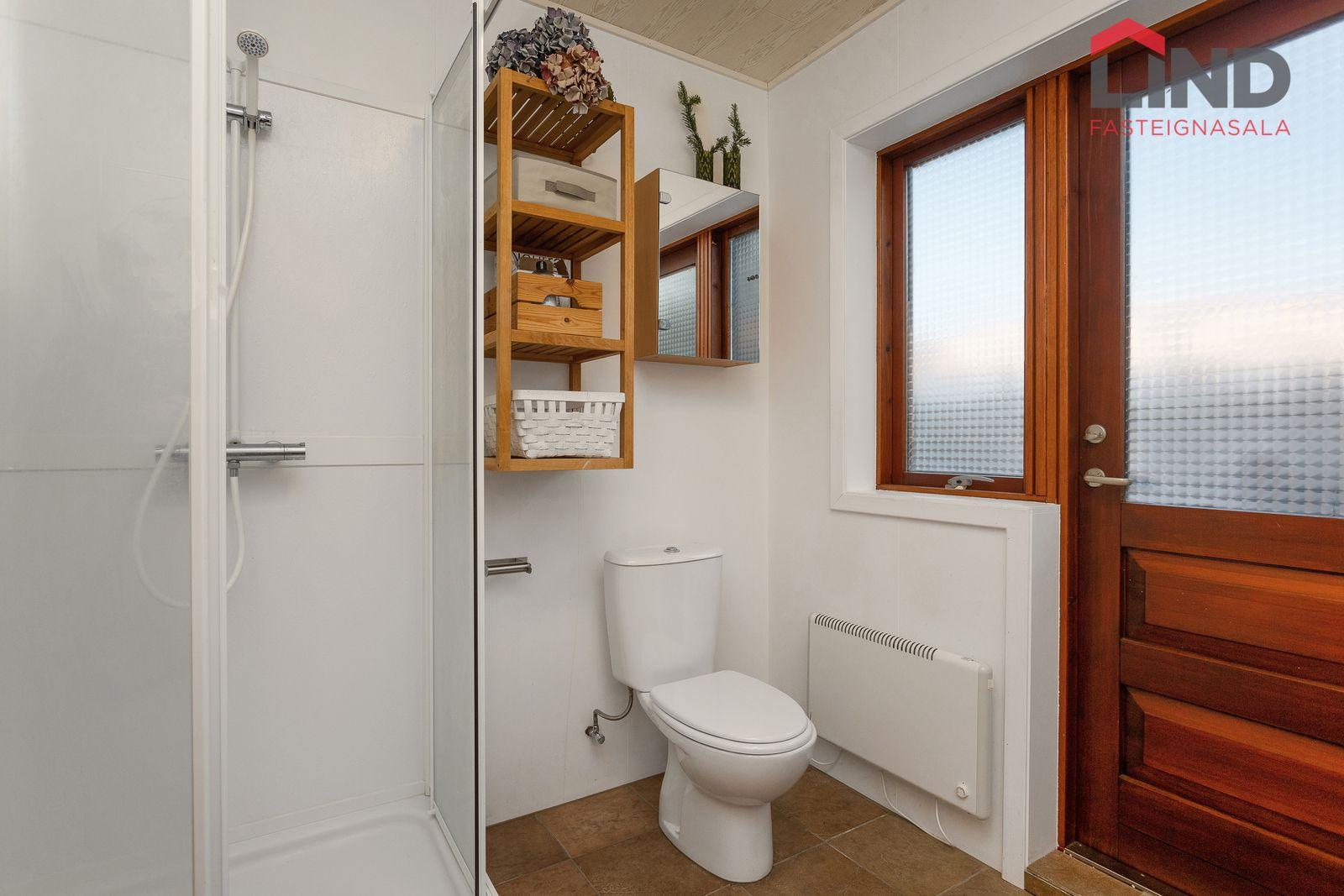 Lýsing eignar: Bústaðurinn er parketlagður utan baðherbergis. Gengið er inn í forstofu með forstofuskápum. Tvö ágætlega rúmgóð svefnherbergi eru til staðar. Baðherbergið er með flísum á gólfi, sturtuklefa og útgengi út á verönd. Stofan og eldhúsið eru í sama rými með góðri lofthæð. Geymsluloft er yfir hluta eignarinnar.