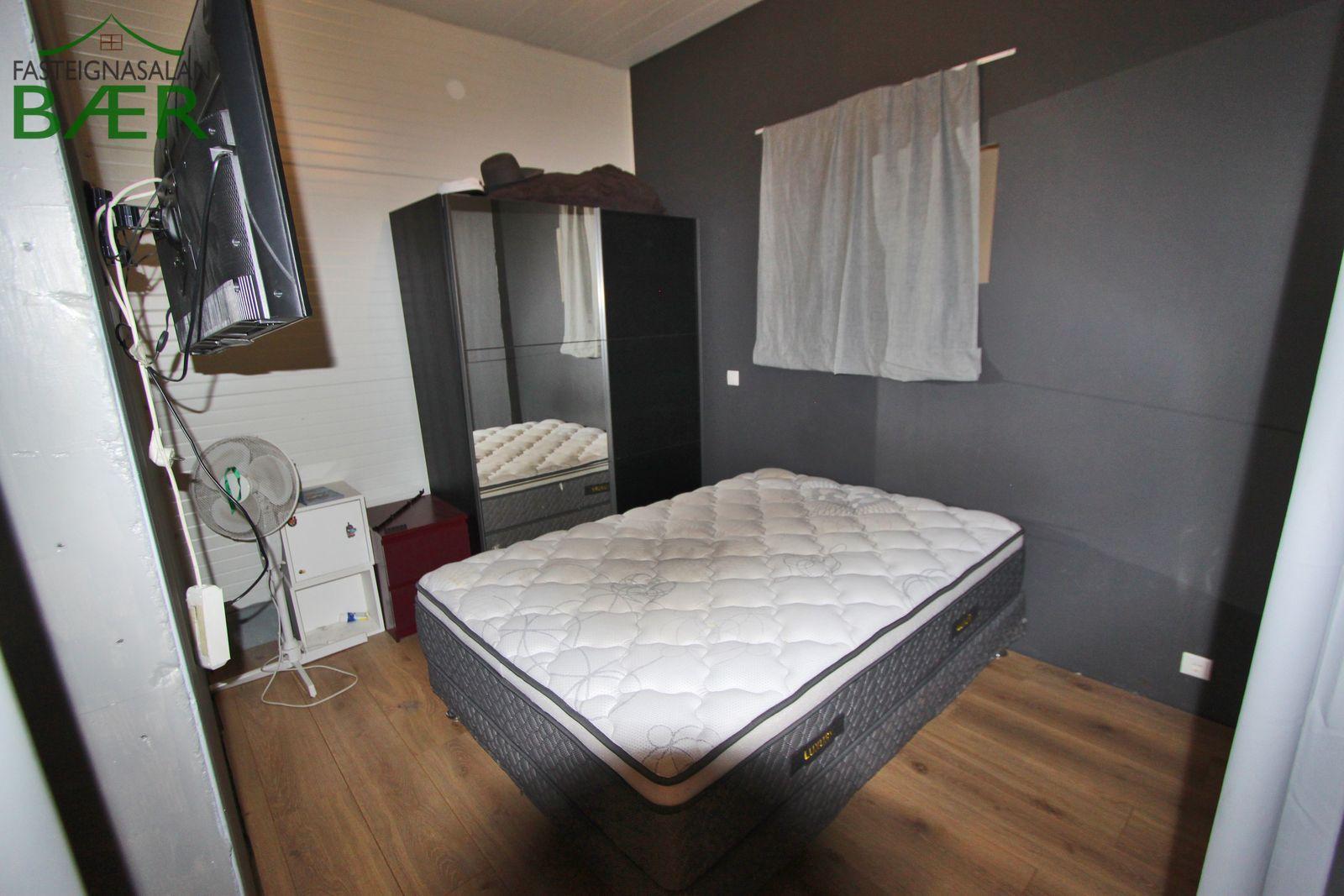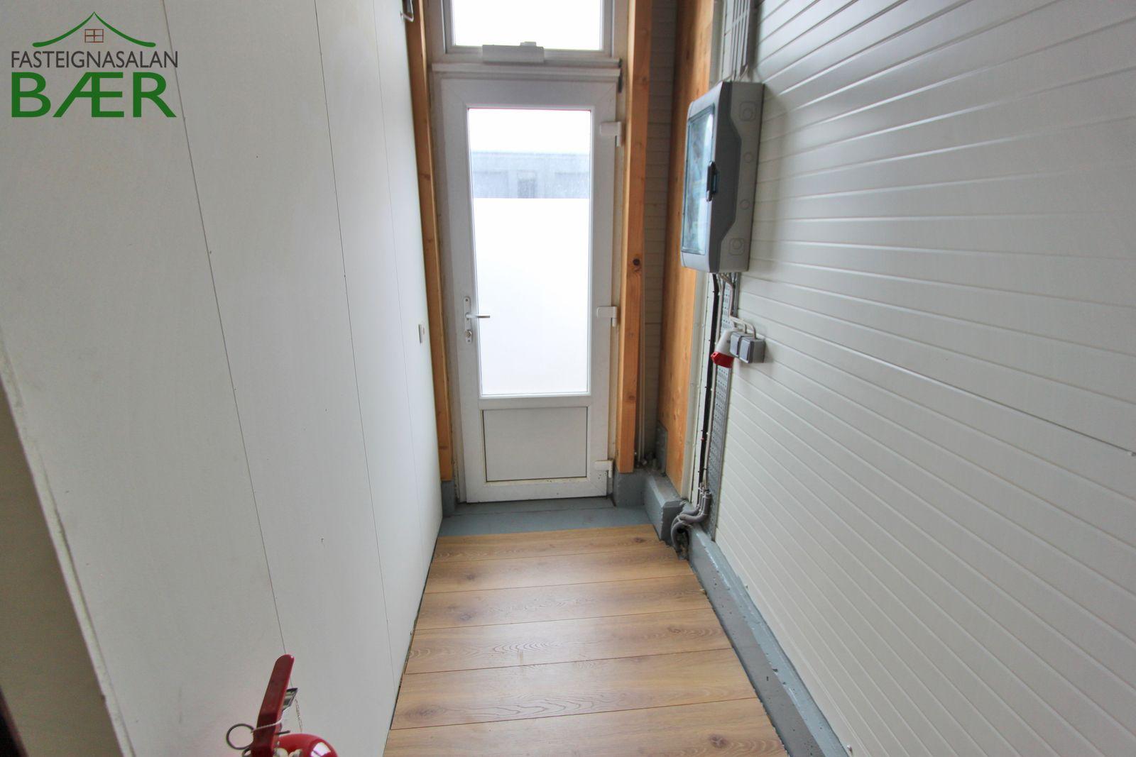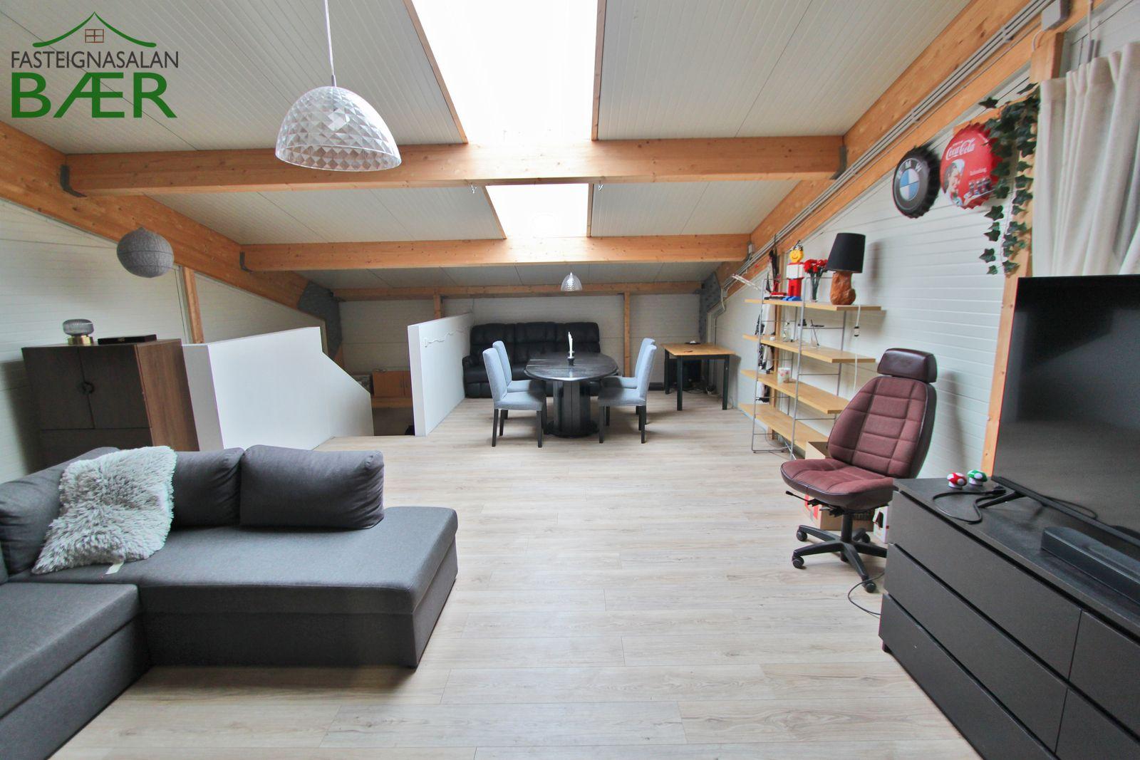 Fyrir innan millivegg er eldhús og borðkrókur, tengi fyrir þvottavél undir stiga og gott svefnherbergi. Baðherbergi með sturtu. Gönguhurð er út úr húsnæðini í norður á efri hæð er gott rými með parket á gólfi og er notað sem stofa og borðstofa í dag. Hægt er að nýta efri hæð sem lager húsnæði einnig. Snyrtileg og góð eign. Búið er að greiða virðisaukakröfu þannig að það þarf ekki að vera með vask skylda starfssemi í húsinu. Tilvalið fyrir þá sem vilja hafa hobby aðstöðu eða lítin rekstur og búa á efri hæð.