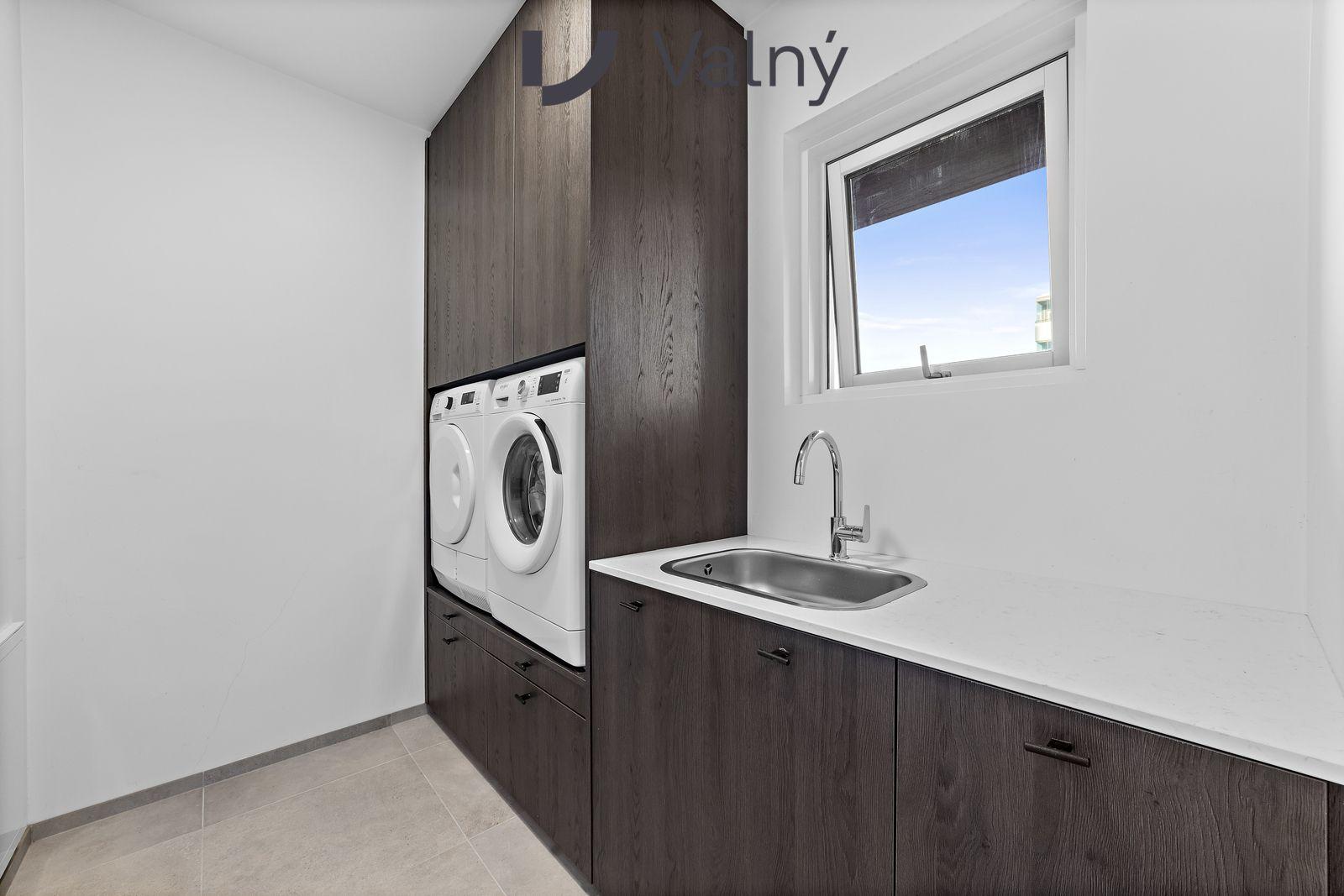 Þvottahús innaf forstofu með innréttingu fyrir vélar í vinnuhæð og skolvaski. Flísalagt gólf.