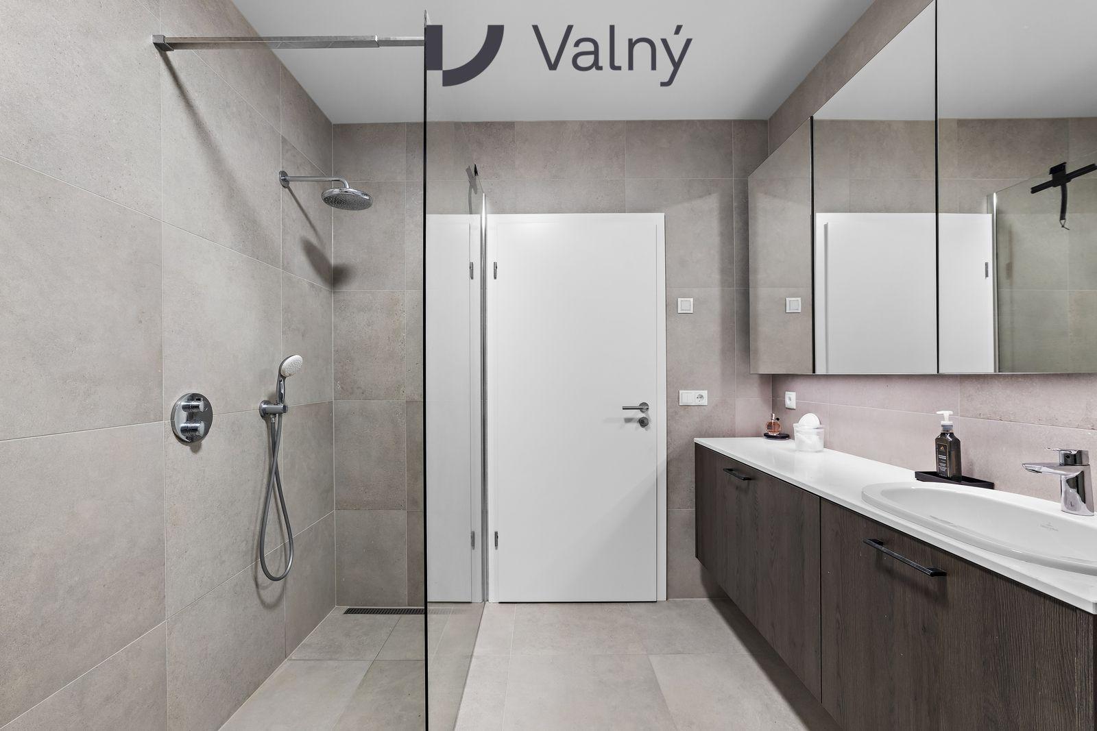 Baðherbergi flísalagt í hólf og gólf með walk-in sturtu, upphengdu salerni, handklæðaofni og innréttingu með vaski og speglaskáp.