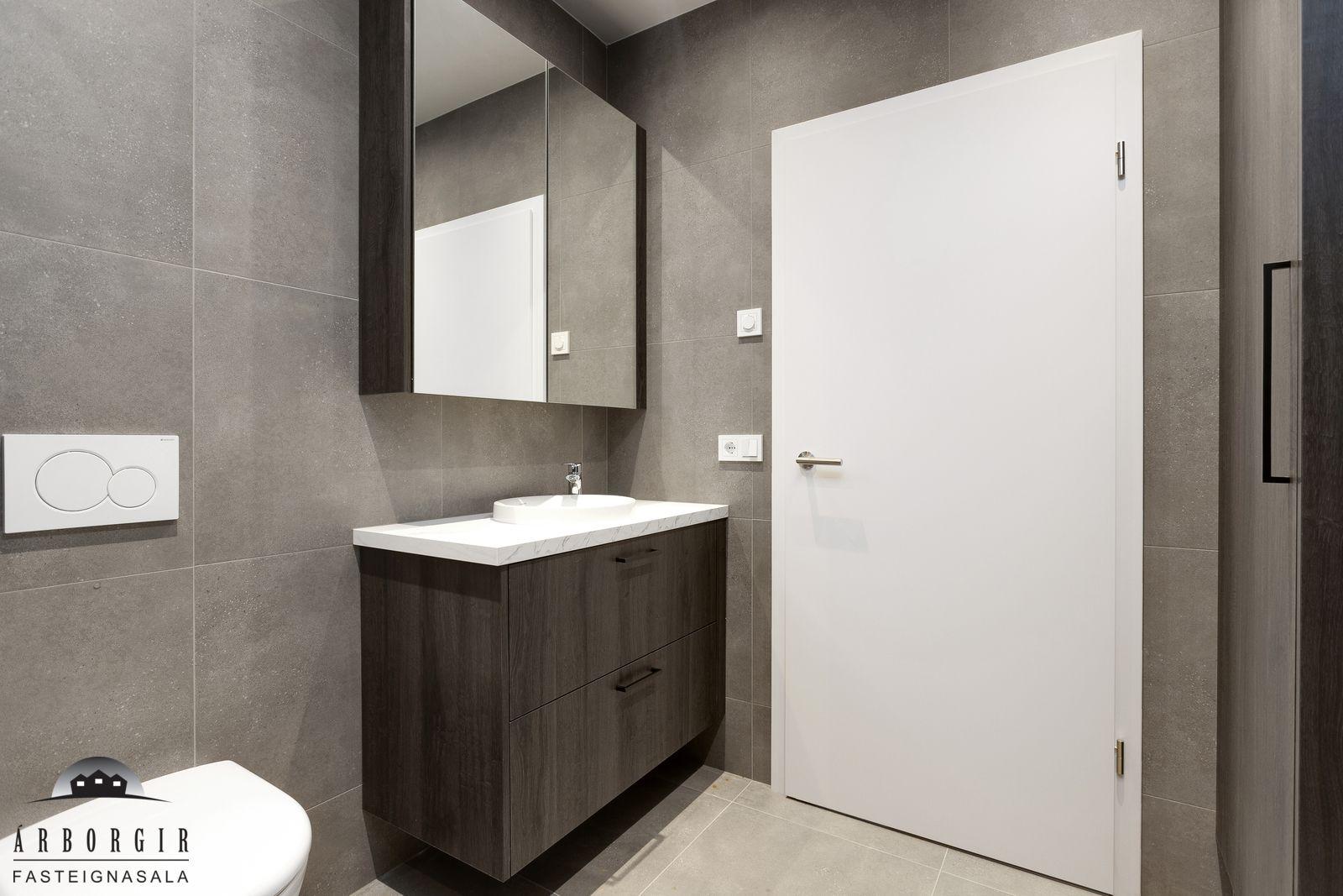 Nánari lýsing: Flísar eru á gólfi í forstofu og þar er fataskápur og fatahengi. Þvottahúsið er flísalagt, þar er góð innrétting fyrir tæki í vinnuhæð. Baðherbergi er flísalagt bæði gólf og veggir, þar er rúmgóð gólfsturta með innbyggðum tækjum, góð innrétting með handlaug og handklæðaskápur. Herbergin eru þrjú, öll parketlögð og eru skápar í þeim öllum. Stofa og eldhús eru í opnu rými, smekkleg innrétting með innbyggðum ísskáp og uppþvottavél er í eldhúsi en í stofu er hurð útá baklóð. Innfelld ledljós eru í flestum rýmum. Lóðin er þökulögð og mulningur er í innkeyrslu.