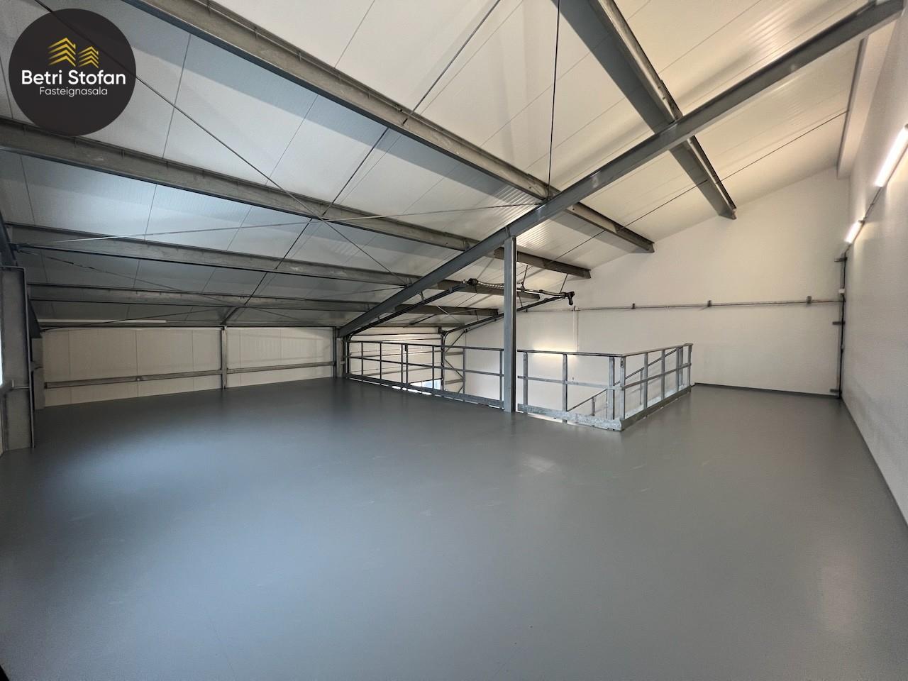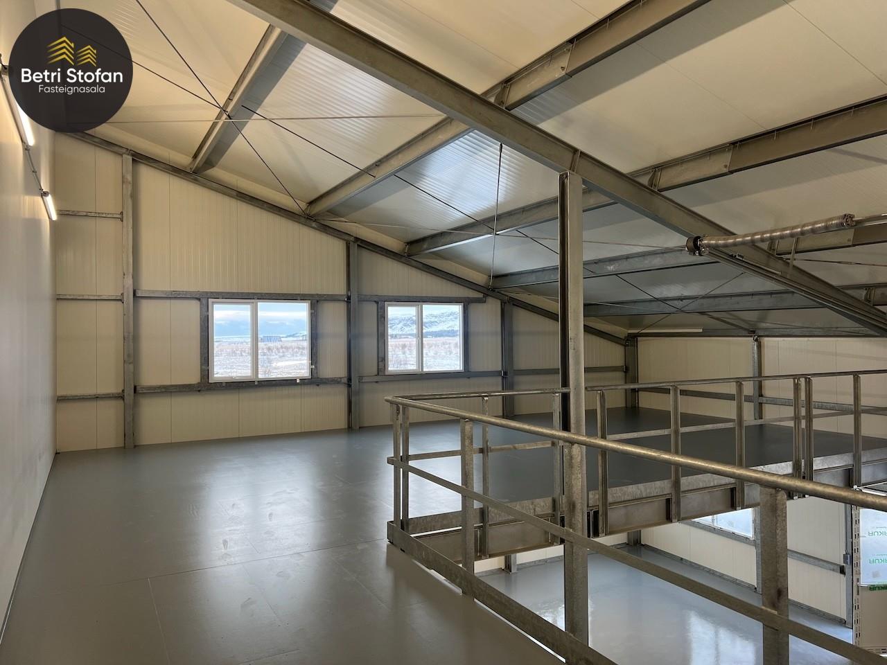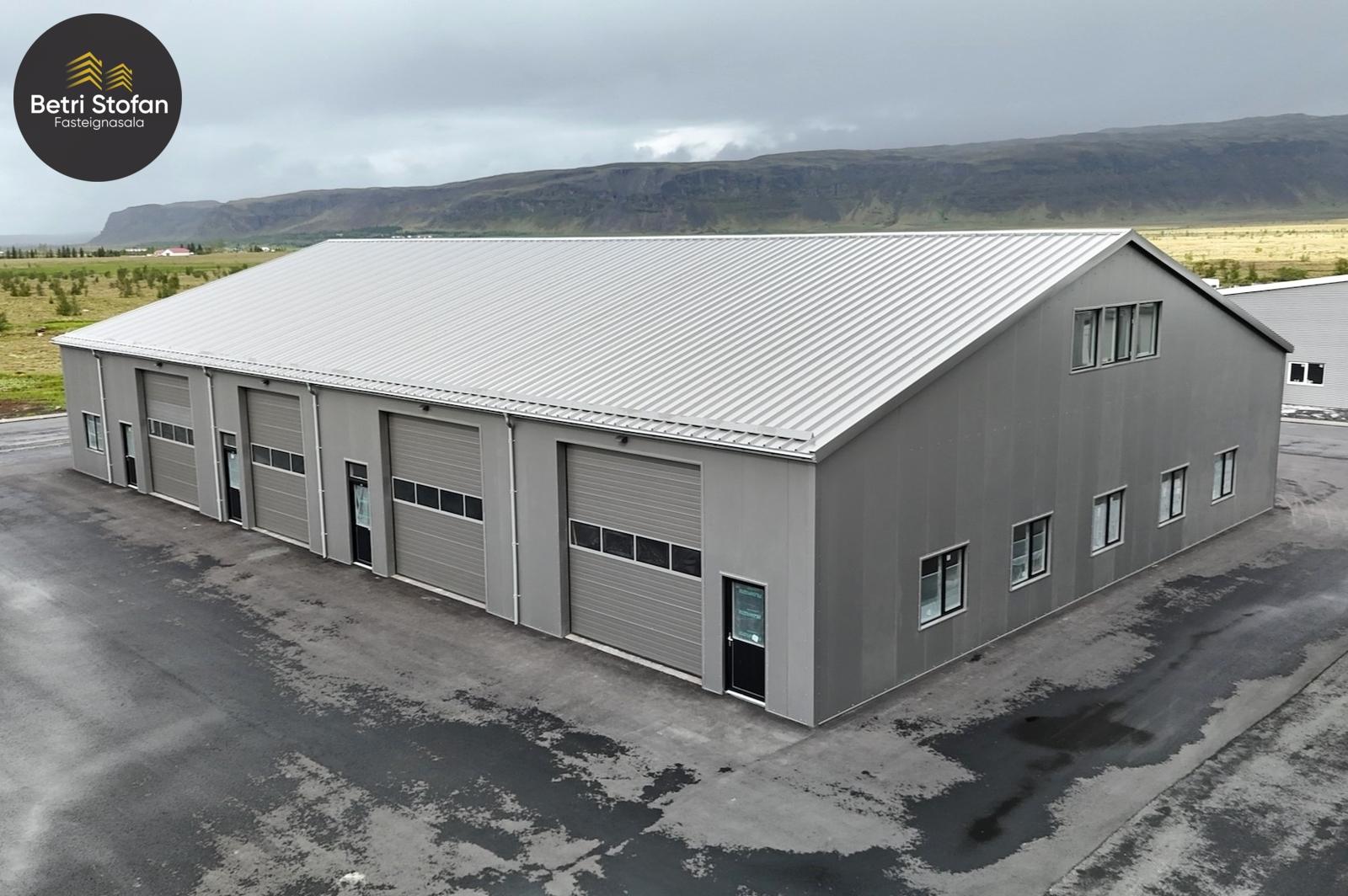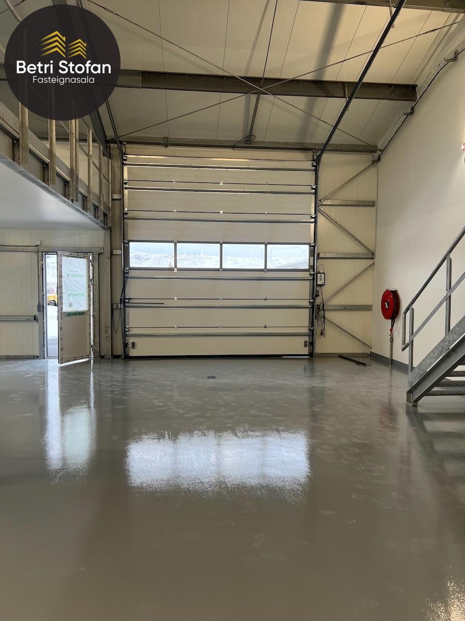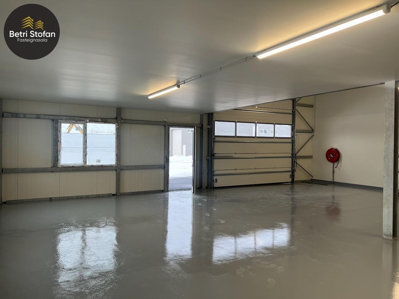 Nánari lýsing: Gólfplata er steinsteypt og vélslípuð, máluð með Epoxy. Niðurfall við innkeyrsluhurð. Burðarvirki er stál, klæðning þaks er steinullar samloku eining, útveggir Pir. Gólfhiti er frá Danfoss, lokað kerfi. Þriggja fasa rafmagn. Led lampar í loftum, gefa góða birtu í vinnusal. WC og skolvaskur er til staðar. Auðvelt að bæta við auka hitablásara eða ofnum, tengingar eru til staðar. Lóð er malbikuð, tvö bílastæði framan við bilið, snjóbræðsla nær 4,0m frá útvegg. Sameiginlegur hiti er fyrir húsið. Byggingaraðili með áratuga reynslu