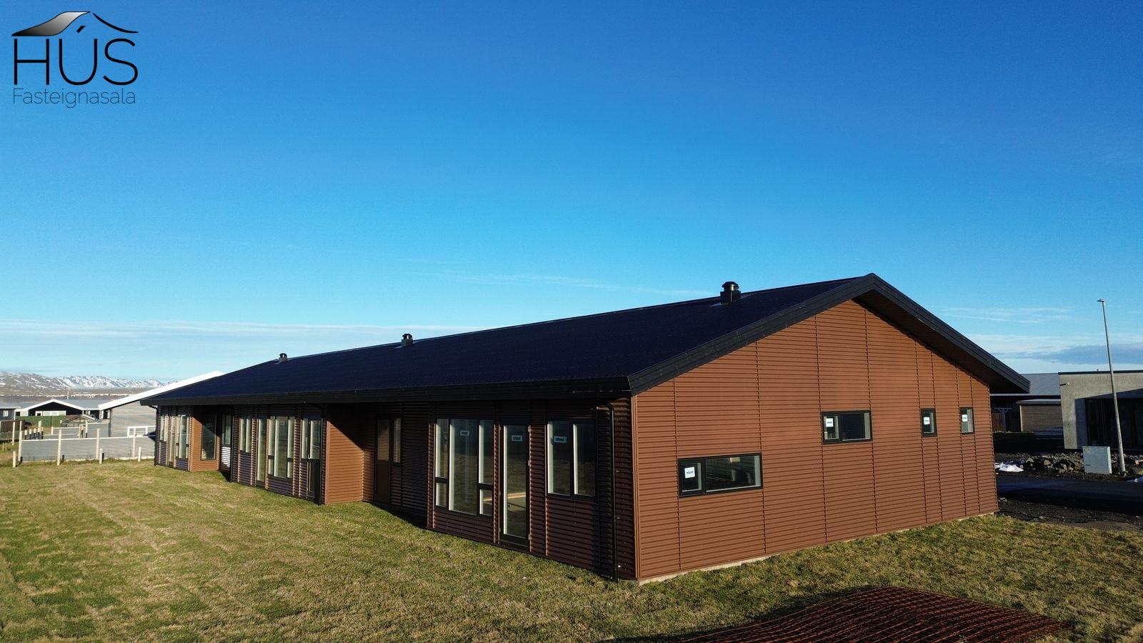 Húsið er byggt úr timbri árið 2025. Að utan er húsið klætt með bronslituðu liggjandi báruáli. Gluggar, hurðir og þakkantur eru svartir. Bárujárn er á þaki. Útihurðir og gluggar eru Rational frá Húsasmiðjunni.