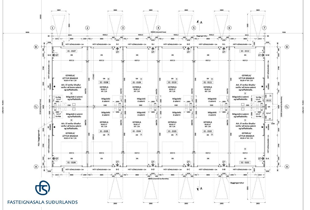 Nánari lýsing:Útveggir / þak / þakkantur / burðarvirki: Allir útveggir og þak hússins eru úr yleiningum, samlokueiningar frá Kingspan. Burðarvirki er límtré. Litur klæðninga að utanverðu er RAL7016 og að innan RAL 9010. Þakkantur er einfaldur, stálklæddur í sama lit og þakefni með utanáliggjandi álrennum og niðurfallsrörum í sama lit.
