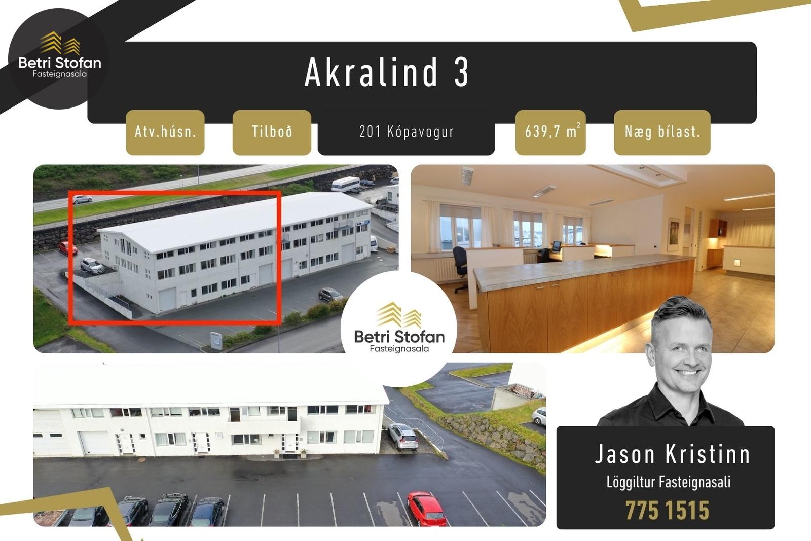 Jason Kristinn fasteignasali, sími 775 1515 og Betri Stofan fasteignasala kynna: Akralind 3, 639,7 fm Skrifstofu og lagerhúsnæði á frábærum stað miðsvæðis á höfuðborgarsvæðinu. Húsnæðið er á þremur hæðum, góð aðkoma beggja vegna og næg bílastæði. Laust strax Nánari lýsing: 1.hæð: Inngangur Akralindar megin Um 300 fm lagerrými með góðri lofthæð, stór innkeyrsluhurð (H=3.10 cm. B=2.67 cm.), salerni og tvær litlar geymslur. Einnig er 35 fm bílskúr/vörumóttaka með stórri innkeyrsluhurð. Bæði rými með sér inngang. Skrifstofa + salur - 2. og 3. hæð: Um 340 fm rými sem skiptist í um 195 fm skrifstofurými á 2.hæð (sér inngangur) sem skiptist í Afgreiðslu/móttöku, opið skrifstofurými (nú 3 vinnustöðvar), tvær lokaðar skrifstofur, fundarherbergi, skjalageymslu, kaffistofu og salerni m/sturtu). Þaðan er svo gengið upp á 3. hæð þar sem er um 145 fm salur sem er í dag nýttur sem veislusalur en hægt að nýta sem opið skrifstofurými. Glæsilegt atvinnuhúsnæði miðsvæðis á höfuðborgarsvæðinu með mikla nýtingarmöguleika. Góð aðkoma og næg bílastæði. Stutt út á stofnbrautir. Húsið er á þremur hæðum en um er að ræða tvö fastanúmer sem seljast saman eða í sitthvoru lagi. Húsnæðið er mjög snyrtilegt með vönduðum innréttingum og innbyggðri lýsingu. Laust við kaupsamning. Nánari lýsing 1.hæð: Um er að ræða um 300 fm lagerrými og vörumóttöku. Aðkoma að 1.hæð er frá bílastæði að neðanverðu eða Akralindar megin. Inngangar eru tveir, á sitthvorum enda rýmisins ásamt stórum fjarstýrðum innkeyrsluhurðum. Öryggiskerfi og járngrindur fyrir gluggum. Innangengt upp á 2.hæð um stiga. Lagerrými er um 244 fm með sérinngangi og innkeyrsluhurð. Inn af lager eru tvær geymslur og snyrting. Vörumóttaka með sérinngangi og innkeyrsluhurð. 2.hæð: Á 2.hæð er flott skrifstofuaðstaða, um 196,7 fm, með sérinngangi að ofanverðu húsinu sem skiptist í anddyri, 2 skrifstofur, 2 vinnusali, fundarherbergi, kaffistofu, 2 snyrtingar, þar af önnur með sturtu og geymslu. Anddyri Gengið er inn af bílastæði að ofanverðu húsinu. Flísar á gólfi. Vinnusalur#1 til vinstri frá anddyri. Innréttað sem verslunarrými með afgreiðsluborði og innbyggðum hillum og góðri lýsingu. Flísar á gólfi. Gengið er upp stiga á 3.hæð frá þessu rými. Vinnusalur #2 Opið skrifstofurými innréttað með góðri aðstöðu fyrir þrjá starfmenn. Flísar á gólfi. Stigi frá þessu rými niður á 1. hæð. Skrifstofa#1 Stór hornskrifstofa með góðu útsýni. Parket á gólfi. Skrifstofa#2 Stór hornskrifstofa sem snýr að bílastæði að ofanverðu húsinu. Parket á gólfi. Fundarherbergi með góðu útsýni. Parket á gólfi. Kaffistofa með eldhúsinnréttingu. Flísar á gólfi. Snyrting #1 með salerni, sturtu og innréttingu ásamt vaski. Flísar á gólfi. Snyrting#2 Inn af anddyri með salerni og vaski. Flísar á gólfi. Geymsla með talnalæsingu, flísar á gólfi. 3.hæð: Gengið er upp stiga úr vinnusal af annarri hæð. Á þriðju hæð er komið í stóran sal með góðri lofthæð og flottu útsýni. Góð eldhúsinnrétting með vaski, teppi á gólfi. Afstúkað fatahengi og geymsla inn af sal. Samtals um 143 fm. Allar nánari upplýsingar veitir Jason Kristinn Ólafsson, sími 7751515, jason@betristofan.is lgfs.