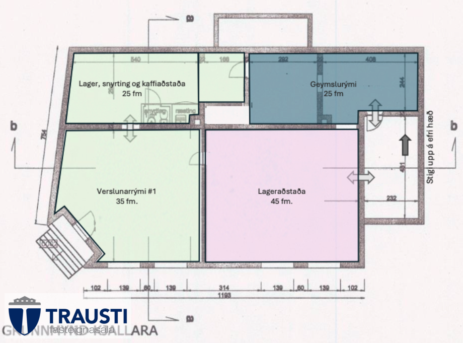 Atvinnurými á jarðhæð og kjallara: Jarðhæð skiptist í 2 góð verslunarrými, kaffistofu, baðherbergi og vinnustofu. Kjallari skiptist í verslunarrými, kaffistofu og baðherbergi, lageraðstöðu og geymslurými. Báðar hæðir eru með góða leigusamninga sem skila góðum tekjum.