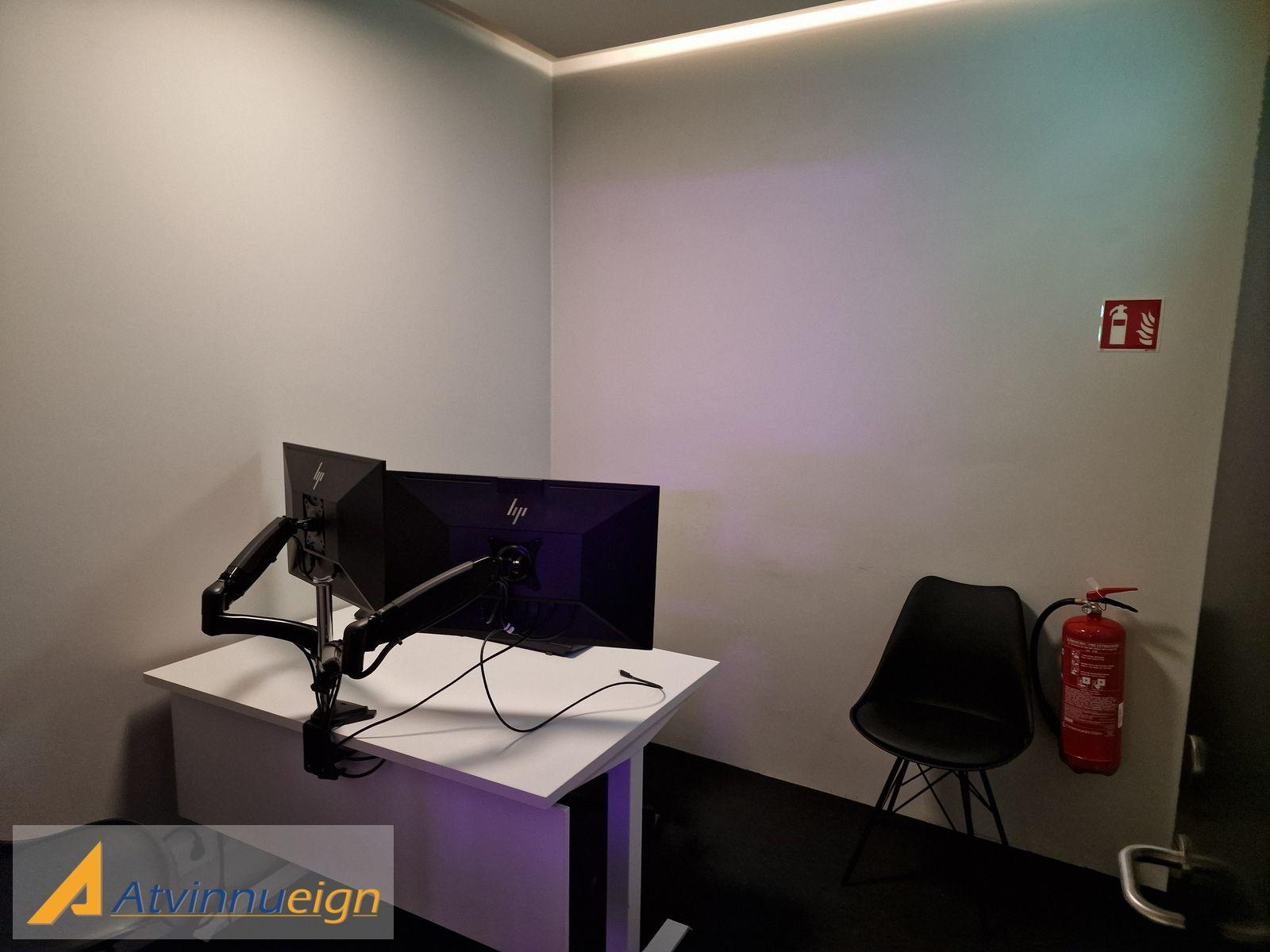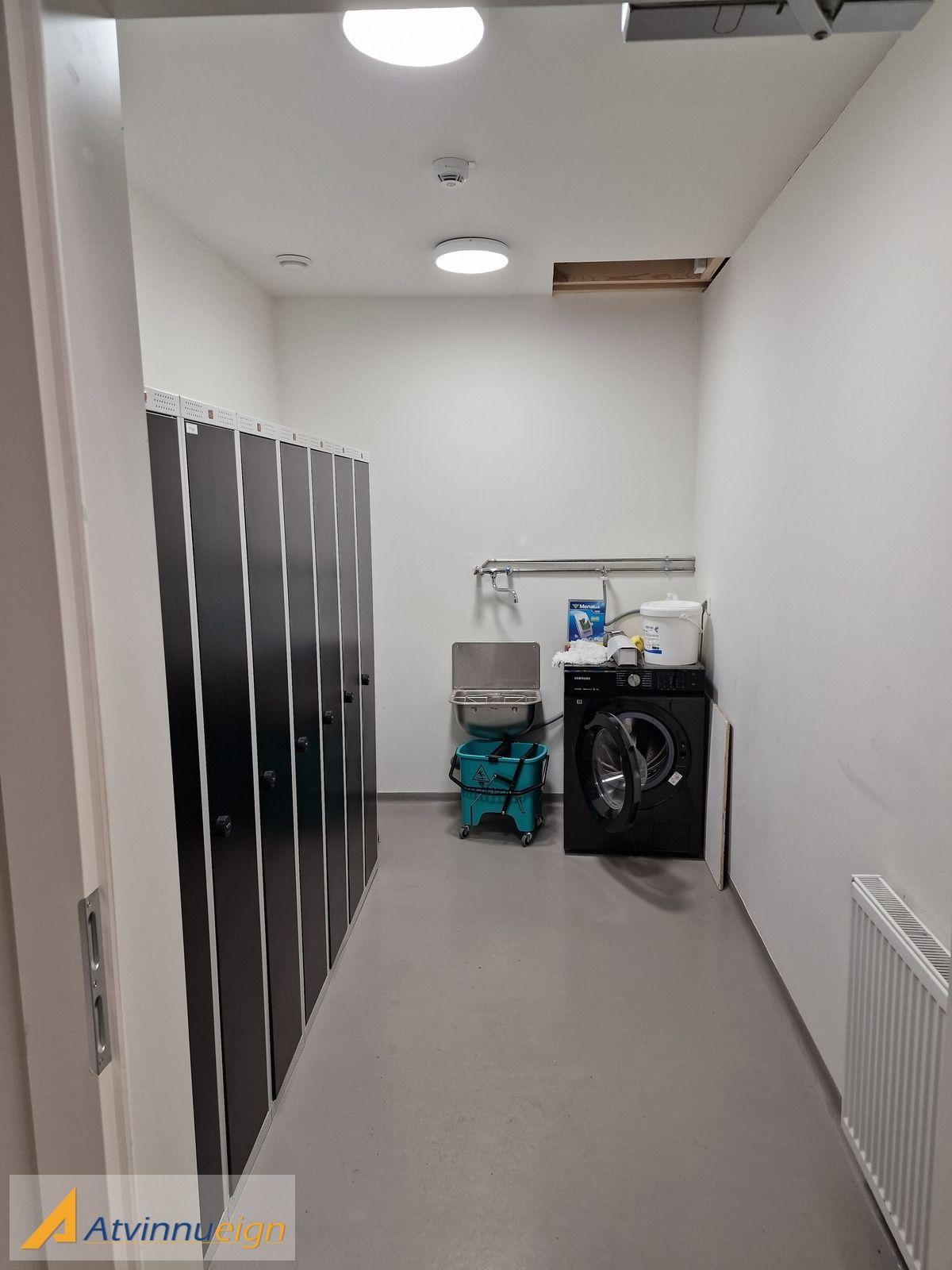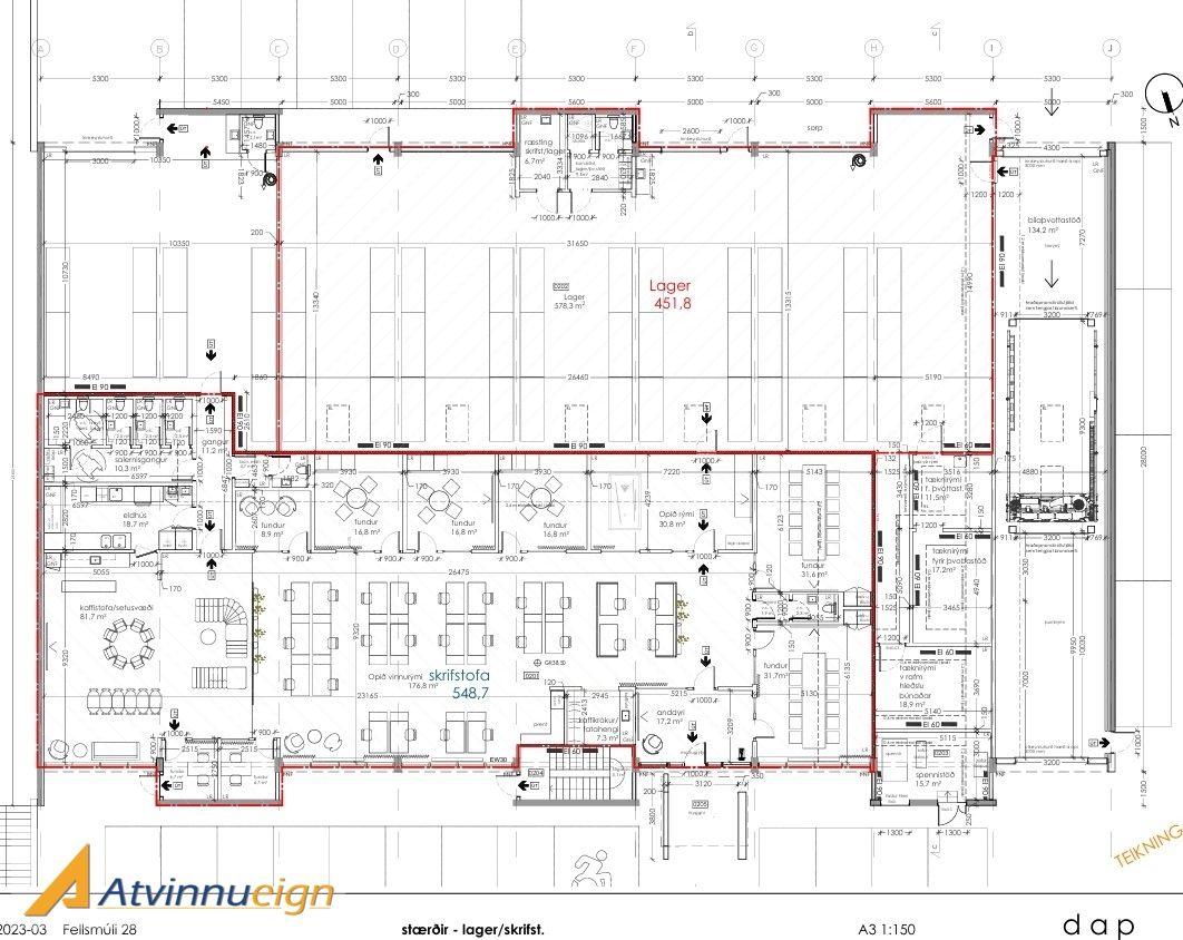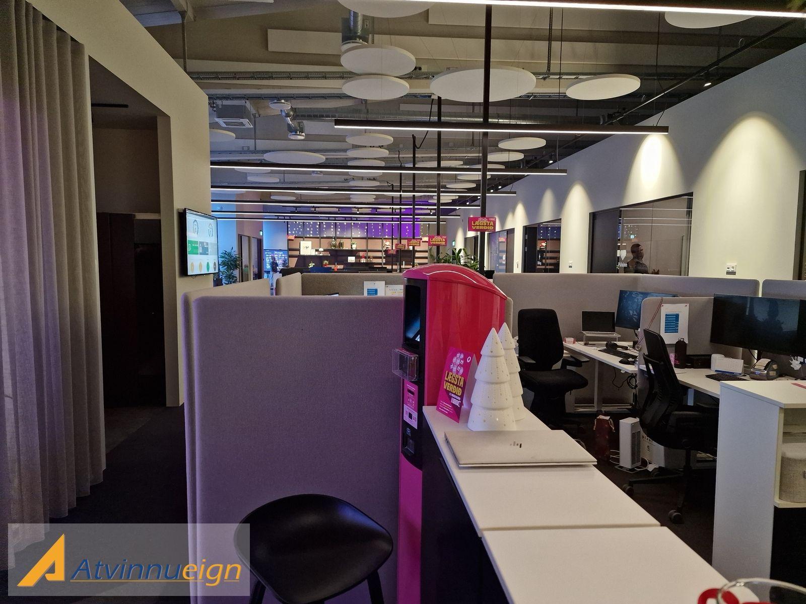 Húsnæðið skiptist í 549 fm skrifstofu- og atvinnuhúsnæði og 452 fm lagerhúsnæði baka til. Rúmgott húsnæði á jarðhæð sem bíður upp á ýmsa möguleika. Í skrifstofuhlutanum eru níu skrifstofu- eða fundarherbergi, opið rými, kaffiaðstaða með iðnaðareldhúsi og nokkur salerni. Í lagerhlutanum er innkeyrsluhurð, gott lagerrými, lítil skrifstofuaðstaða, salerni með sturtum. Góð lofthæð og næg bílastæði eru til staðar. Afhending eftir samkomulagi. VSK bætist við leiguverð.