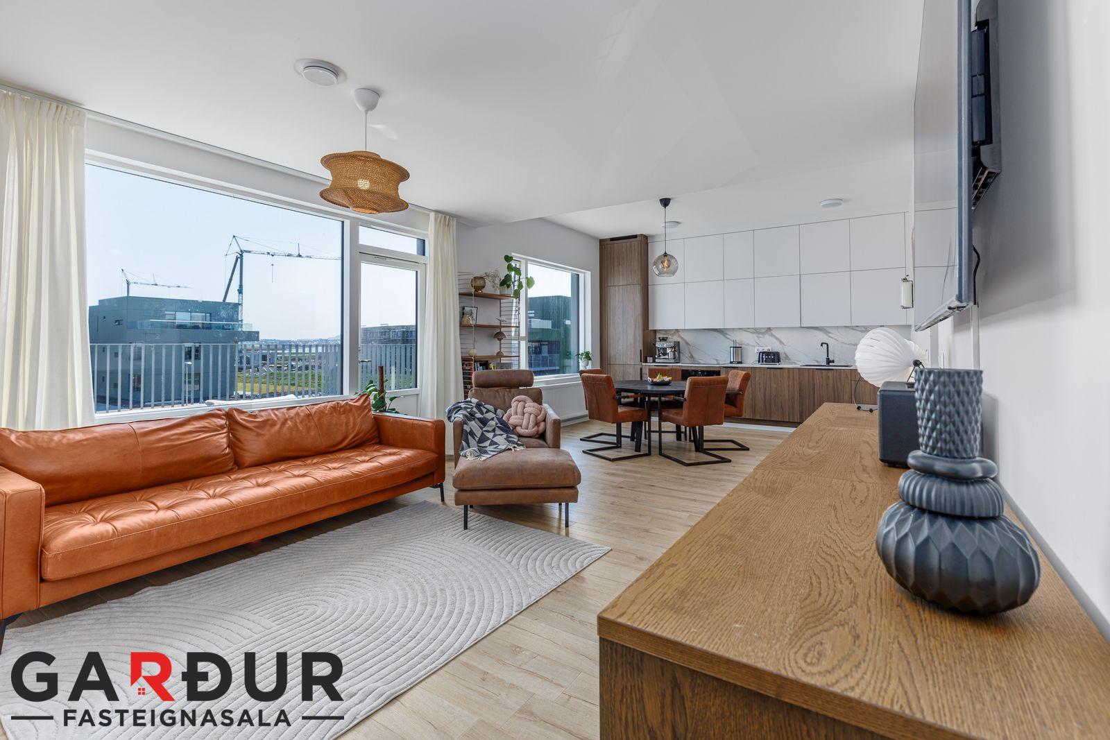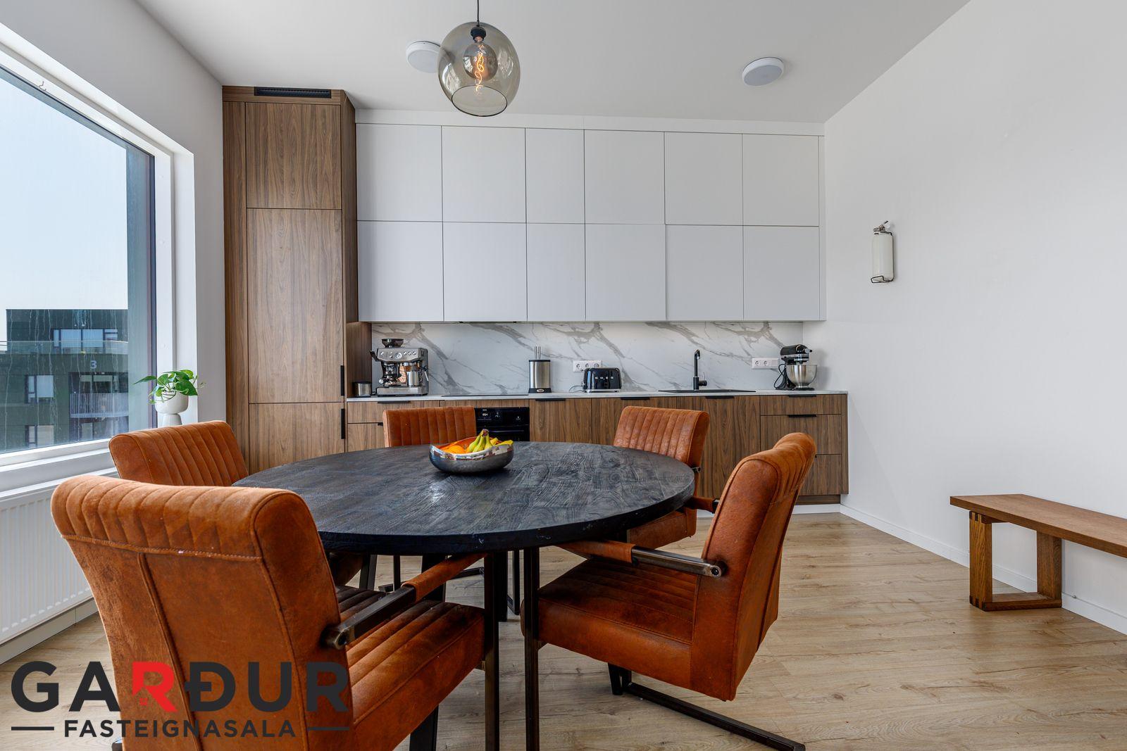 Almennt um íbúðirnar frá byggingarlýsingu: Allar innréttingar að undanskildum innréttingum á baðherbergjum eru sér smíðaðar, framleiddar og uppsettar af Voké III. Eldhús og fataskápar ná upp í loft. Borðplata er vönduð 19 mm. ljós með marmaraútliti. Vaskur og blöndunartæki eru svört og höldur á neðri skápum svartar. Eldhúsinnréttingunum fylgir innbyggður ísskápur með frystir, svartur ofn, innbyggð uppþvottavél og kolasíu vifta. Eldhústæki eru af tegundinni AEG, Electrolux eða sambærilegt en viftan af gerðinni Elica Lane. Baðherbergi eru flísalögð og þvottahús þar sem við á en að öðru leyti eru íbúðirnar afhentar án gólfefna. Baðherbergi eru flest frá Boxen og koma forsmíðuð að fullu frá verksmiðju og hífð inn í hús samhliða uppsteypu. Búnaður er af vandaðri gerð og allur frágangur til fyrirmyndar. Hvítar innréttingar. Tæki og salerni frá Grohe. Innihurðir eru hvítar yfirfelldar hurðir frá Parka eða sambærilegt. Útidyr eru tré frá Swedoor, söluaðili Húsasmiðjan ehf. Sér þvottahús eru í flestum íbúðum, þá flísalögð með sömu gólfflísum og eru á baðherbergjunum.