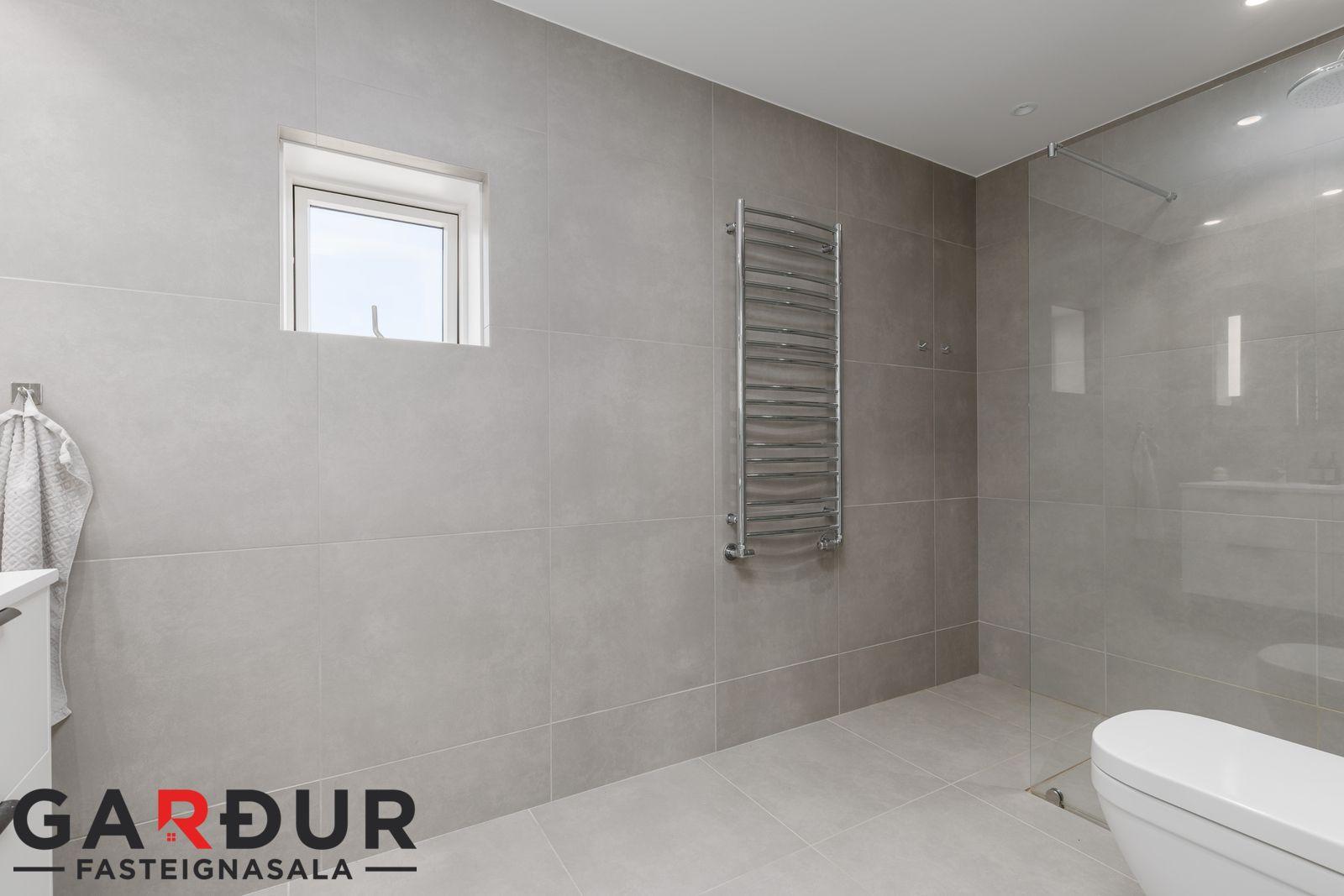 Baðherbergi flísalagt í hólf og gólf, rúmgóð sturta, upphengt salerni og handklæðaofn.