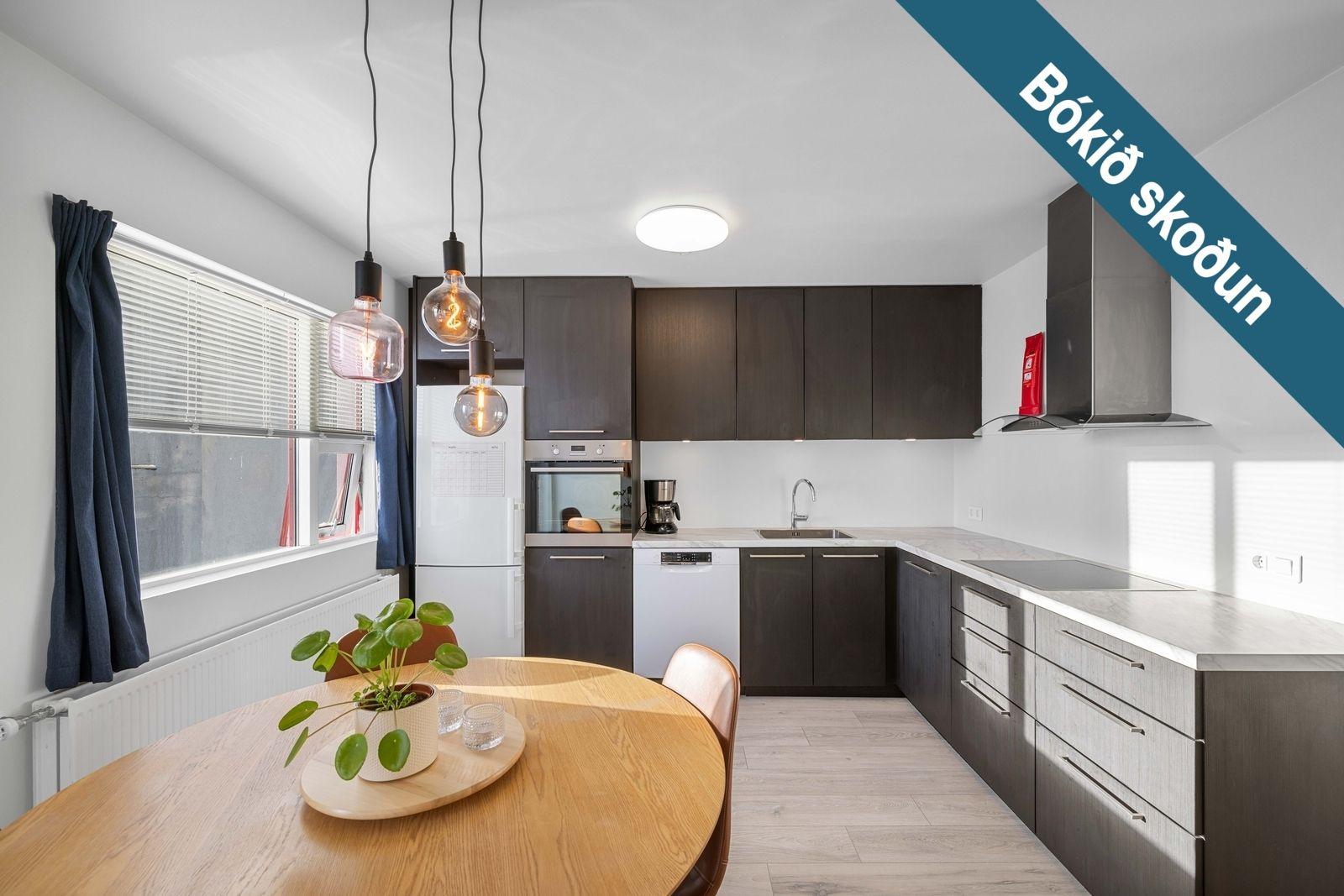 Eldhús: Parket á gólfi, Nýleg, smekkleg svarbrún innrétting með innbyggðri uppþvottarvél. Gert er ráð fyrir einföldum ísskáp í innréttingu. Útgengt er á svalir úr eldhúsi.