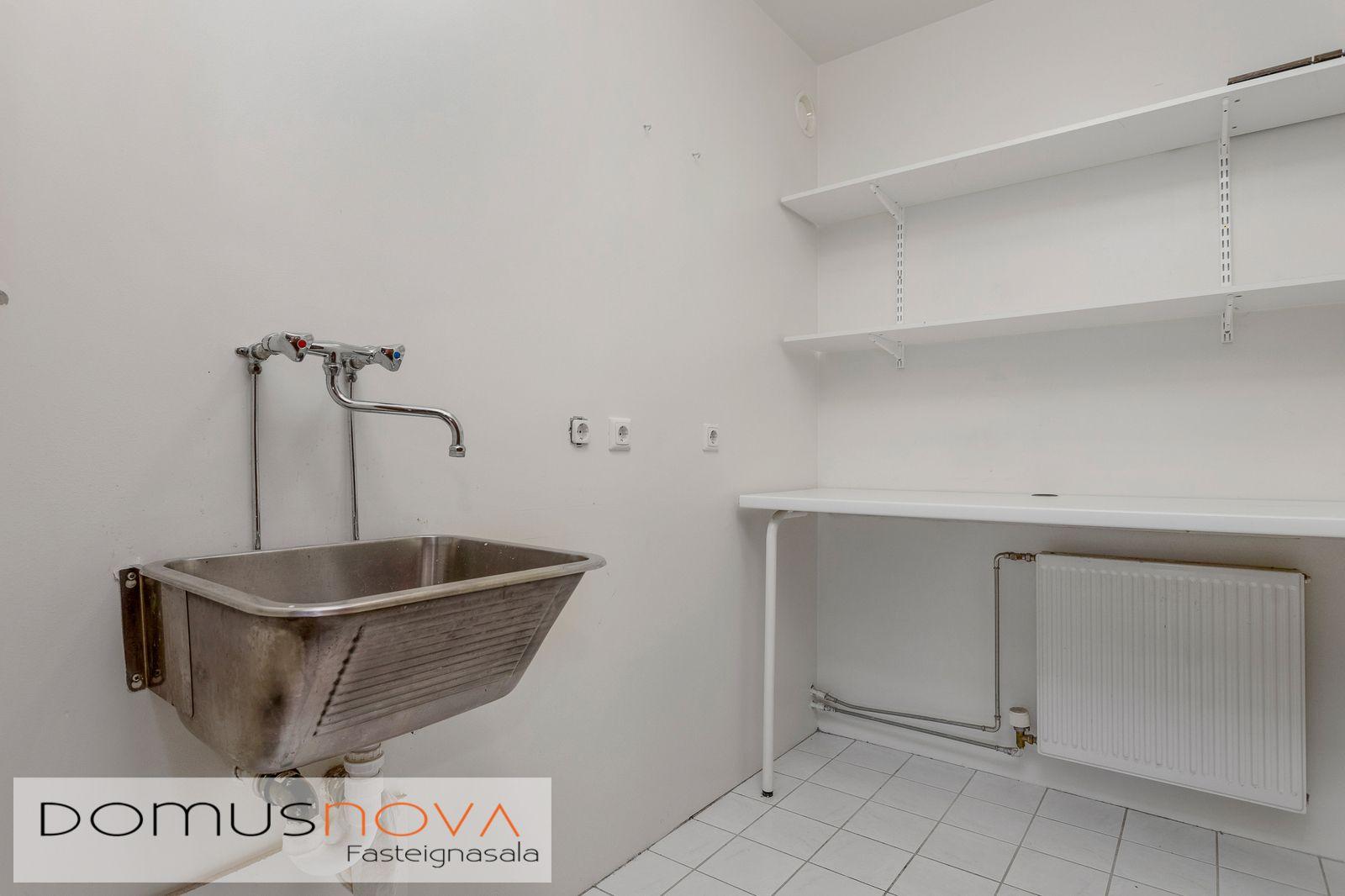 Þvottahús: Er innan íbúðar með tengi fyrir þvottavél og þurrkara. Skolvaskur, ljósar hillur og ljósar flísar á gólfi.