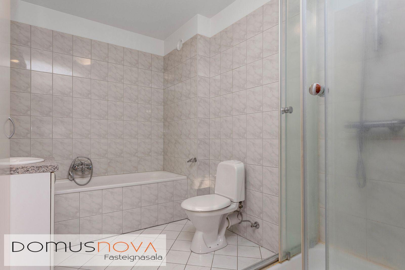 Baðherbergi: Ljós innrétting, baðkar, sturta og salerni. Ljósar flísar á gólfi og veggjum,