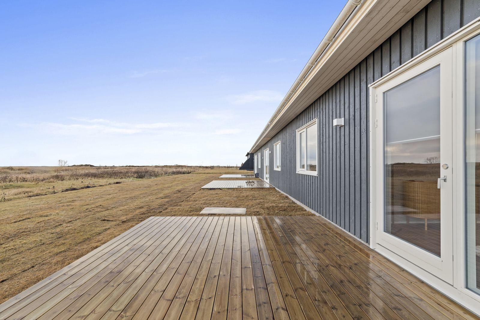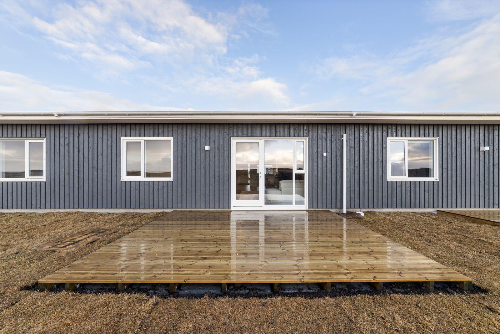 Húsin skilast með malbikuðu bílaplani. Upphituðum stéttum, ruslaskýlum og timburverönd bakatil.
