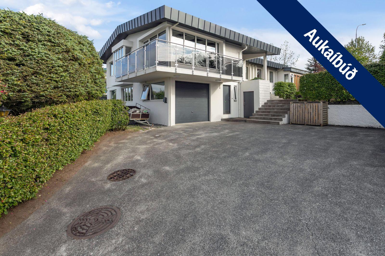 Endahús ofan við götu með einstöku útsýni yfir Elliðaárdalinn, Esjuna og til sjávar.
