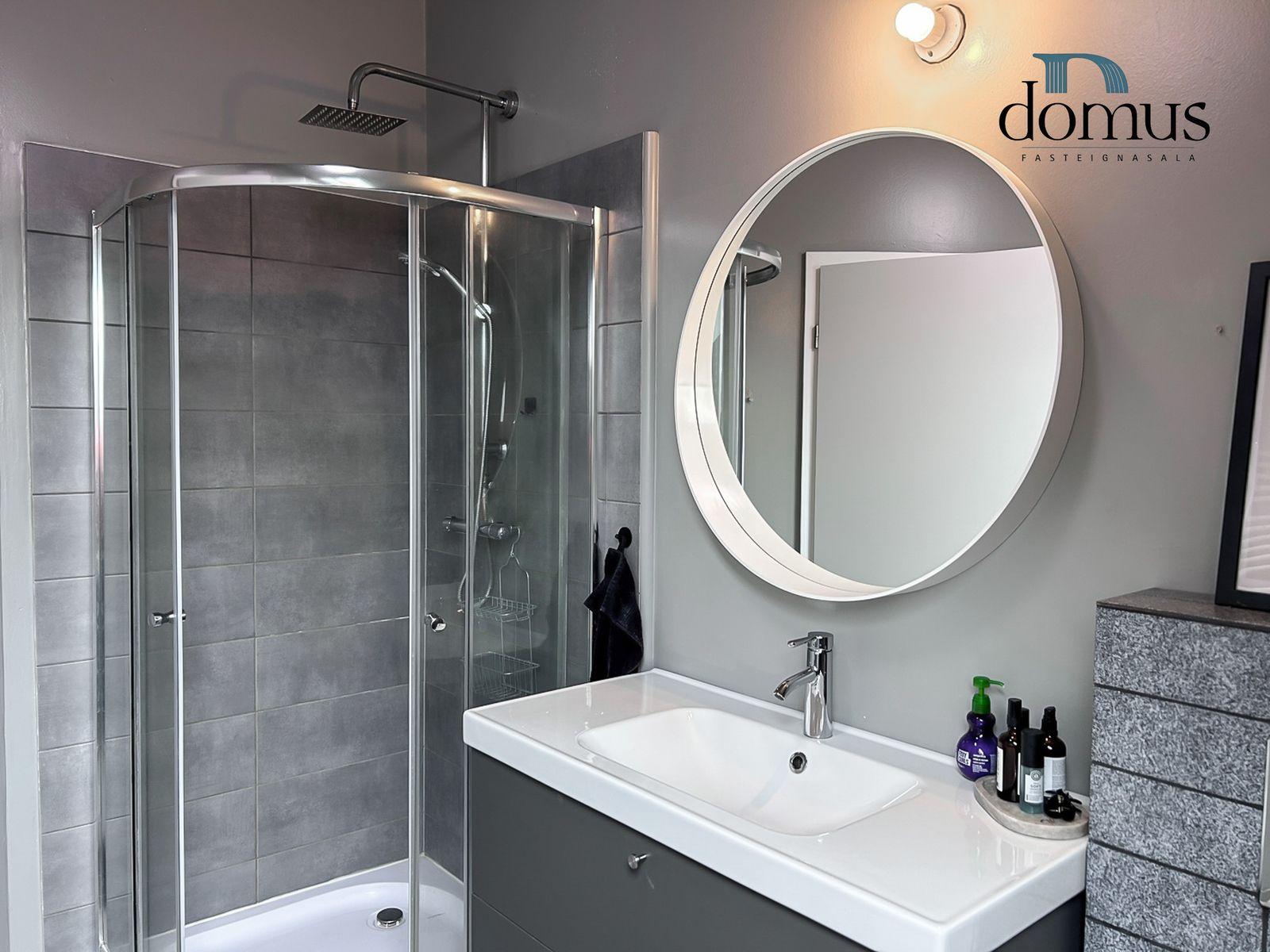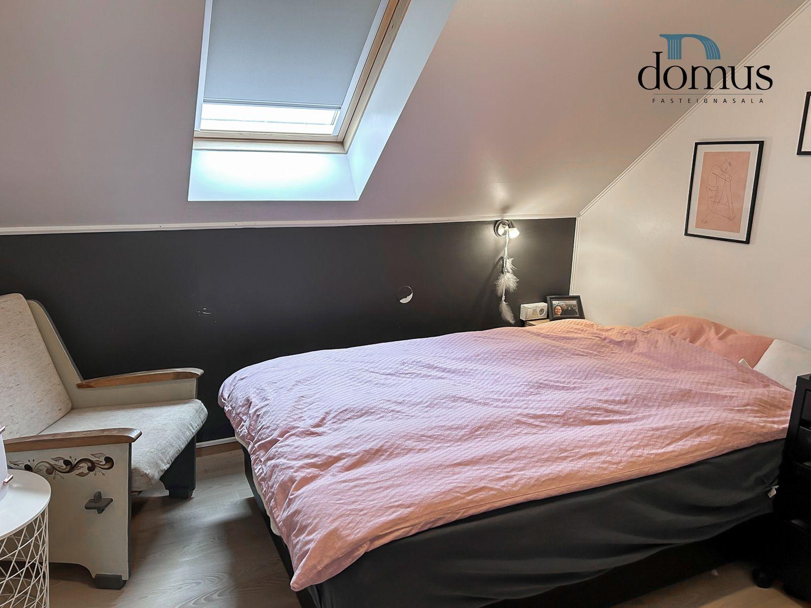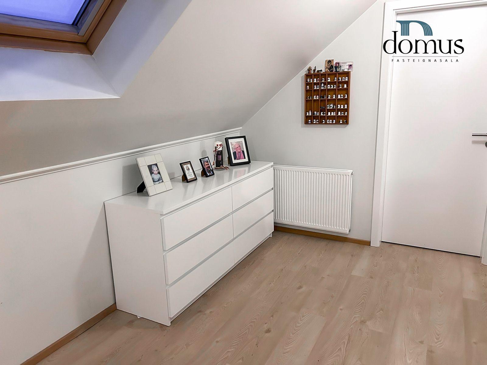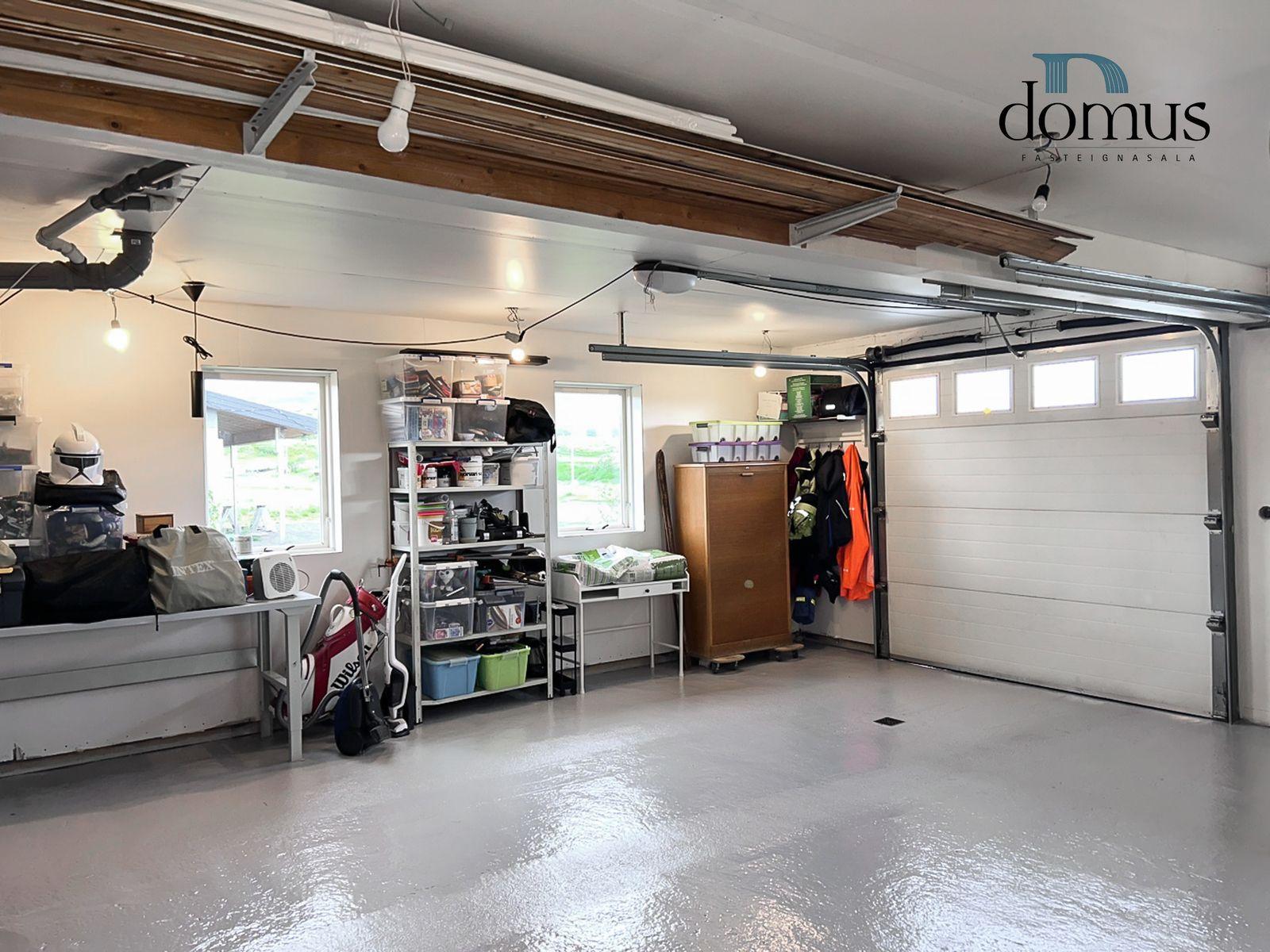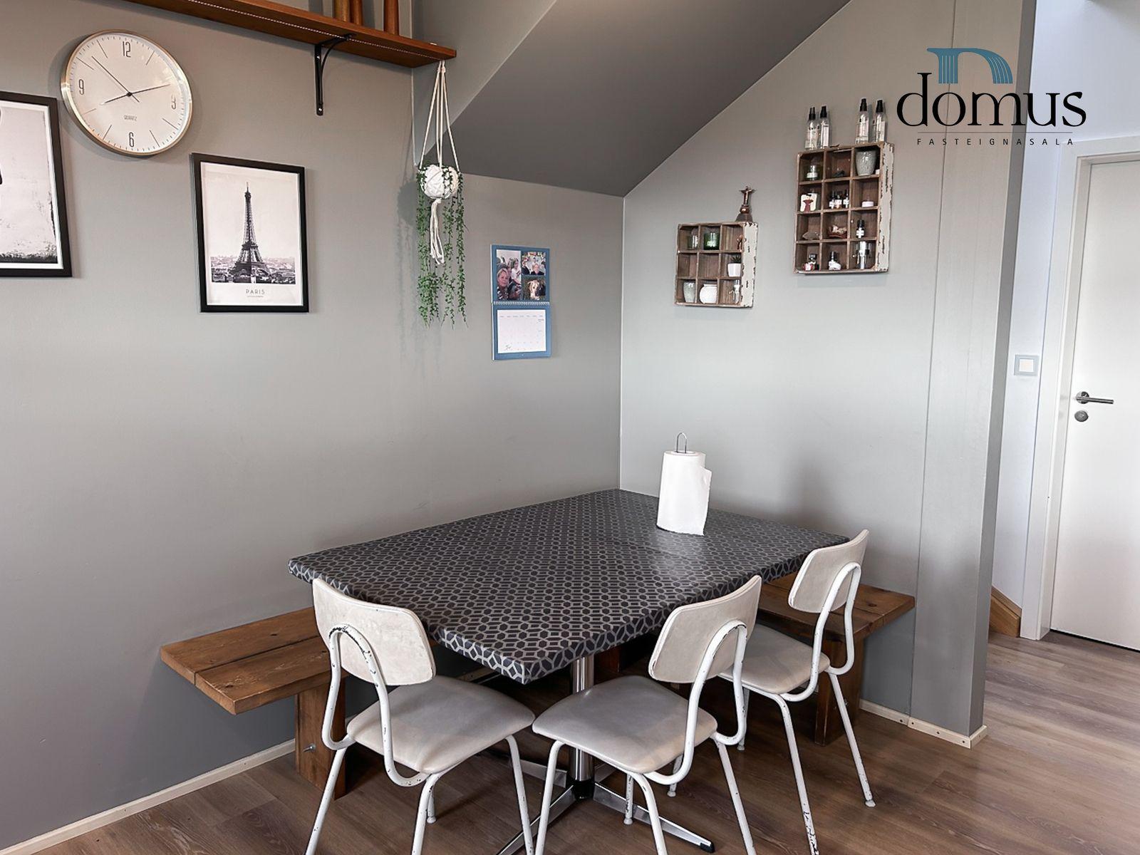Nánari lýsing: Baðherbergi á neðri hæð er með baðkari og er 8,2 fm að stærð. Flísar eru á gólfi og klósettkassi með náttúrusteini. Hornbaðkar. Baðherbergi á efri hæð er með sturtu og er 5,7 fm. Flísar eru á gólfi, bakhlið sturtuklefa og klósettkassa. 90 cm sturtuklefi Hjónaherbergi er um 19 fm með útgengi á svalir. Svalir eru tilbúnar en á eftir að hengja upp. Var verið að bíða eftir endanlegum frágangi lóðar undir svölum. Parket er á gólfi og stór skápur er á gangi uppi sem þjónar öllum herbergjum. Barnaherbergi með velux þakglugga og er um 11 fm og parket er á gólfi. Endaherbergi með glugga út á framhlið húss er 10.4 fm og parketi á gólfi. Endaherbergi með glugga út á framhlið húss er 10,4 fm og parketi á gólfi Þvottahús er á neðri hæð inn af eldhúsi. Þar er hurð út í bakgarð. Gólf er lakkað. Stofa á neðri hæð er 39,3 fm og með parketi á gólfi. Á öllum úthliðum eru 2m gluggar auk þess sem tvöföld hurð er að sólpalli. Stofa á efri hæð er 26,6 fm með parketi á gólfi. Í þeirri stofu er tveir velux þakgluggar. Stór fataskápur er í stofunni. Geymsla er undir stiga milli hæða Eldhús er um 23 fm með innréttingu frá IKEA. Eyja með helluborði er í miðju eldhúsi og borðplata er sérsmíðuð. Innrétting gerir ráð fyrir tvöföldum ísskáp en uppþvottavél og bakaraofn eru 60 cm. Parket er á gólfi.