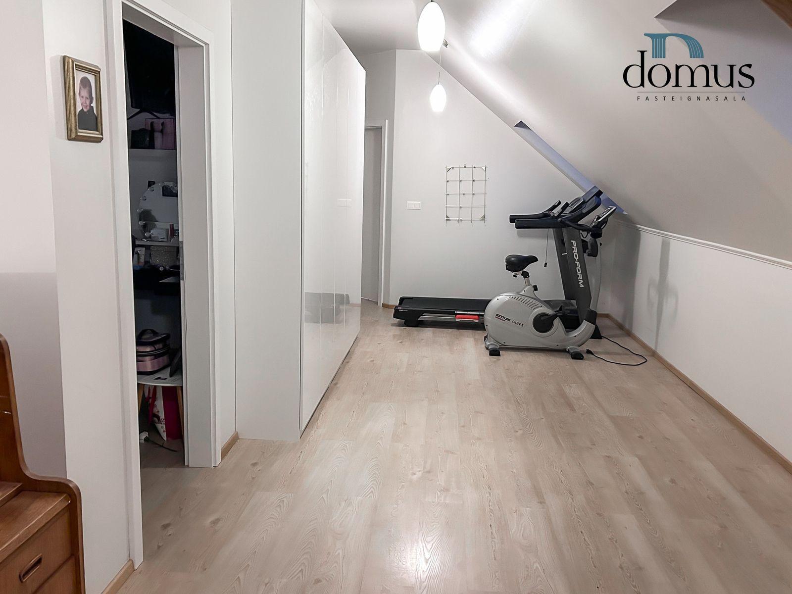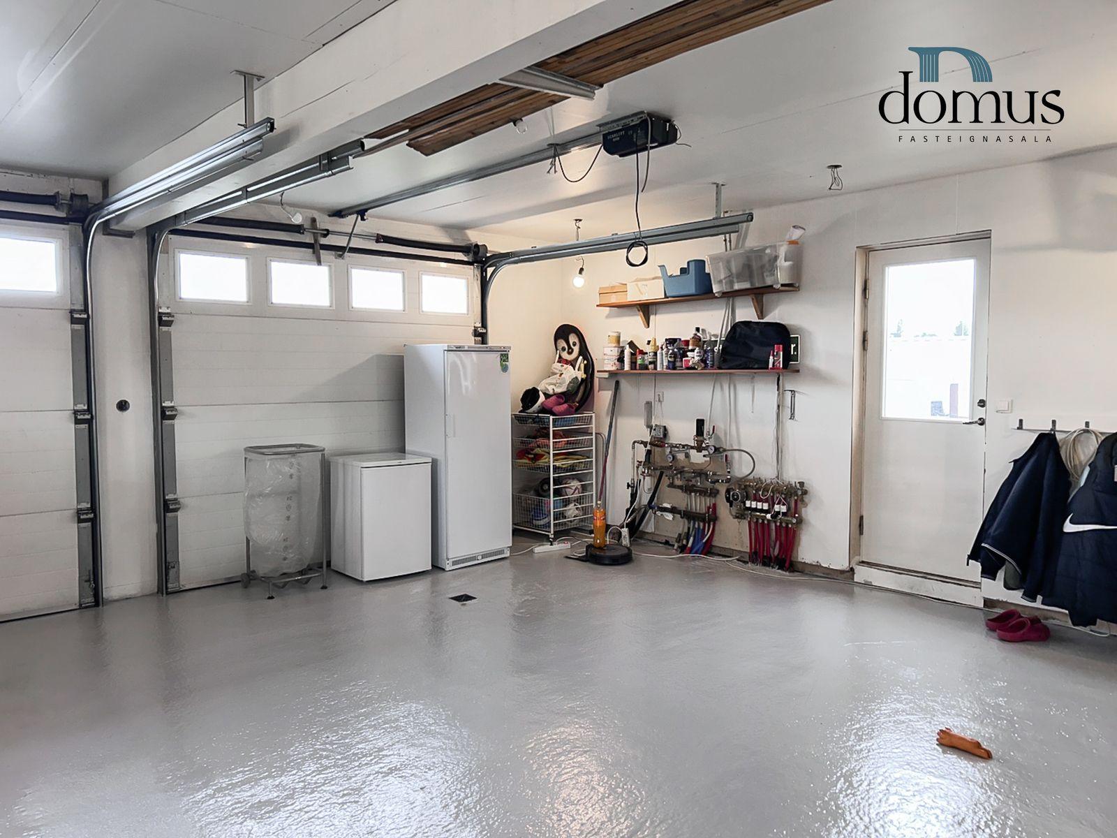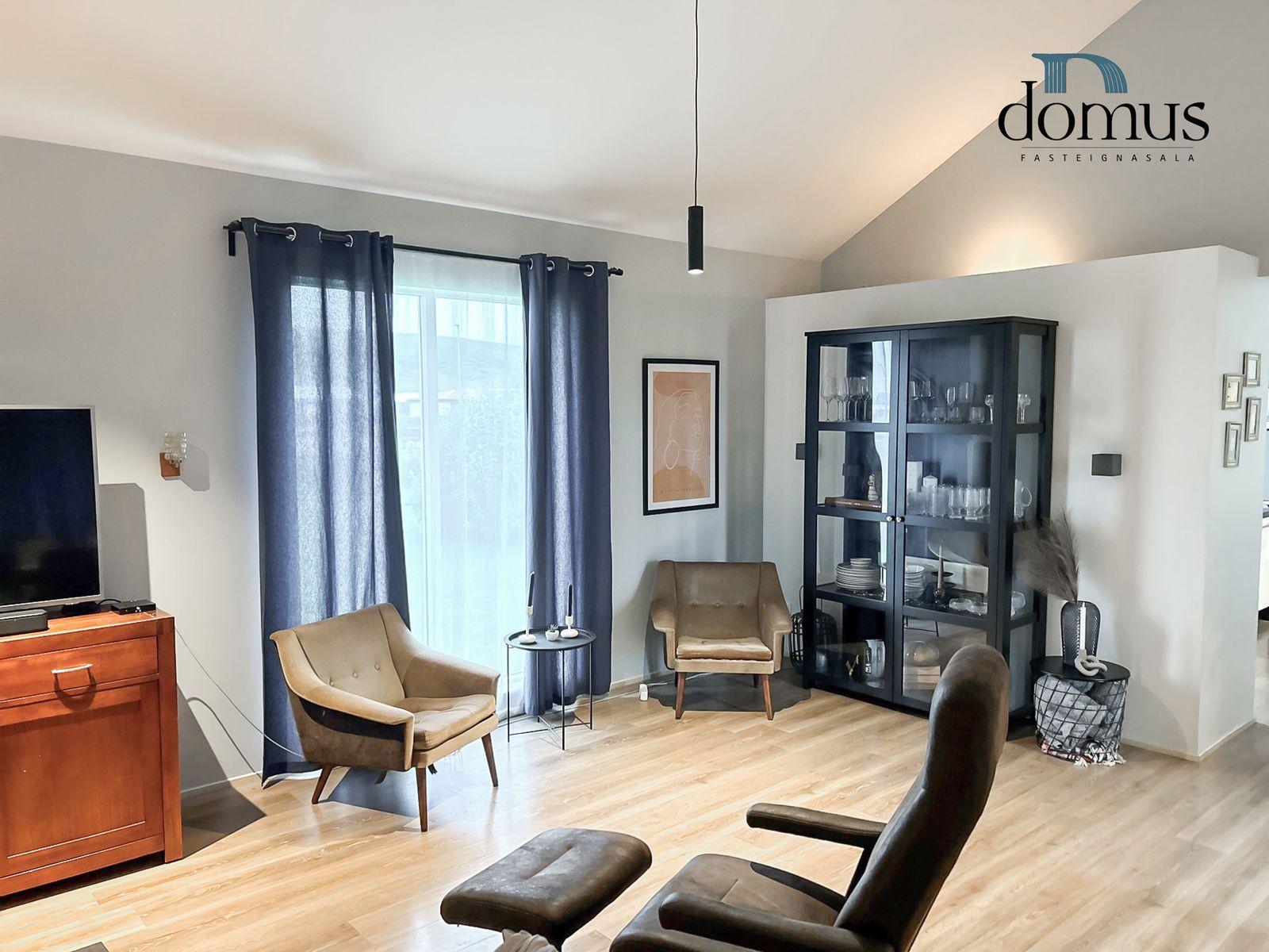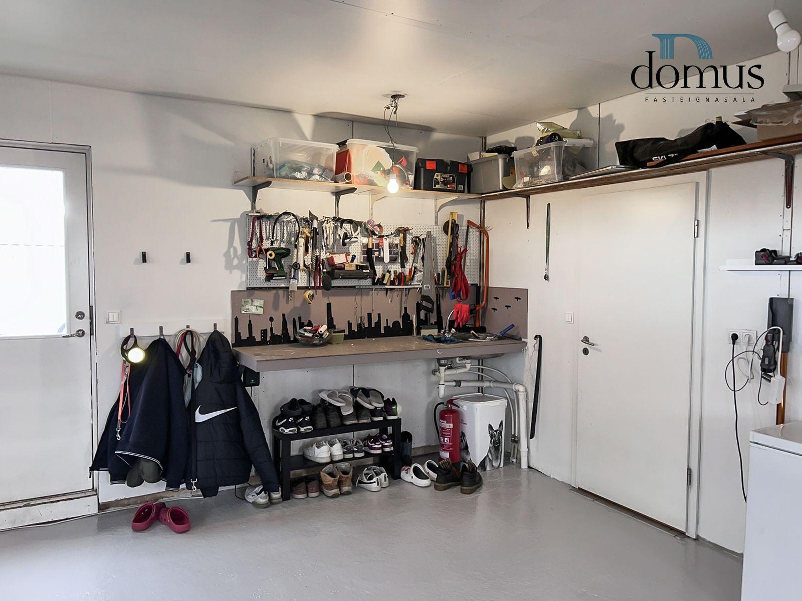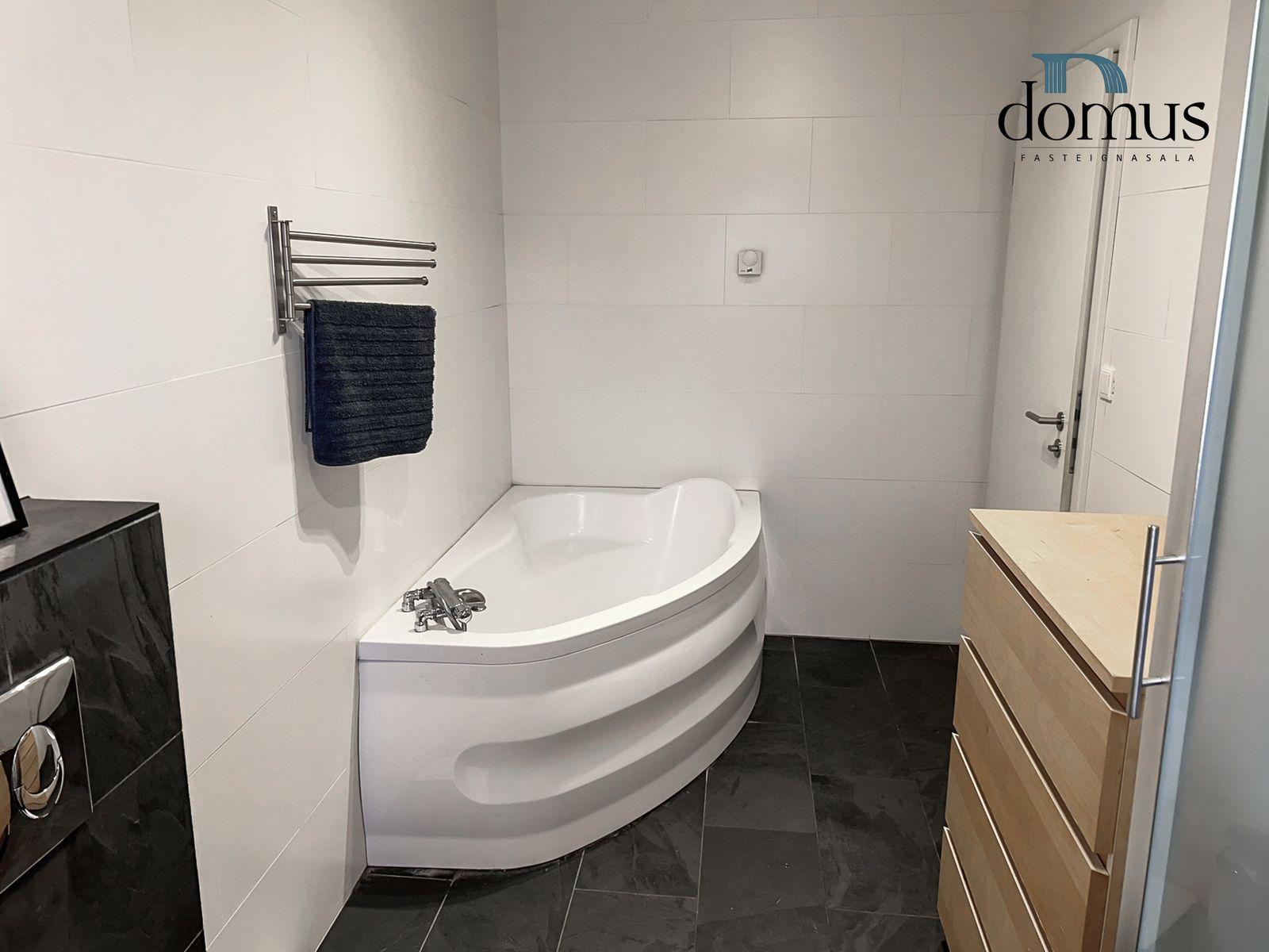Nánari lýsing: Baðherbergi á neðri hæð er með baðkari og er 8,2 fm að stærð. Flísar eru á gólfi og klósettkassi með náttúrusteini. Hornbaðkar. Baðherbergi á efri hæð er með sturtu og er 5,7 fm. Flísar eru á gólfi, bakhlið sturtuklefa og klósettkassa. 90 cm sturtuklefi Hjónaherbergi er um 19 fm með útgengi á svalir. Svalir eru tilbúnar en á eftir að hengja upp. Var verið að bíða eftir endanlegum frágangi lóðar undir svölum. Parket er á gólfi og stór skápur er á gangi uppi sem þjónar öllum herbergjum. Barnaherbergi með velux þakglugga og er um 11 fm og parket er á gólfi. Endaherbergi með glugga út á framhlið húss er 10.4 fm og parketi á gólfi. Endaherbergi með glugga út á framhlið húss er 10,4 fm og parketi á gólfi Þvottahús er á neðri hæð inn af eldhúsi. Þar er hurð út í bakgarð. Gólf er lakkað. Stofa á neðri hæð er 39,3 fm og með parketi á gólfi. Á öllum úthliðum eru 2m gluggar auk þess sem tvöföld hurð er að sólpalli. Stofa á efri hæð er 26,6 fm með parketi á gólfi. Í þeirri stofu er tveir velux þakgluggar. Stór fataskápur er í stofunni. Geymsla er undir stiga milli hæða Eldhús er um 23 fm með innréttingu frá IKEA. Eyja með helluborði er í miðju eldhúsi og borðplata er sérsmíðuð. Innrétting gerir ráð fyrir tvöföldum ísskáp en uppþvottavél og bakaraofn eru 60 cm. Parket er á gólfi.