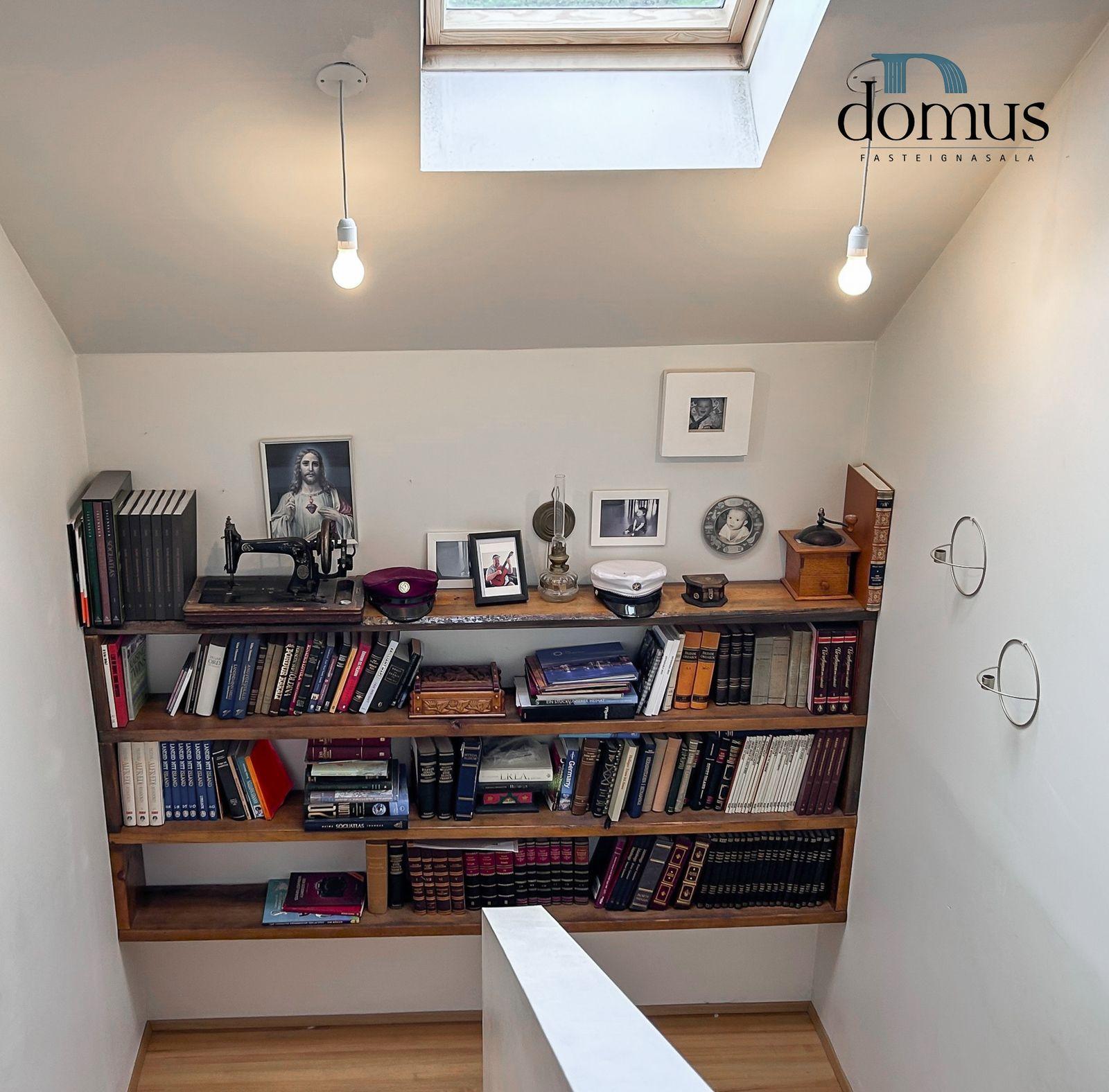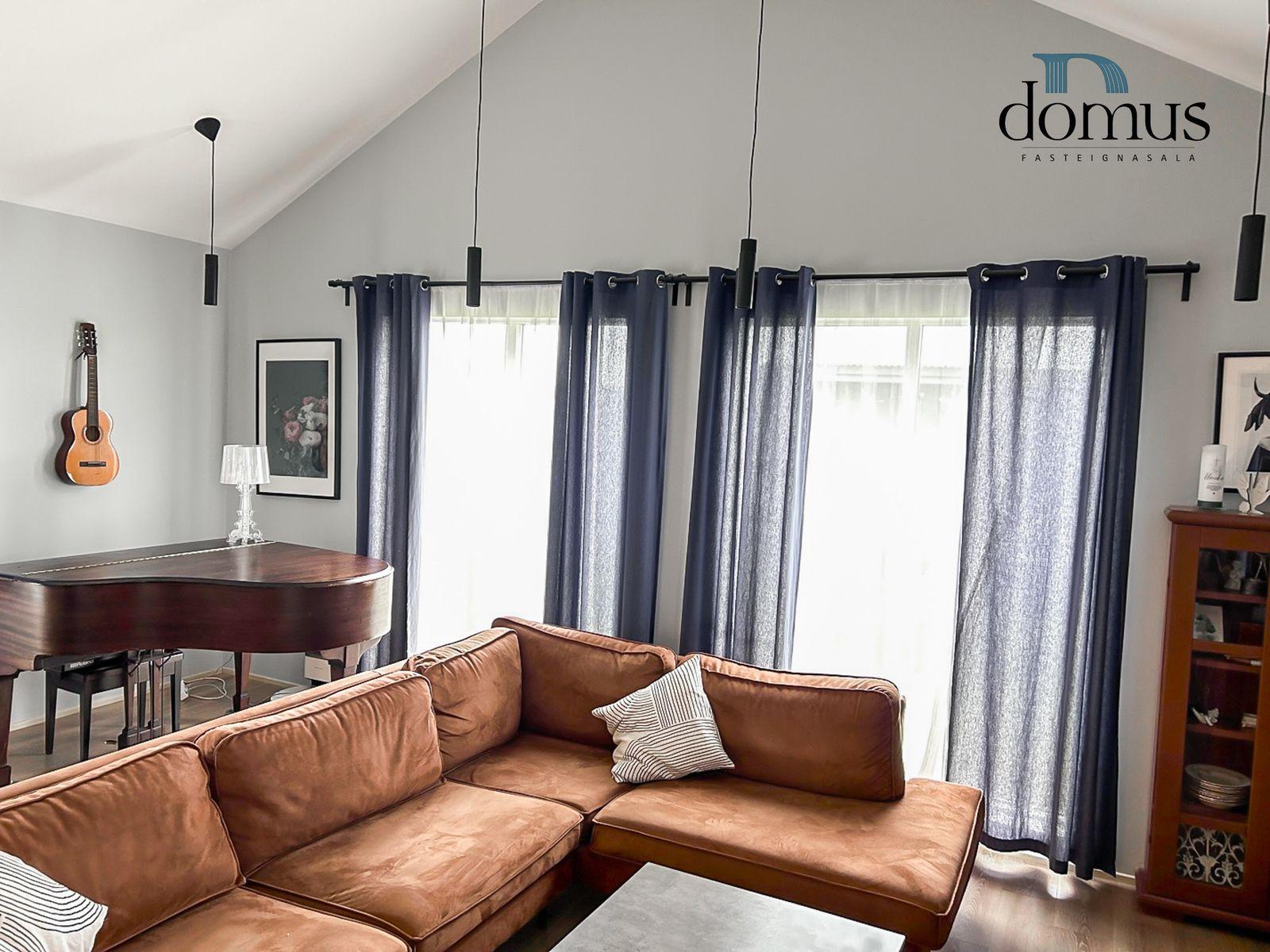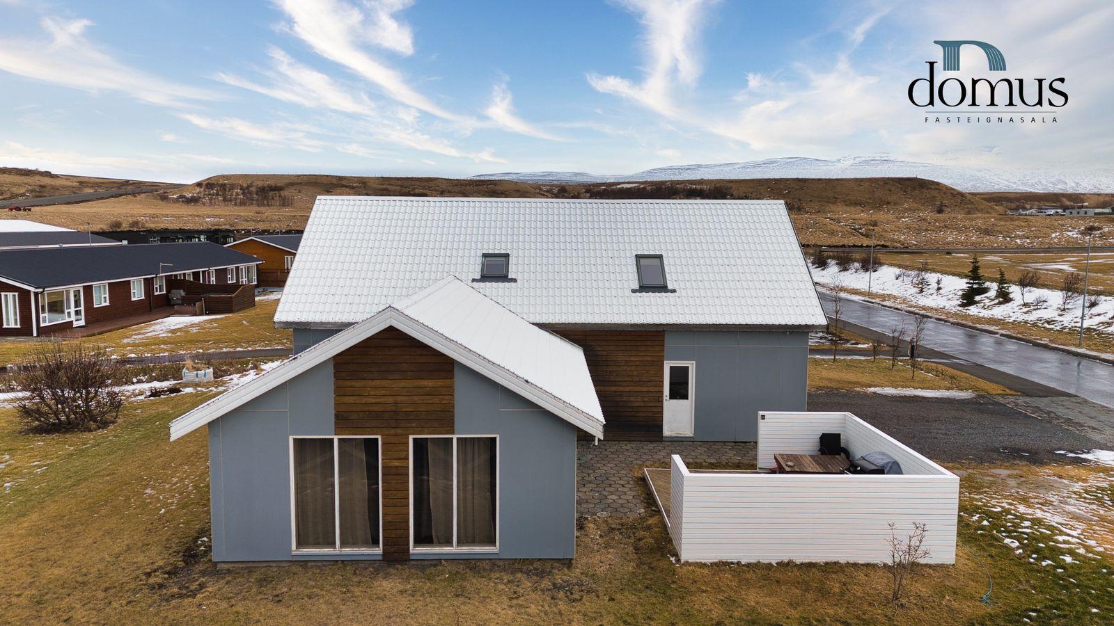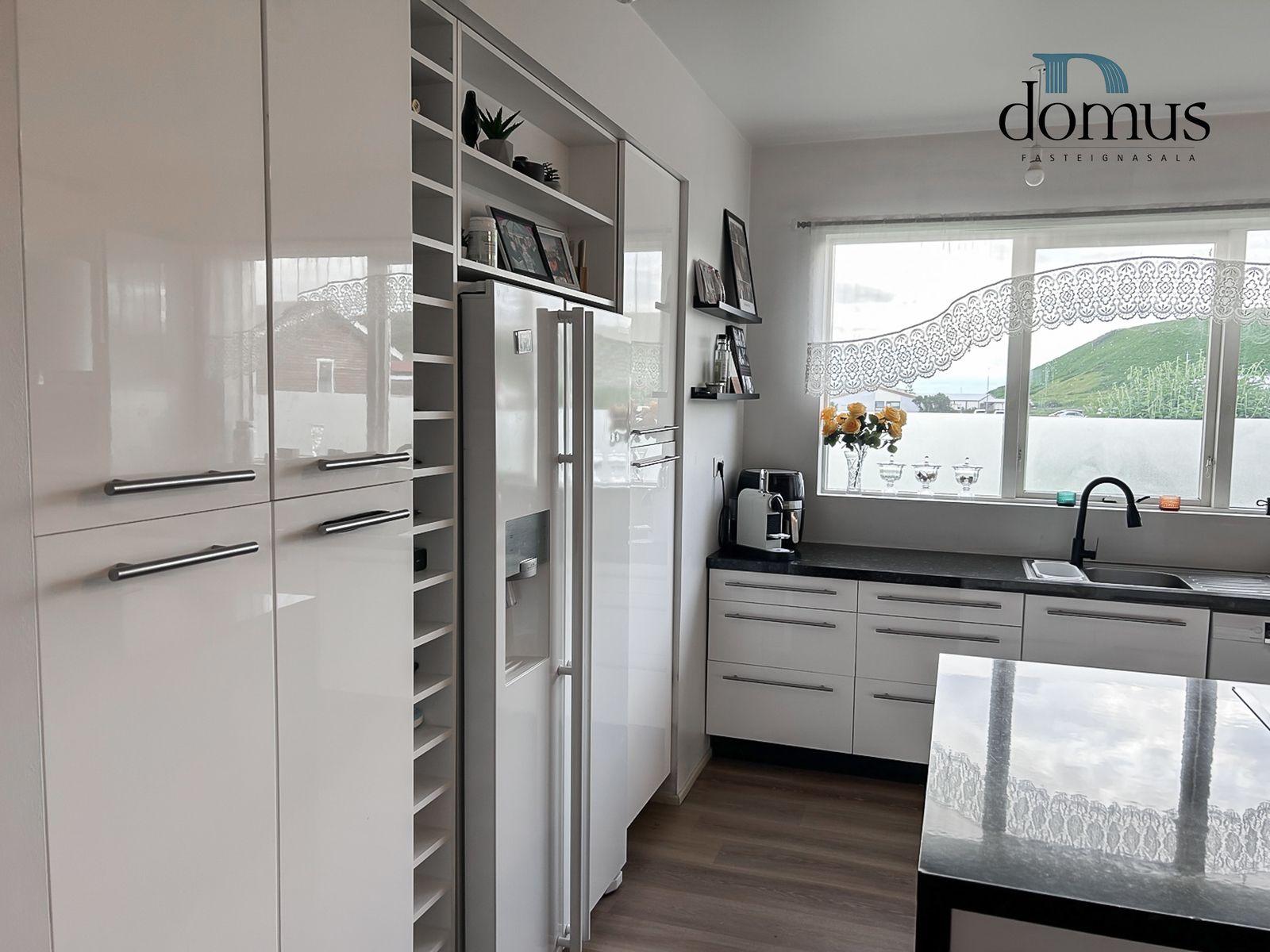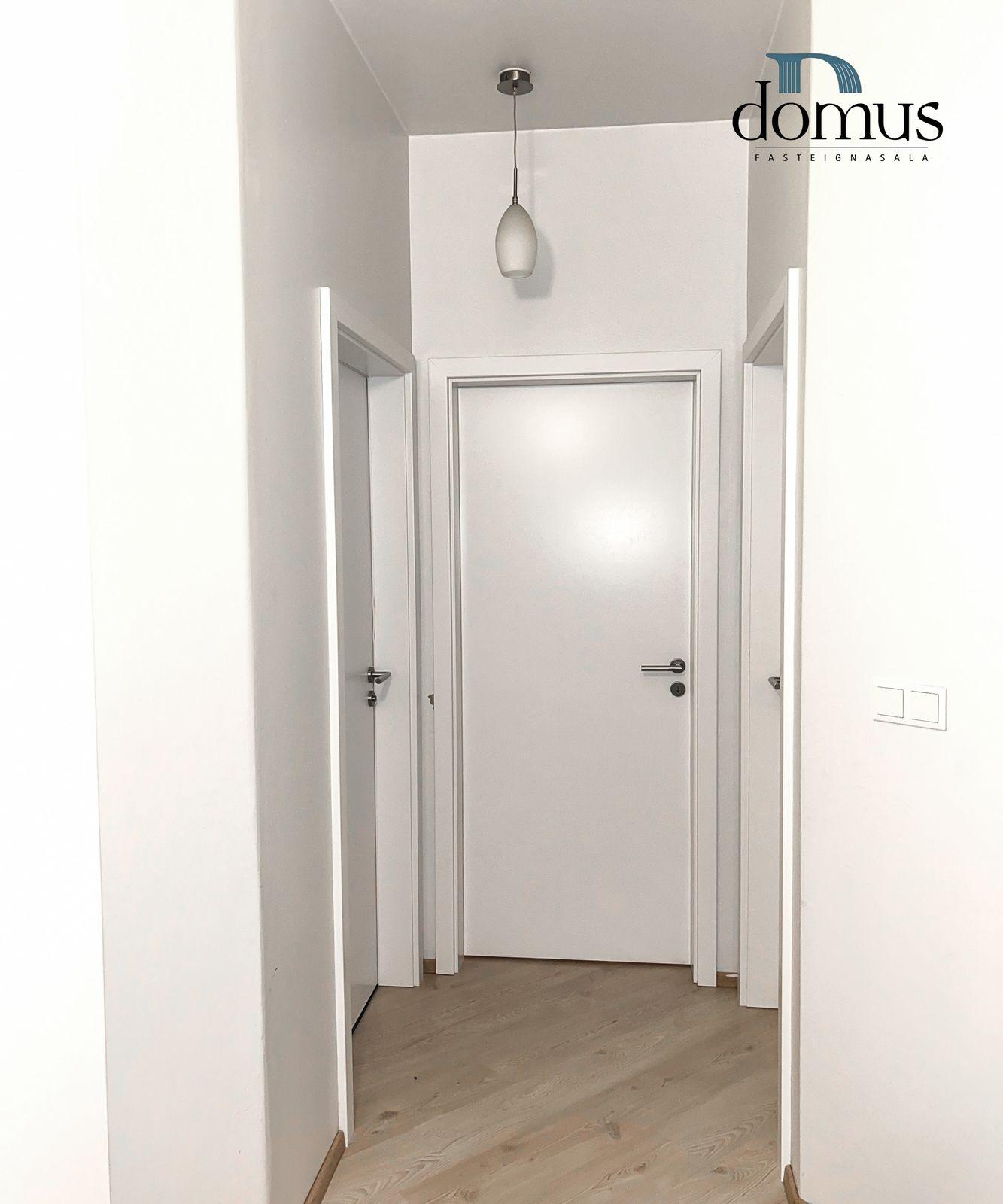 Nánari lýsing: Baðherbergi á neðri hæð er með baðkari og er 8,2 fm að stærð. Flísar eru á gólfi og klósettkassi með náttúrusteini. Hornbaðkar. Baðherbergi á efri hæð er með sturtu og er 5,7 fm. Flísar eru á gólfi, bakhlið sturtuklefa og klósettkassa. 90 cm sturtuklefi Hjónaherbergi er um 19 fm með útgengi á svalir. Svalir eru tilbúnar en á eftir að hengja upp. Var verið að bíða eftir endanlegum frágangi lóðar undir svölum. Parket er á gólfi og stór skápur er á gangi uppi sem þjónar öllum herbergjum. Barnaherbergi með velux þakglugga og er um 11 fm og parket er á gólfi. Endaherbergi með glugga út á framhlið húss er 10.4 fm og parketi á gólfi. Endaherbergi með glugga út á framhlið húss er 10,4 fm og parketi á gólfi Þvottahús er á neðri hæð inn af eldhúsi. Þar er hurð út í bakgarð. Gólf er lakkað. Stofa á neðri hæð er 39,3 fm og með parketi á gólfi. Á öllum úthliðum eru 2m gluggar auk þess sem tvöföld hurð er að sólpalli. Stofa á efri hæð er 26,6 fm með parketi á gólfi. Í þeirri stofu er tveir velux þakgluggar. Stór fataskápur er í stofunni. Geymsla er undir stiga milli hæða Eldhús er um 23 fm með innréttingu frá IKEA. Eyja með helluborði er í miðju eldhúsi og borðplata er sérsmíðuð. Innrétting gerir ráð fyrir tvöföldum ísskáp en uppþvottavél og bakaraofn eru 60 cm. Parket er á gólfi.