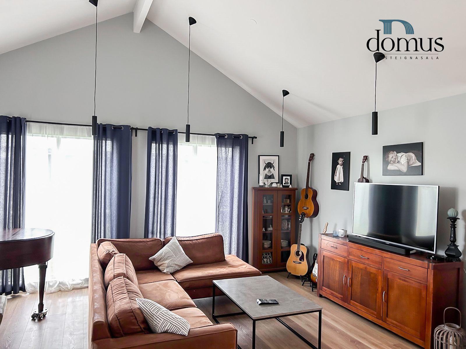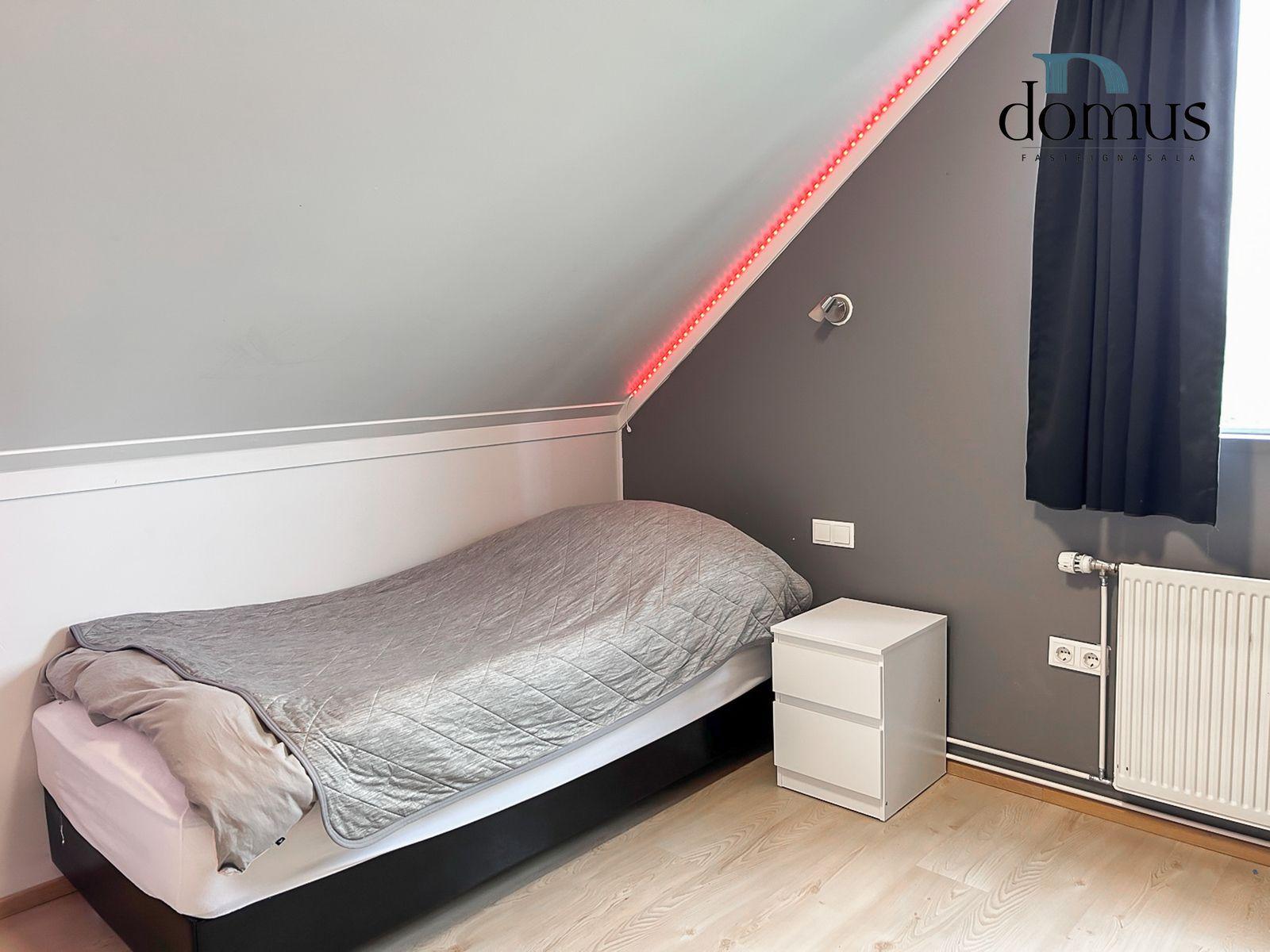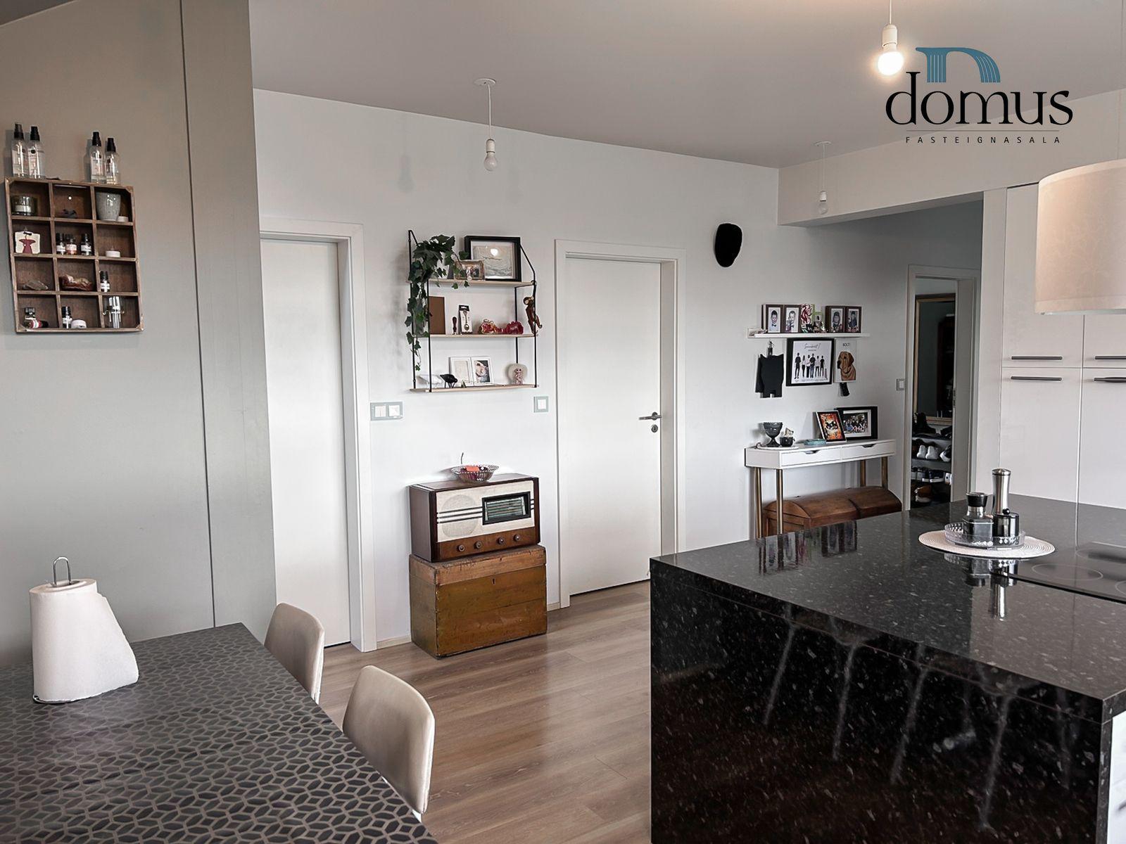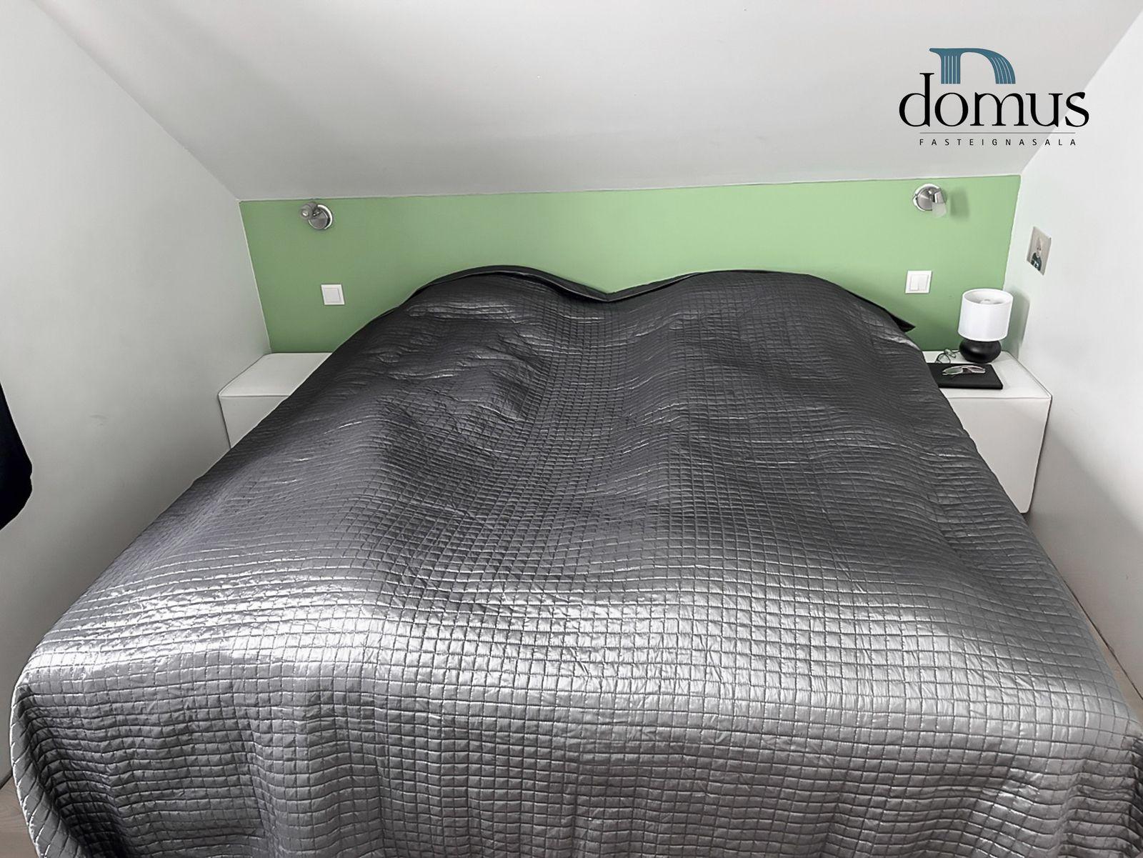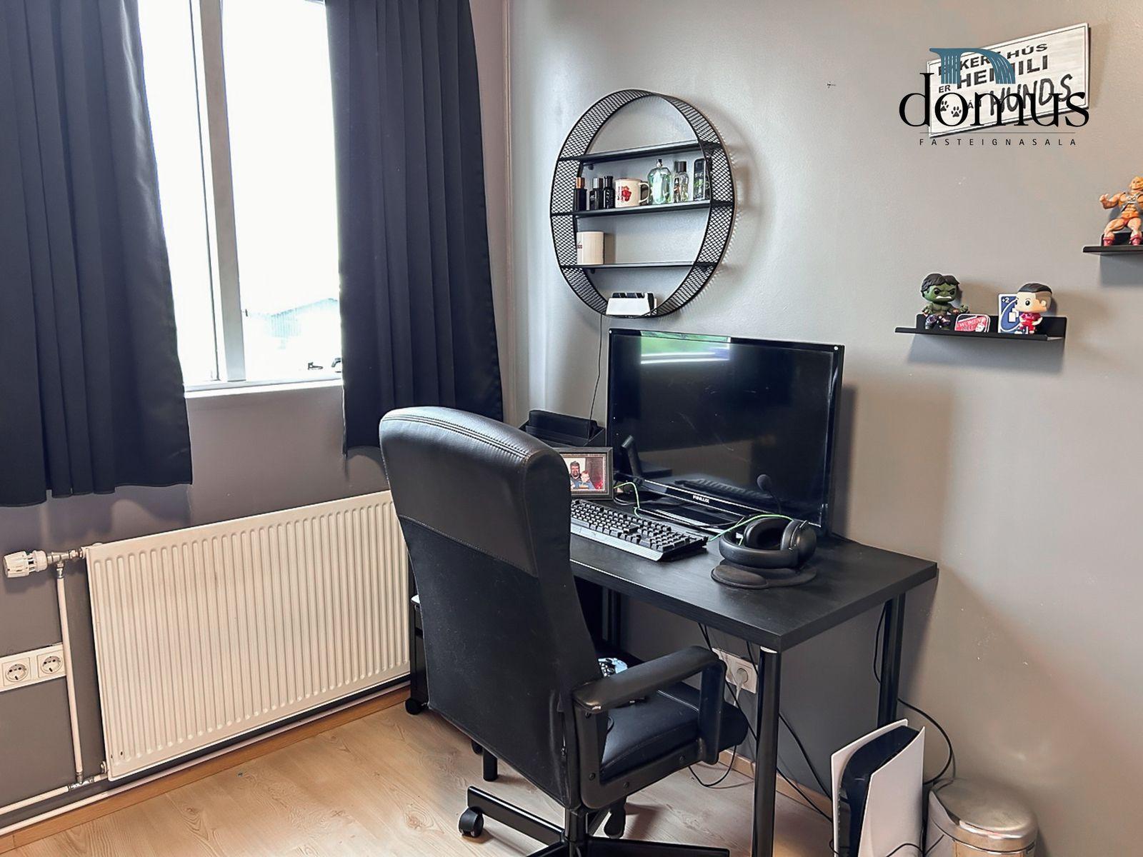 Nánari lýsing: Baðherbergi á neðri hæð er með baðkari og er 8,2 fm að stærð. Flísar eru á gólfi og klósettkassi með náttúrusteini. Hornbaðkar. Baðherbergi á efri hæð er með sturtu og er 5,7 fm. Flísar eru á gólfi, bakhlið sturtuklefa og klósettkassa. 90 cm sturtuklefi Hjónaherbergi er um 19 fm með útgengi á svalir. Svalir eru tilbúnar en á eftir að hengja upp. Var verið að bíða eftir endanlegum frágangi lóðar undir svölum. Parket er á gólfi og stór skápur er á gangi uppi sem þjónar öllum herbergjum. Barnaherbergi með velux þakglugga og er um 11 fm og parket er á gólfi. Endaherbergi með glugga út á framhlið húss er 10.4 fm og parketi á gólfi. Endaherbergi með glugga út á framhlið húss er 10,4 fm og parketi á gólfi Þvottahús er á neðri hæð inn af eldhúsi. Þar er hurð út í bakgarð. Gólf er lakkað. Stofa á neðri hæð er 39,3 fm og með parketi á gólfi. Á öllum úthliðum eru 2m gluggar auk þess sem tvöföld hurð er að sólpalli. Stofa á efri hæð er 26,6 fm með parketi á gólfi. Í þeirri stofu er tveir velux þakgluggar. Stór fataskápur er í stofunni. Geymsla er undir stiga milli hæða Eldhús er um 23 fm með innréttingu frá IKEA. Eyja með helluborði er í miðju eldhúsi og borðplata er sérsmíðuð. Innrétting gerir ráð fyrir tvöföldum ísskáp en uppþvottavél og bakaraofn eru 60 cm. Parket er á gólfi.