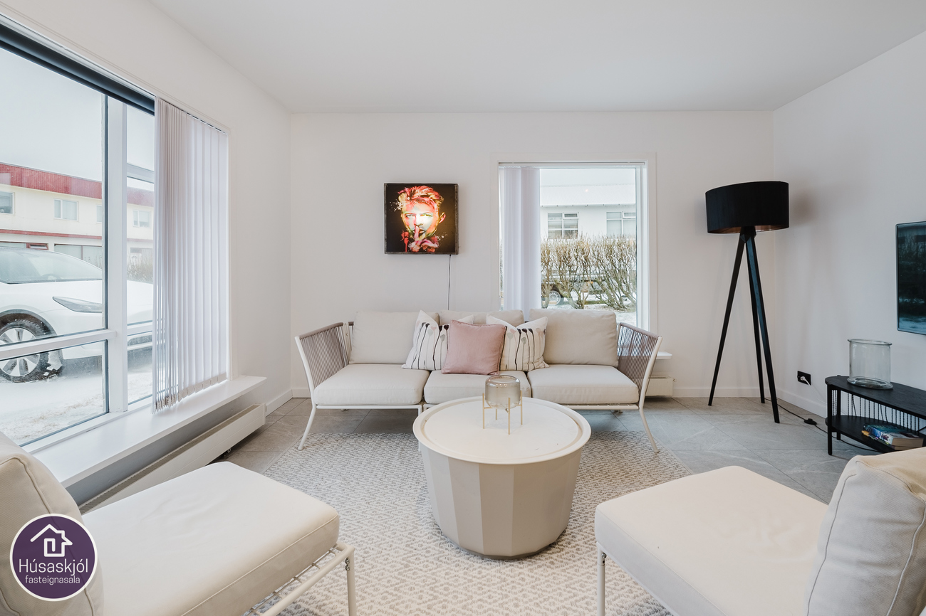 Komið er inn í forstofu með sameiginlegum inngangi efri hæðar. Þaðan er gengið inn í rúmgott hol og á hægri hönd er geymsla sem er með tengi fyrir þvottavél. Stofa/borðstofa er rúmgott og bjart rými með stórum gluggum á tvo vegu. Eldhús er með endurnýjaðri hvítri eldhúsinnréttingu sem er með efri og neðri skápum, góðu skápaplássi/skúffum og eyju sem hægt er að sitja við. Endurnýjuð eldhústæki, ofn í vinnuhæð, keramikhelluborð og háfur. Einnig eru vaskur og blöndunartæki endurnýjuð. Búið er að taka loftið niður sem er með innbyggðri óbeinni lýsingu.Baðherbergið er endurnýjað með flísum í hólf og gólf, dökk baðinnrétting með skúffum og innbyggðum vaski, upphengt klósett, baðkar með sturtu og gleri, handklæðaofn. Óbein innbyggð lýsing í lofti. Svefnherbergin eru tvö og eru þau bæði rúmgóð með ljósu harðparketi á gólfum og eru rúmgóðir ljósir fataskápar úr við í hjónaherberginu.
