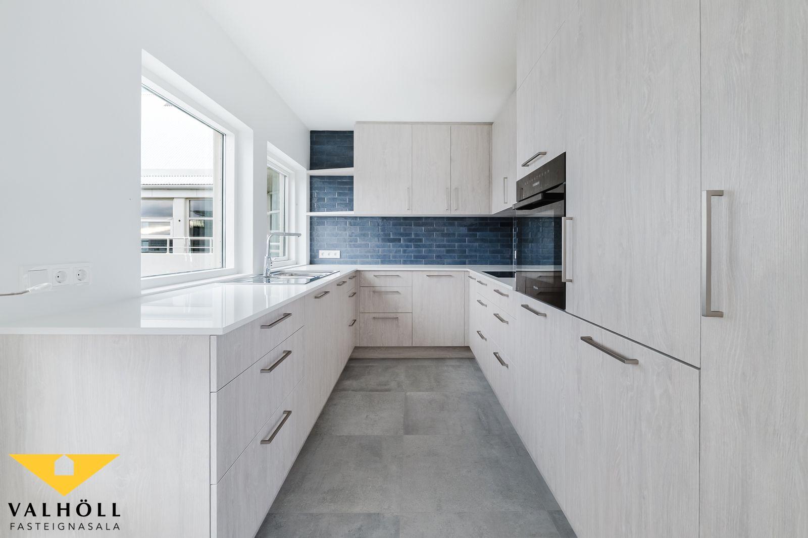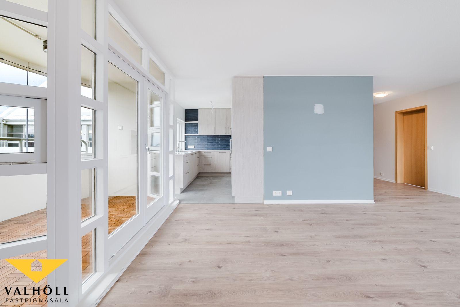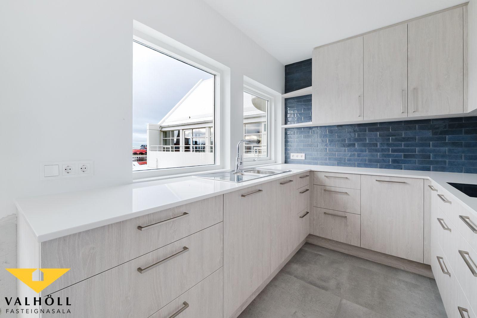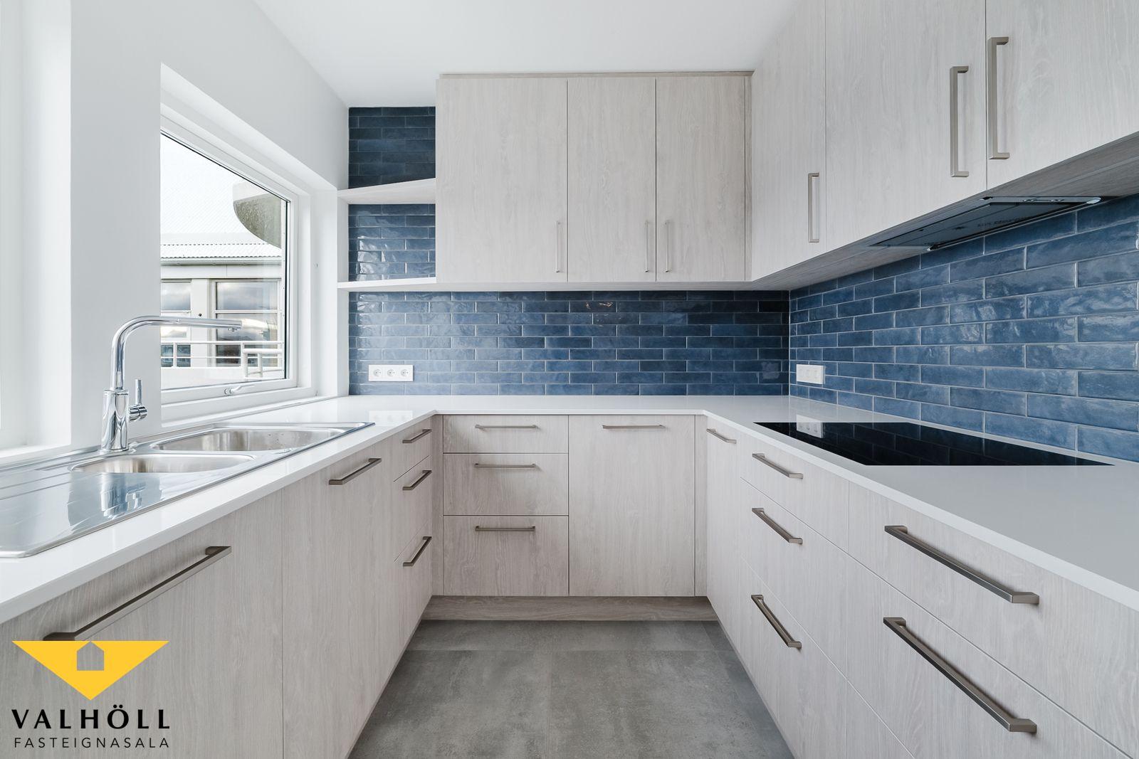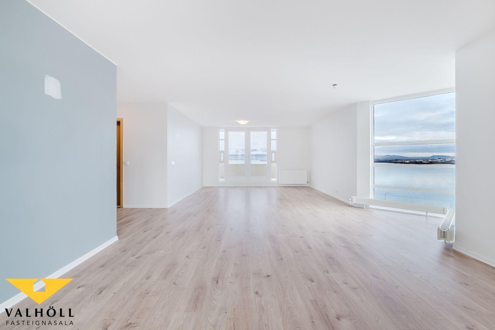 Íbúð: Komið er inn í flísalagt anddyri með flísum og rúmgóðum skápum. Stofurnar eru mjög rúmgóðar og bjartar með nýlegu harðparketi á gólfi. Ótrúlegt útsýni er úr stofunum, þar er útgengi tvennar svalir sem snúa í suður og norður. Stofa, borðstofa og eru í einu rými. Eldhúsið er með nýrri ljósri innréttingu og stein á borðum. Ný tæki, ofn, helluborð innbygðri uppþvottarvél og ískáp og frysti sem fylgja.