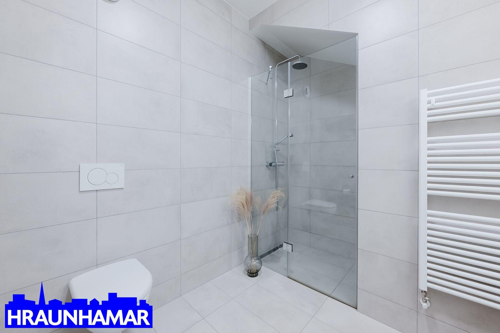 baðherbergi með innréttingu með handlaug, upphengdu salerni, sturtuklefa og handklæðaofn.