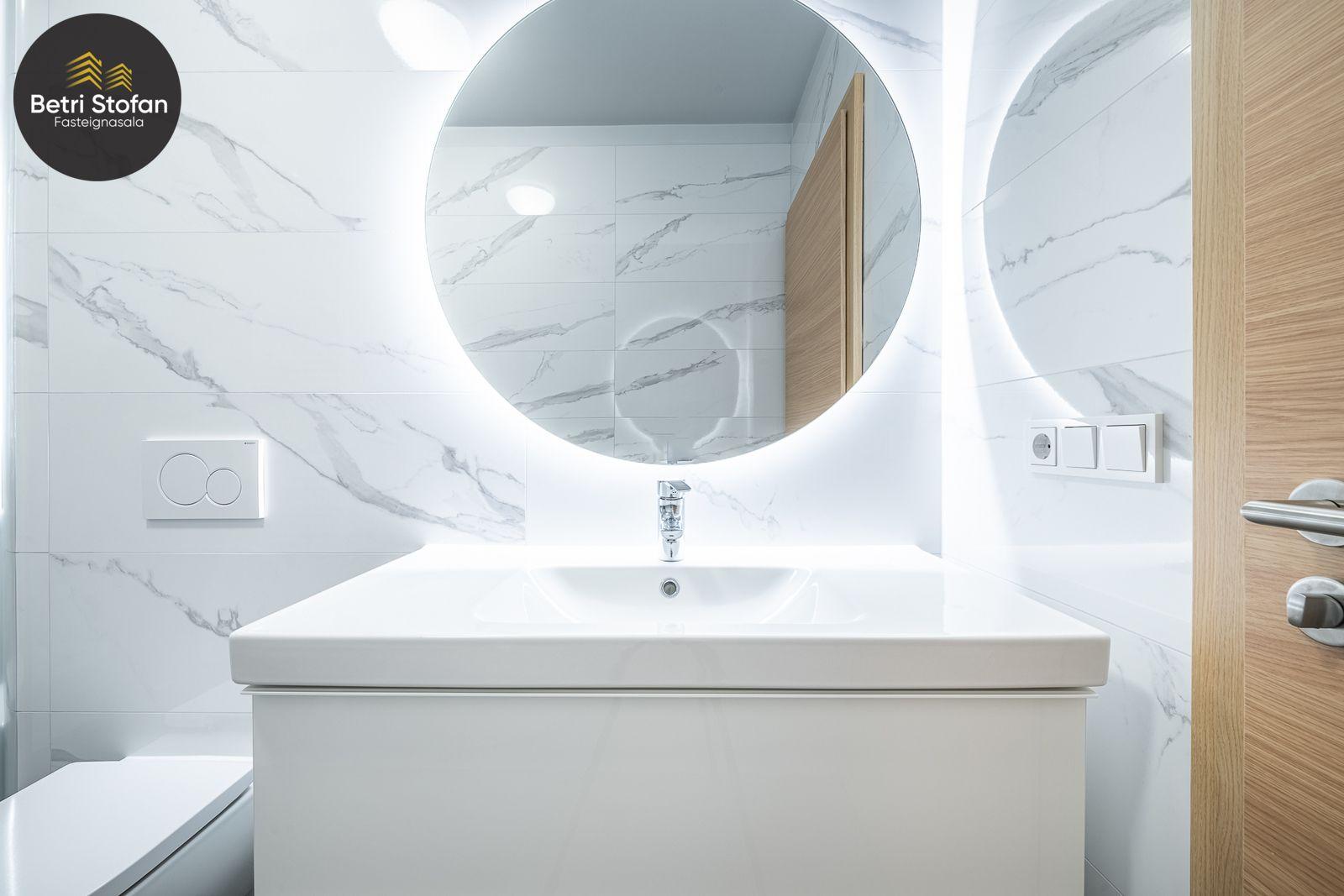 Baðherbergi með sturtu, með innréttingu, handlaug og upphengdu salerni og handklæðaofn.