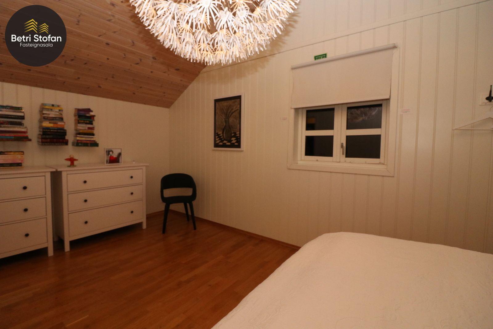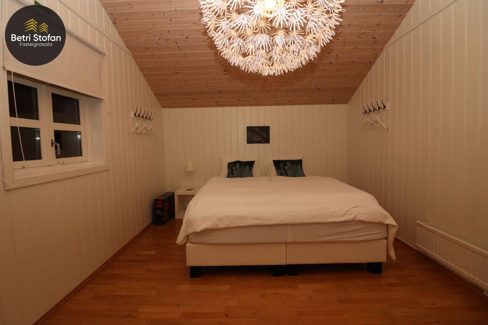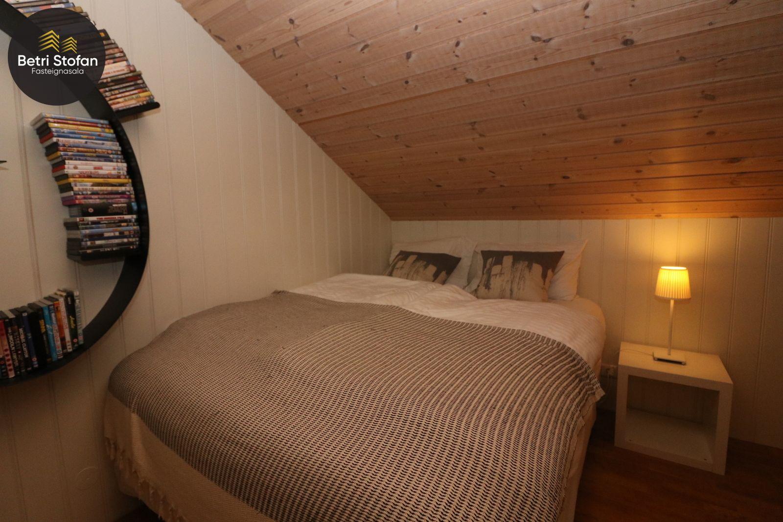 Nánari lýsing: Gengið er inn í eldhús í gegnum hurð á forstofu.- Glæsilegt eldhús með ísskápi og ofni. Hurð í eldhúsi til að ganga út á útisvæði. Opið rými frá eldhúsi er opið rými inn í borðstofu og stofuna sem er í sér álmu með lokanlegri rennihurð. Forstofa, eldhús og borðstofa eru með hita í gólfi. Stigi er er upp á efri hæð. Efri hæðin er með mikilli lofthæð og skiptist í 2 herbergi. Annað herbergið er stórt hjónaherbergi með stóri rúmi 1,80, hitt herbergið er líka með hjónarúmi sem er 1,40- Sambyggt húsinu er rúmgóð geymsla og gufubað. Húsið er á eignarlóð.