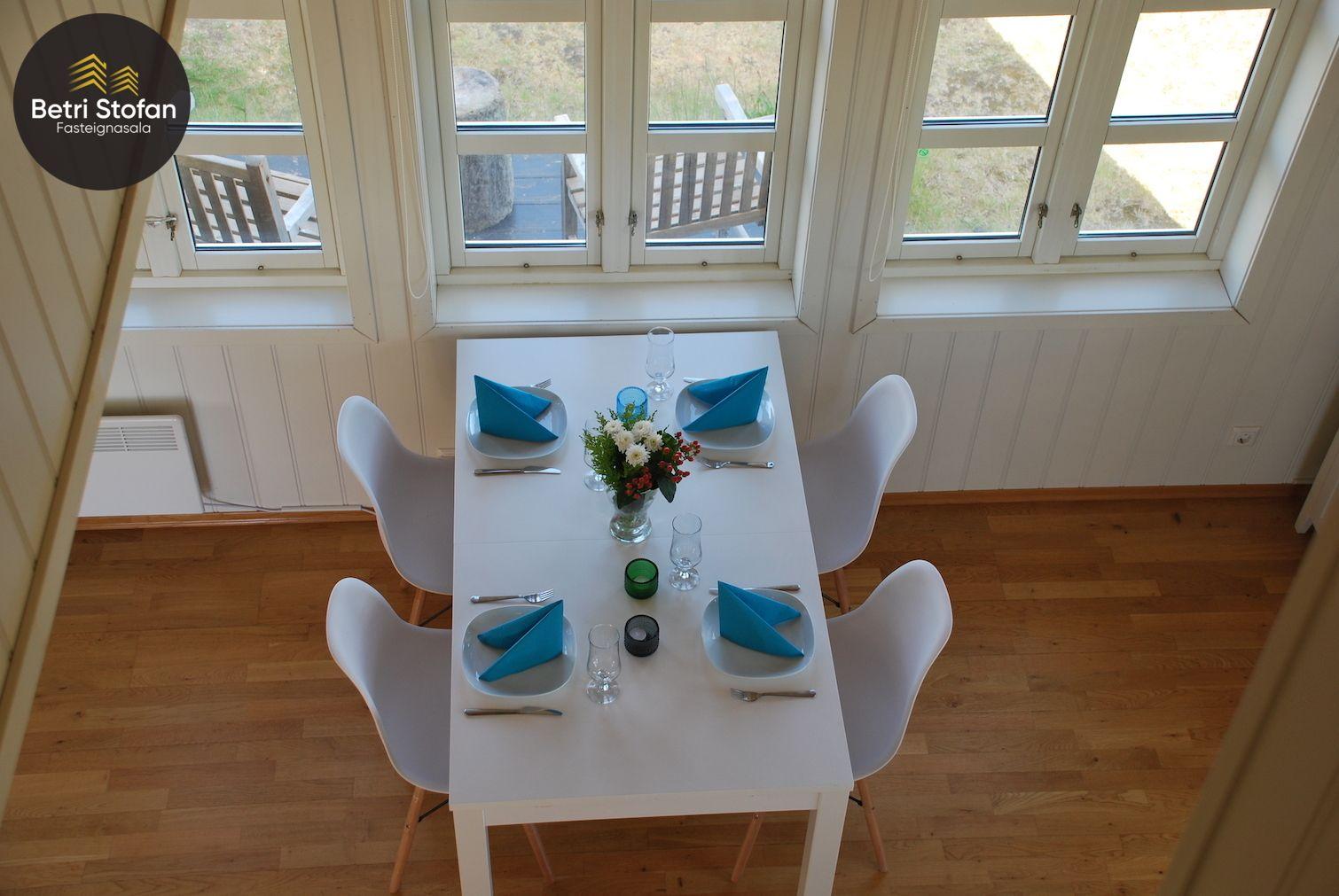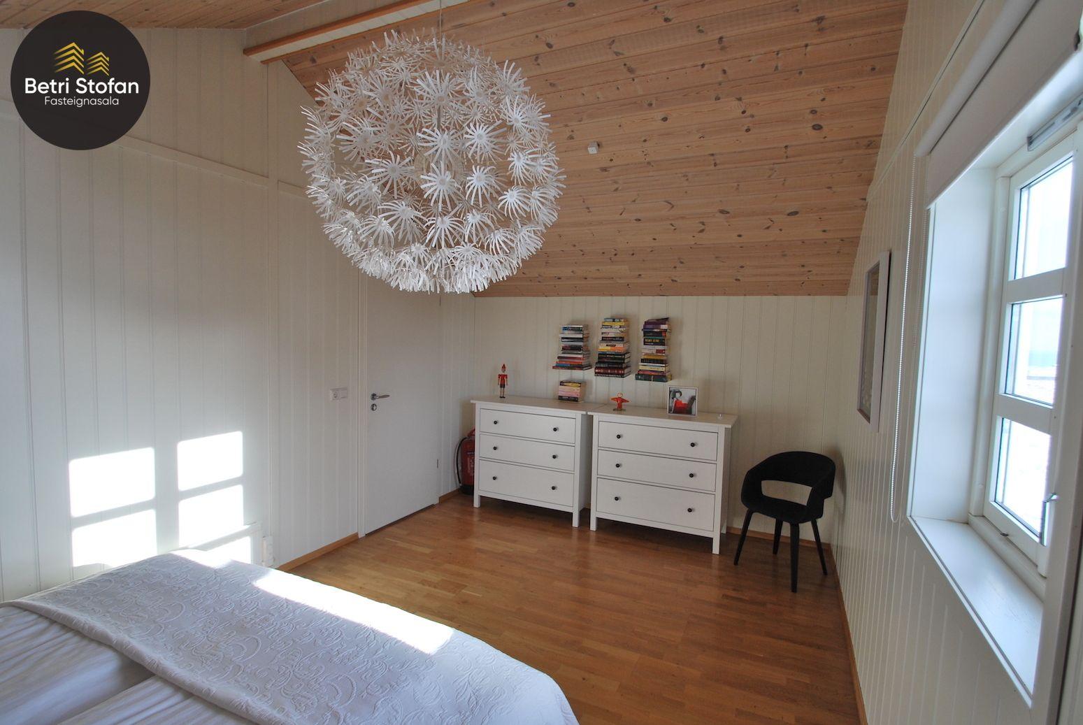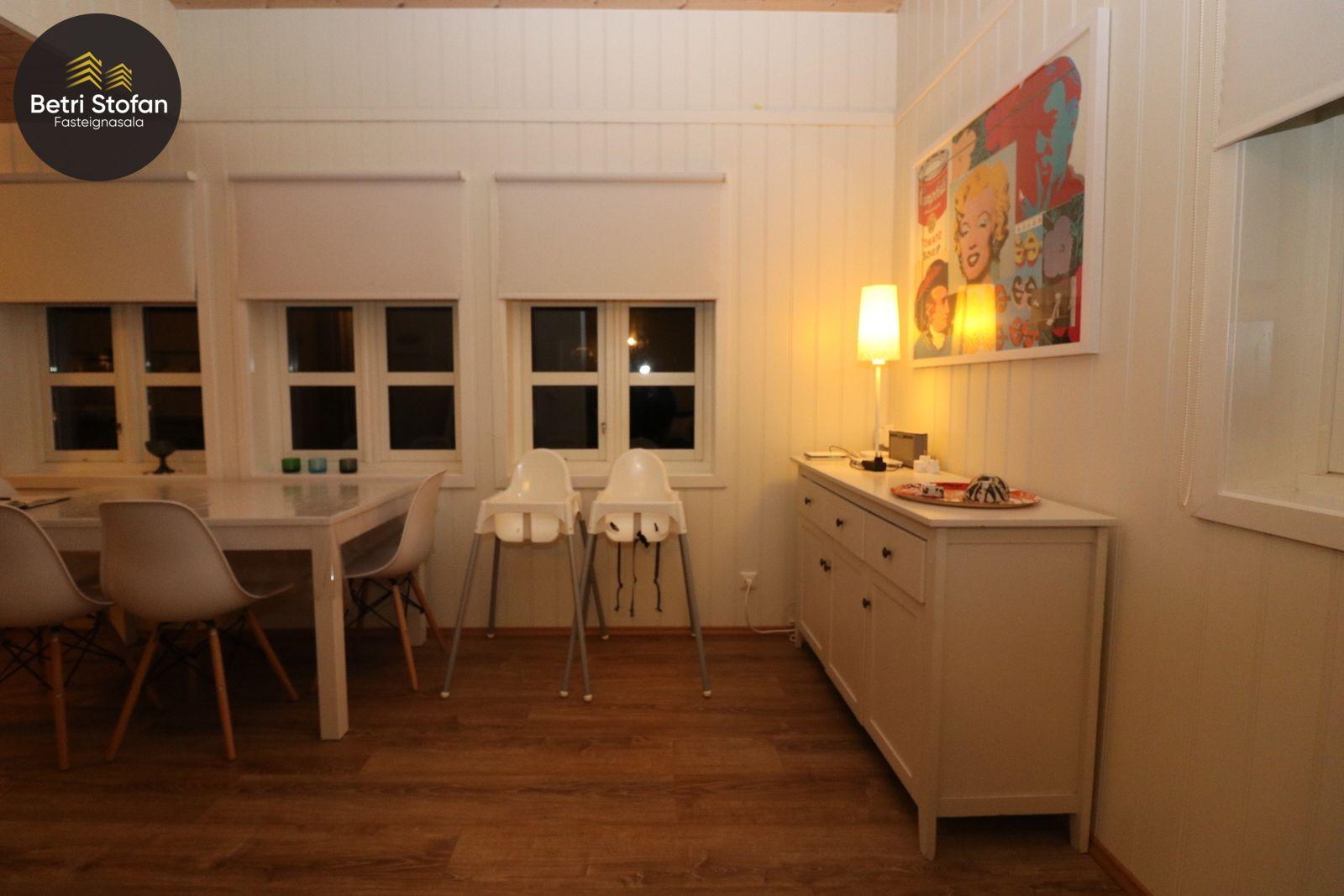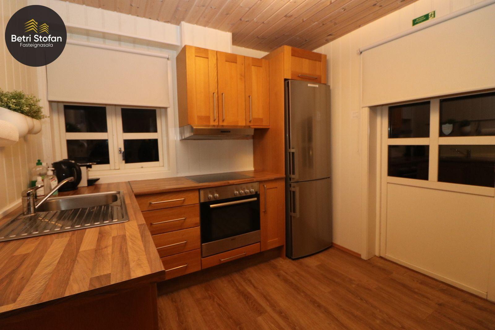Nánari lýsing: Gengið er inn í eldhús í gegnum hurð á forstofu.- Glæsilegt eldhús með ísskápi og ofni. Hurð í eldhúsi til að ganga út á útisvæði. Opið rými frá eldhúsi er opið rými inn í borðstofu og stofuna sem er í sér álmu með lokanlegri rennihurð. Forstofa, eldhús og borðstofa eru með hita í gólfi. Stigi er er upp á efri hæð. Efri hæðin er með mikilli lofthæð og skiptist í 2 herbergi. Annað herbergið er stórt hjónaherbergi með stóri rúmi 1,80, hitt herbergið er líka með hjónarúmi sem er 1,40- Sambyggt húsinu er rúmgóð geymsla og gufubað. Húsið er á eignarlóð.