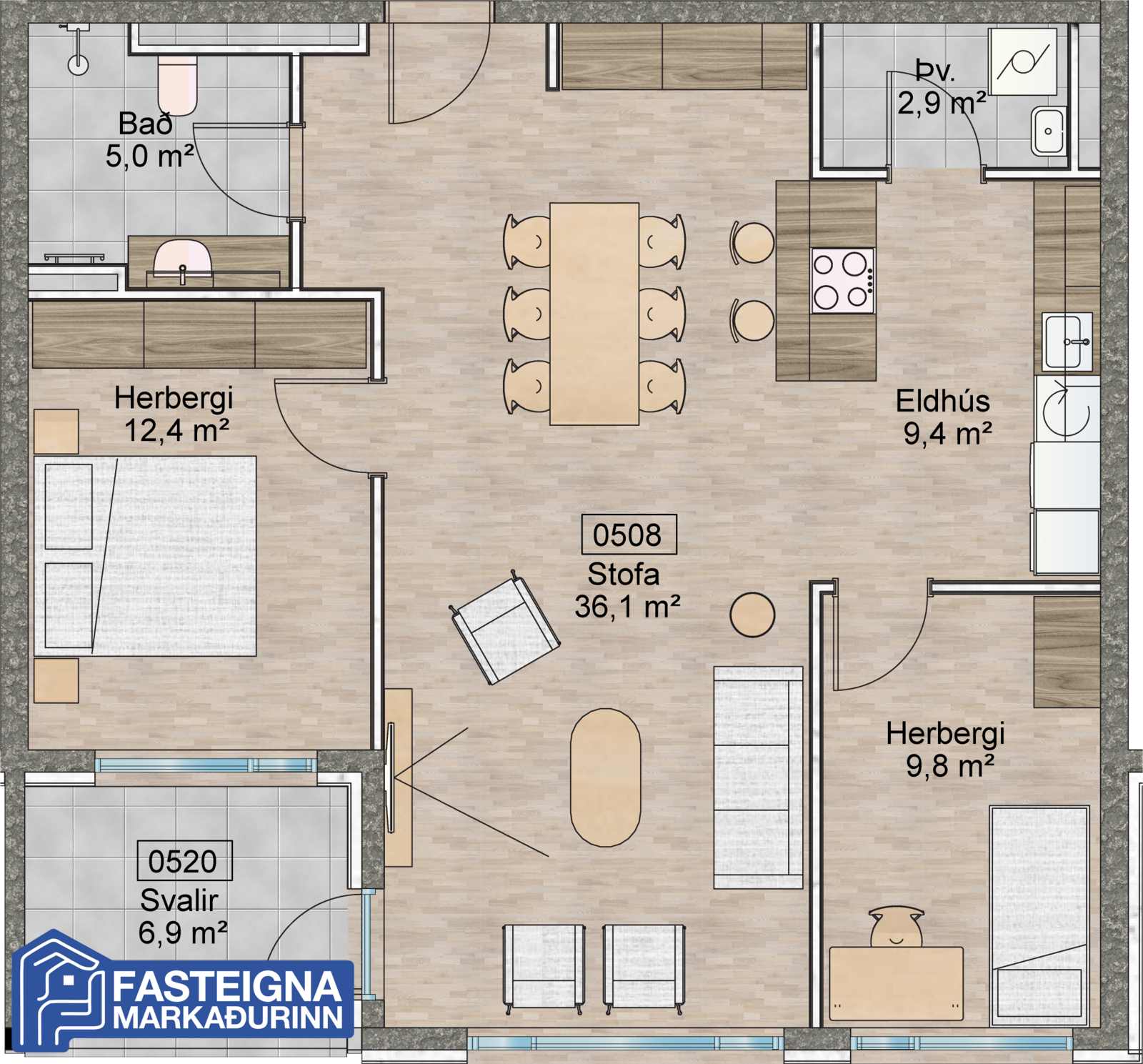 • Í íbúðinni er anhydrít gólf ílögn með gólfhita og verður því að nota varmaleiðandi dúk undir gólfefni þar sem við á. Í gólfinu getur verið töluverður raki og þá er nauðsynlegt að rakagrunna gólfið áður en niðurlímt gegnheilt parket er lagt á gólf ílögnina.