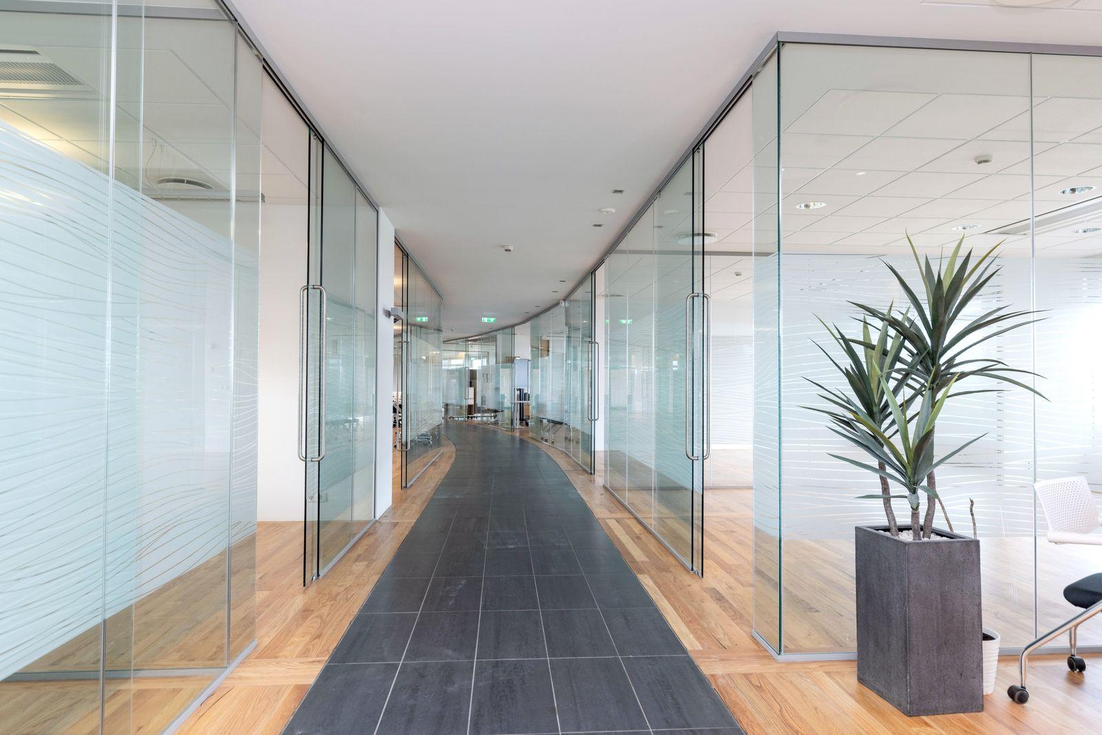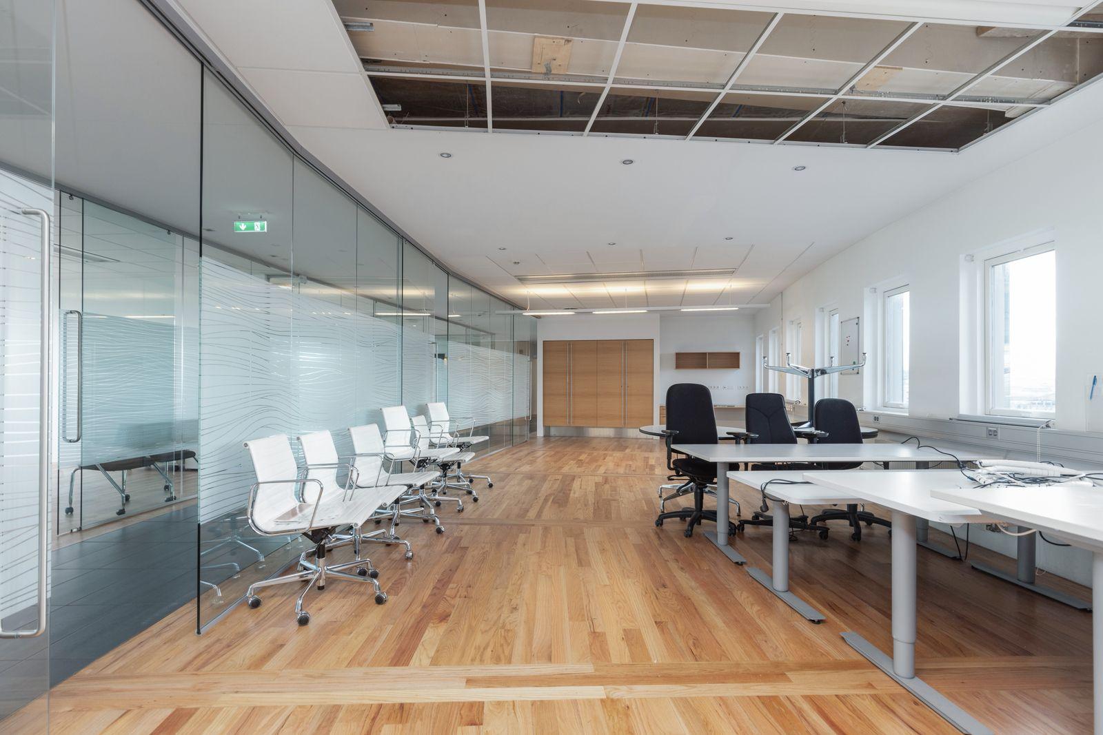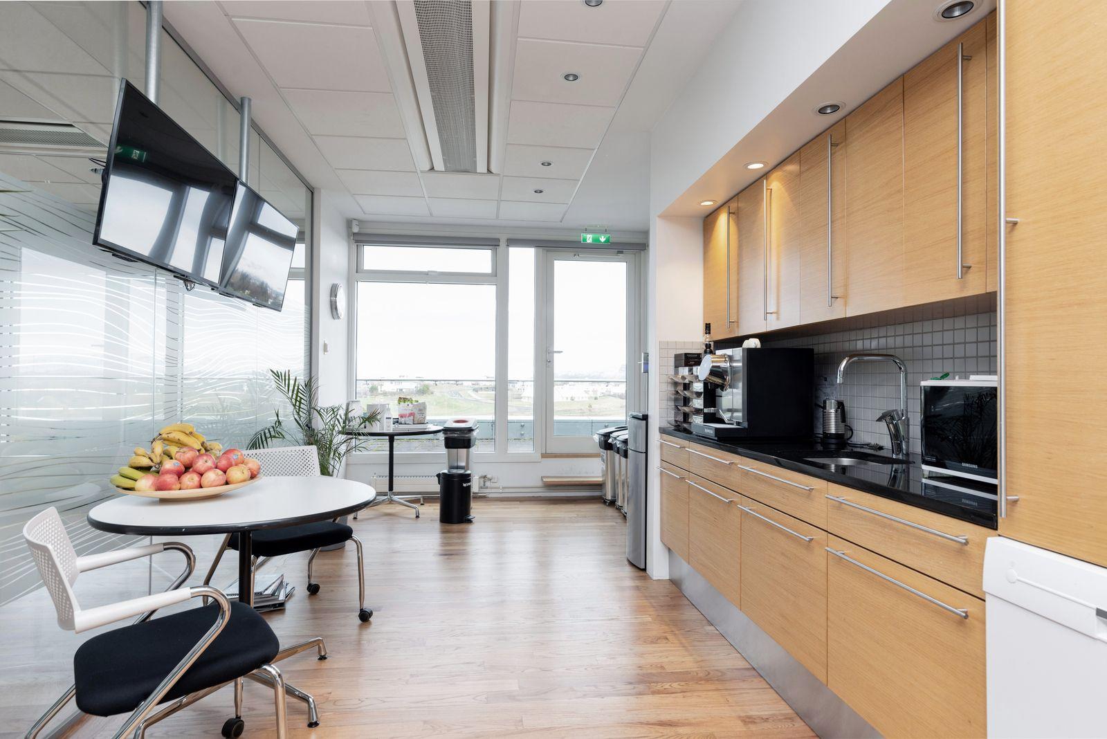 Um glæsilegt skrifstofurými á efstu hæð er að ræða með bæði opnu rými og lokuðum skrifstofum, í rýminu má einnig finna eldhúsaðstöðu og rúmgott fundarherbergi.