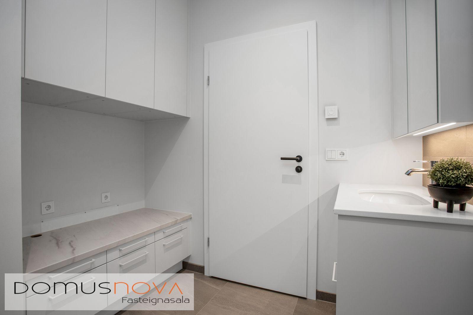 Baðherbergi flísalagt 60x60cm ljósgráum flísum frá EBSON bæði gólf og hluti veggja, með vandaðri innréttingu með Quartz stein á baðinnréttingu frá Technistone. Tenging fyrir þvottavél og þurrkara í innréttingu á baði. Annað baðherbergi innaf hjónaherbergi.
