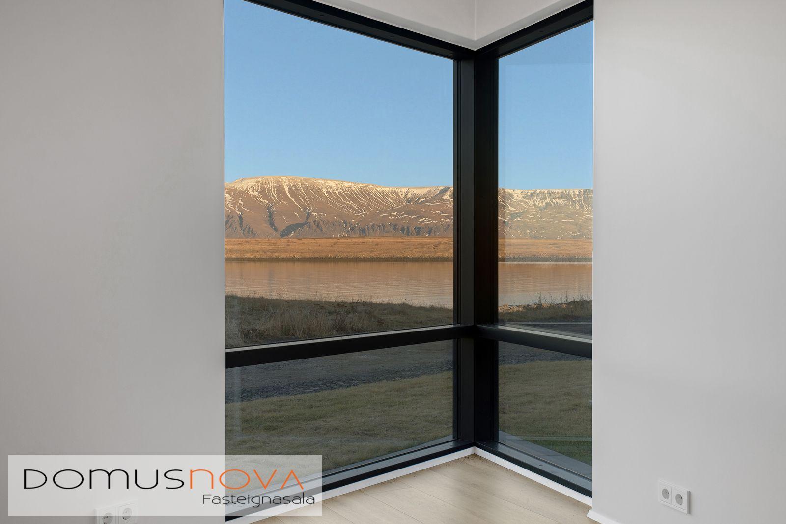 og út frá eldhúsi er stór gólfsíður gluggi.
