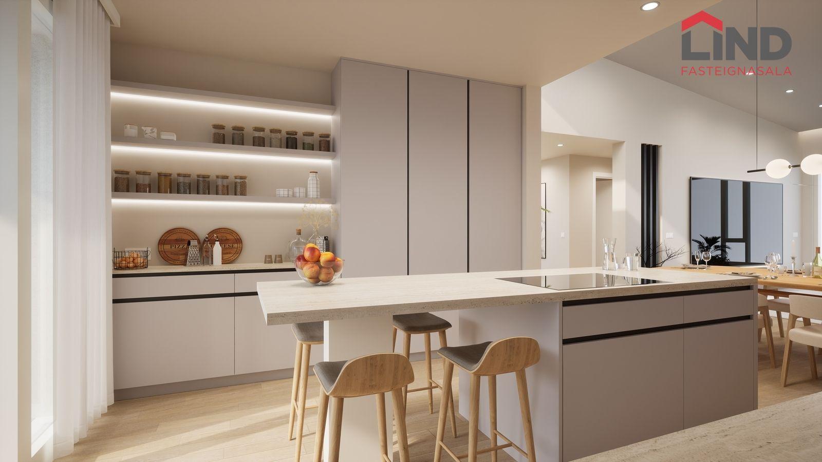 Borðstofa/stofa: Rúmgott og bjart alrými. Stórir gluggar sem gefa fallega birtu inní rýmið, hátt til lofts. Loftadúkur með innfeldri lýsingu. Auka lagnaleiðir voru lagðar að öllum gluggum, svo auðvelt sé að snjallvæða húsið.