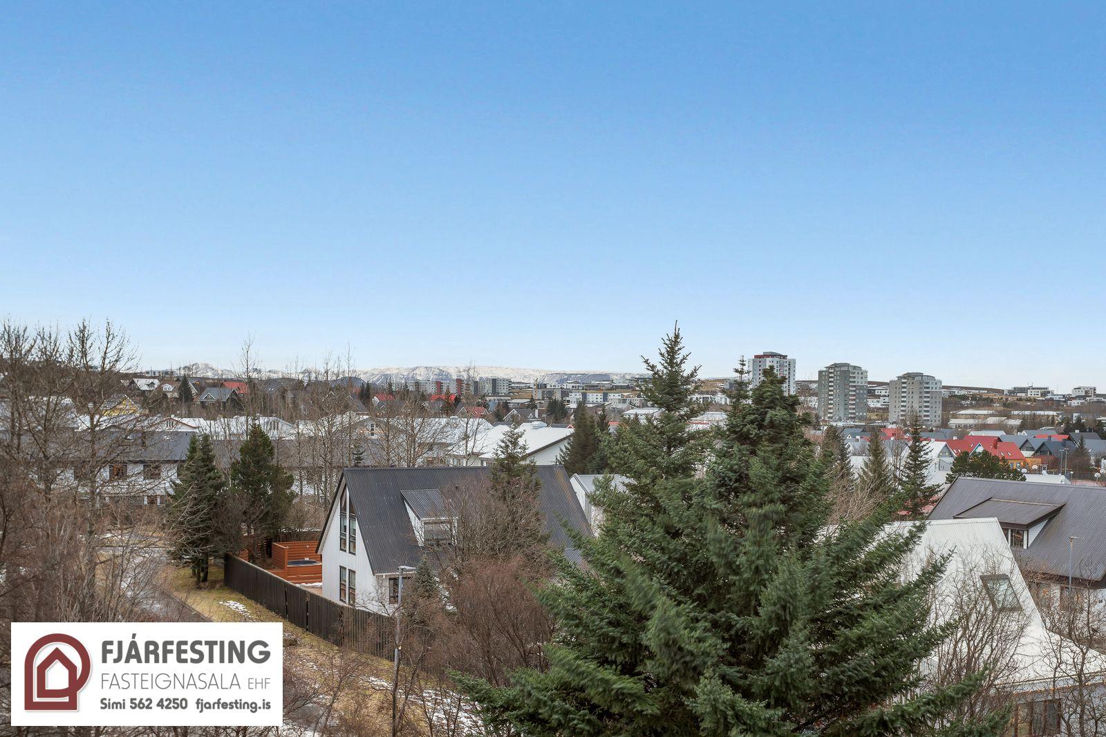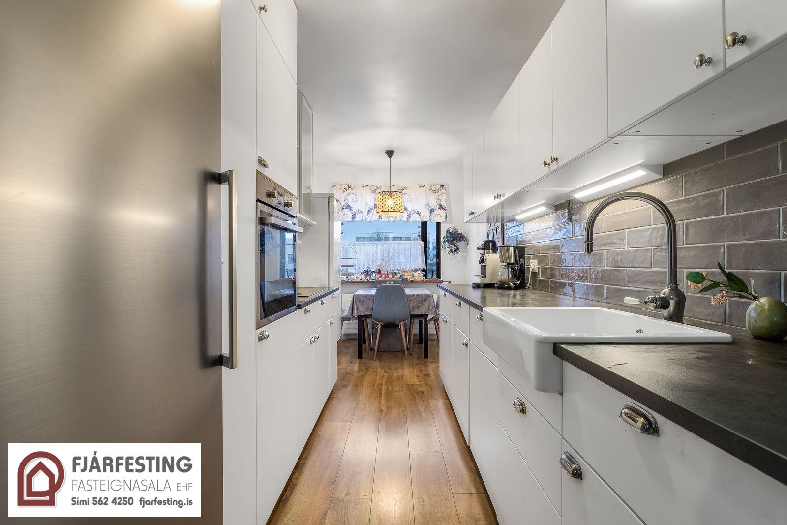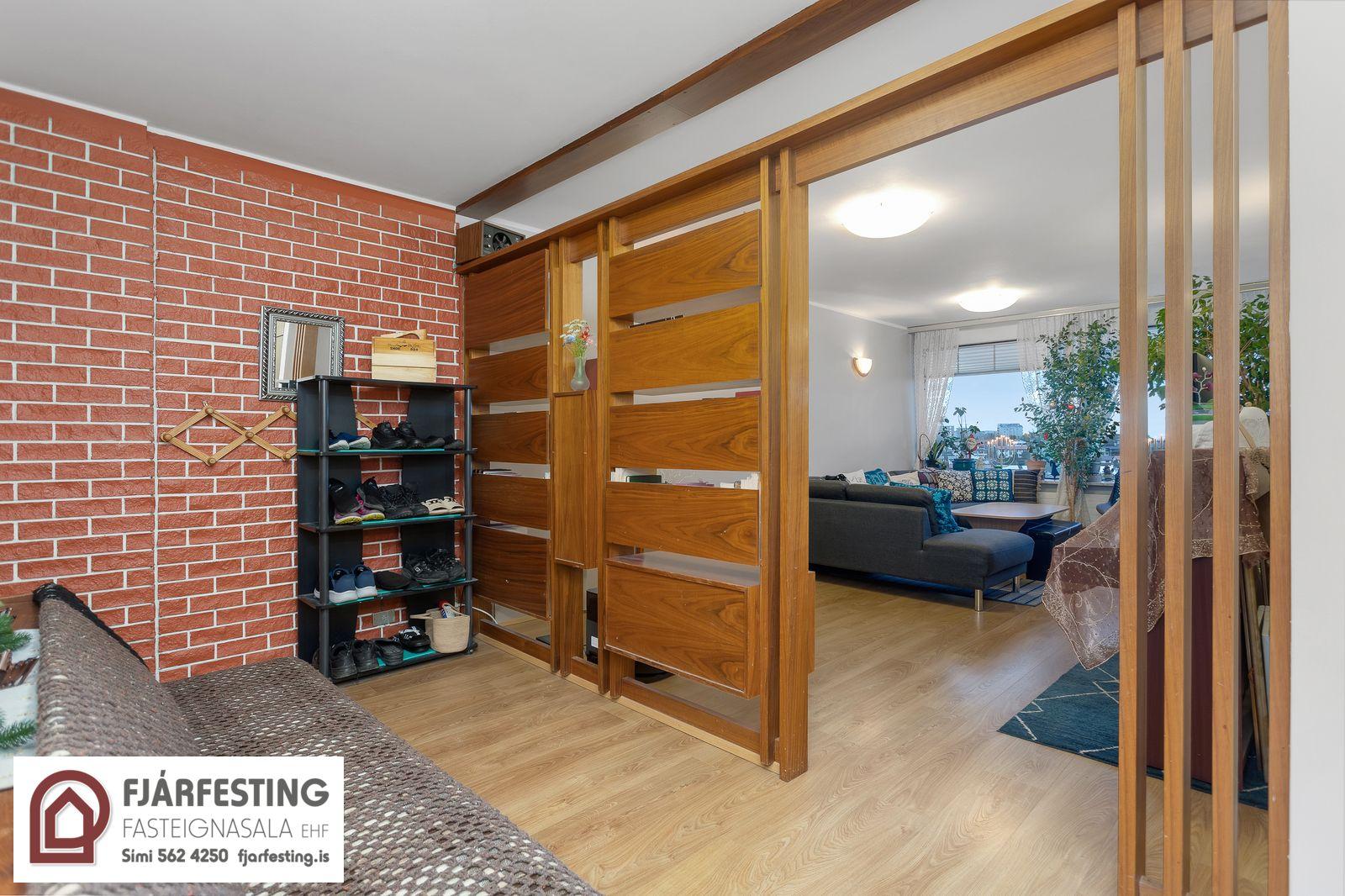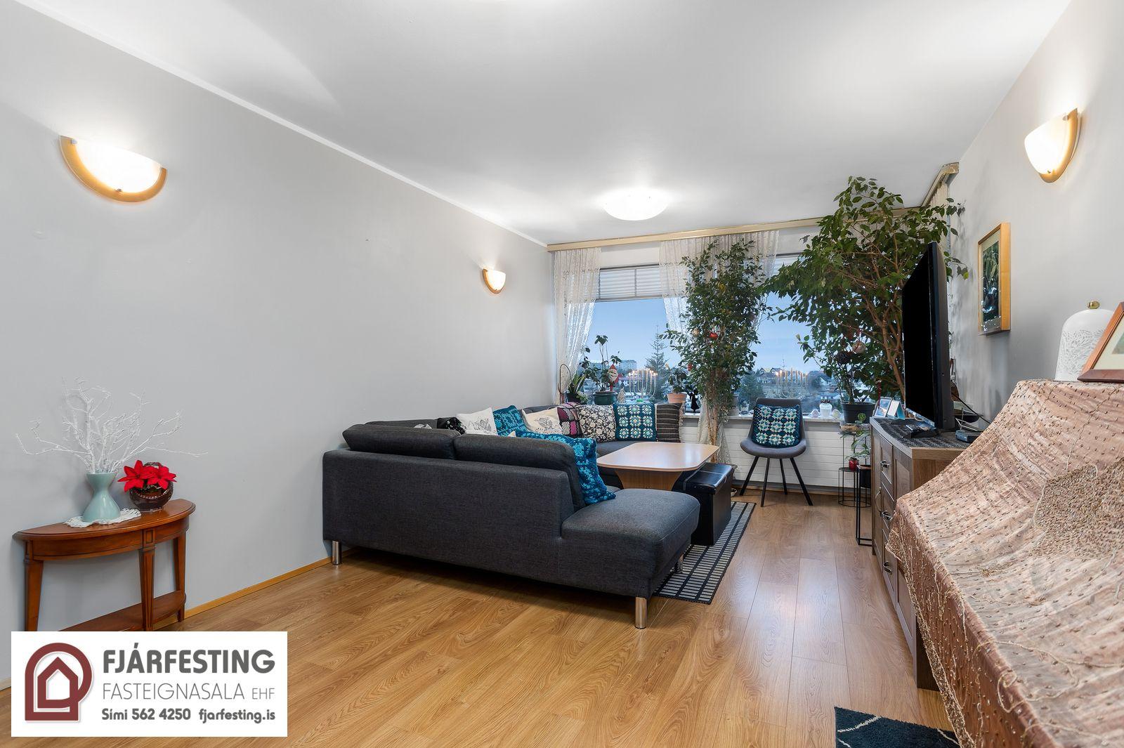 Nánari lýsing: Gengið er inn í anddyri og hol með parketi og fataskáp. Eldhús með nýlegri hvítri innréttingu, parketi á gólfi og borðkrók, gluggi er á eldhúsi. Mjög stór stofa og borðstofa með parketi á gólf, gengið er út á svalir. Mikið og fallegt útsýni er úr íbúðinni. Svefnherbergisgangur með parketi. Upprunalegt baðherbergi með flísum á veggjum og dúk á gólfi, baðker og innrétting. Hjónaherbergi með parketi á gólfi og fataskápum. Tvö góð barnaherbergi og annað með skáp.