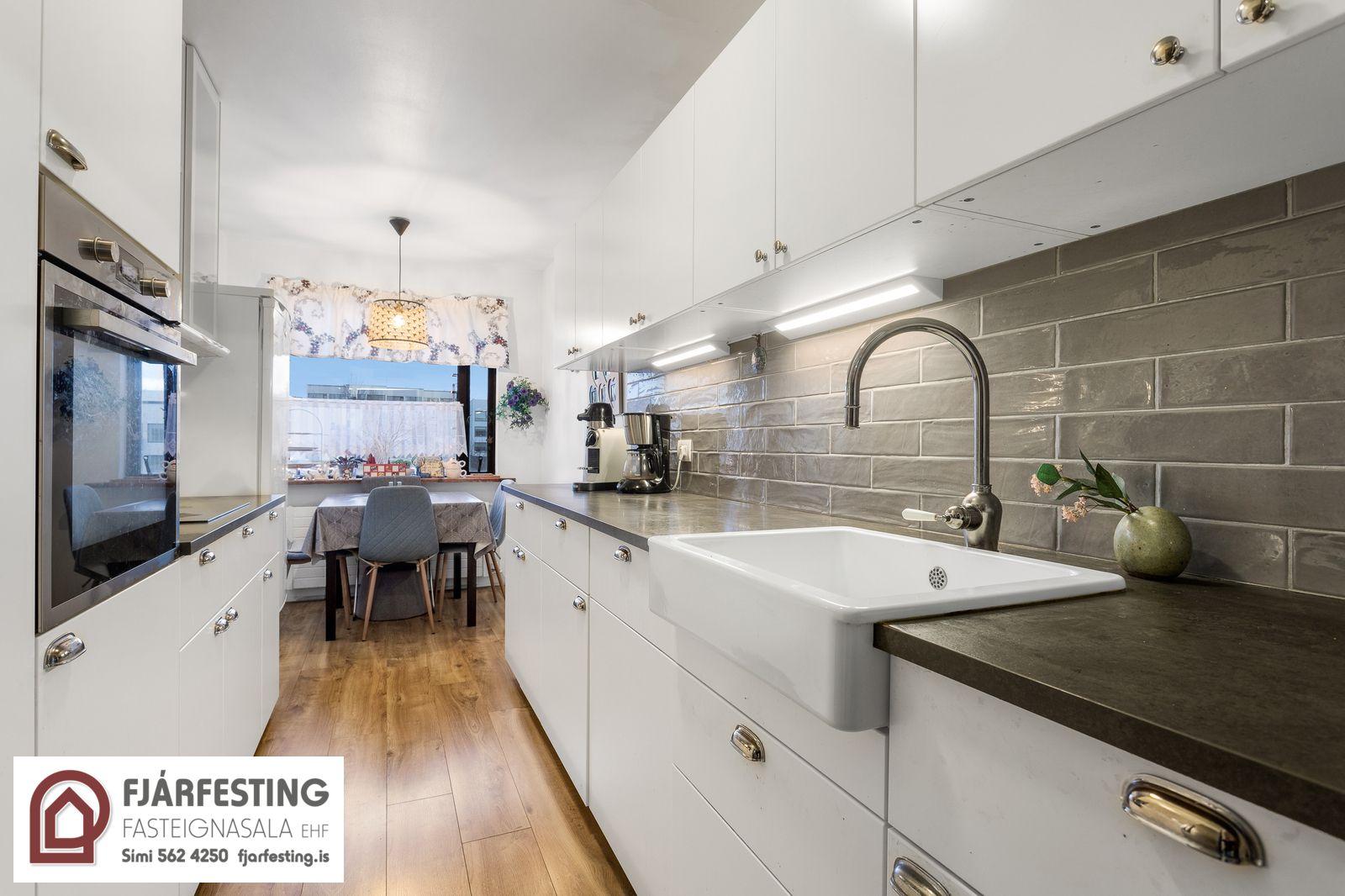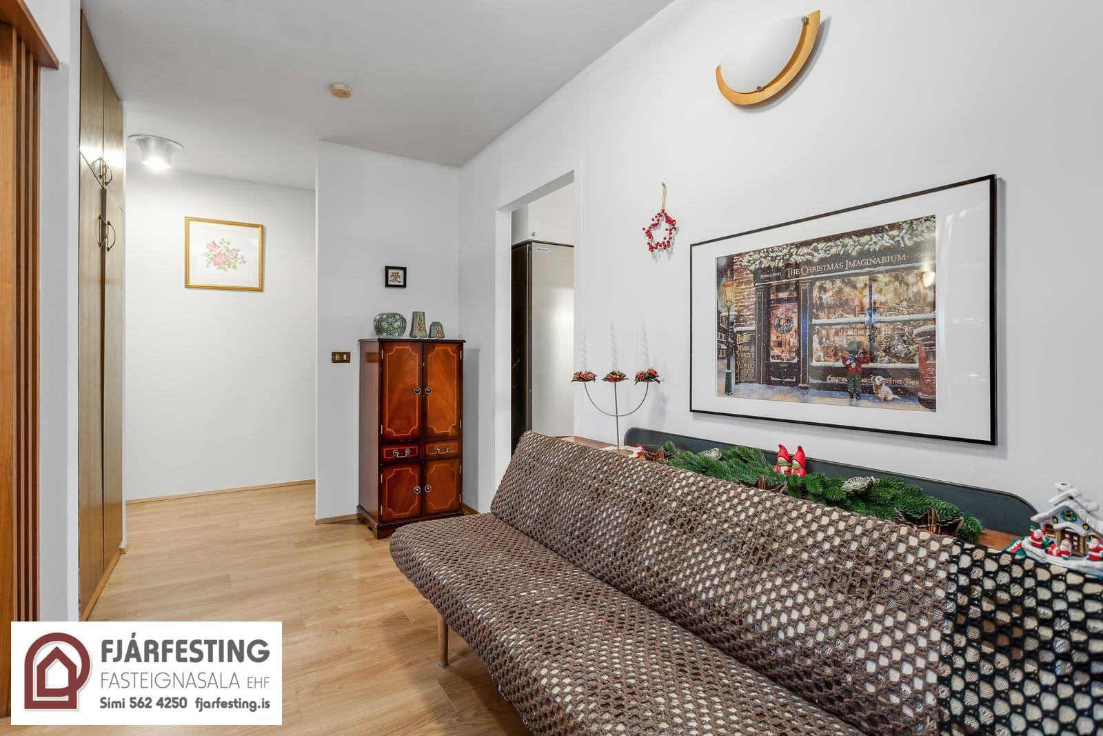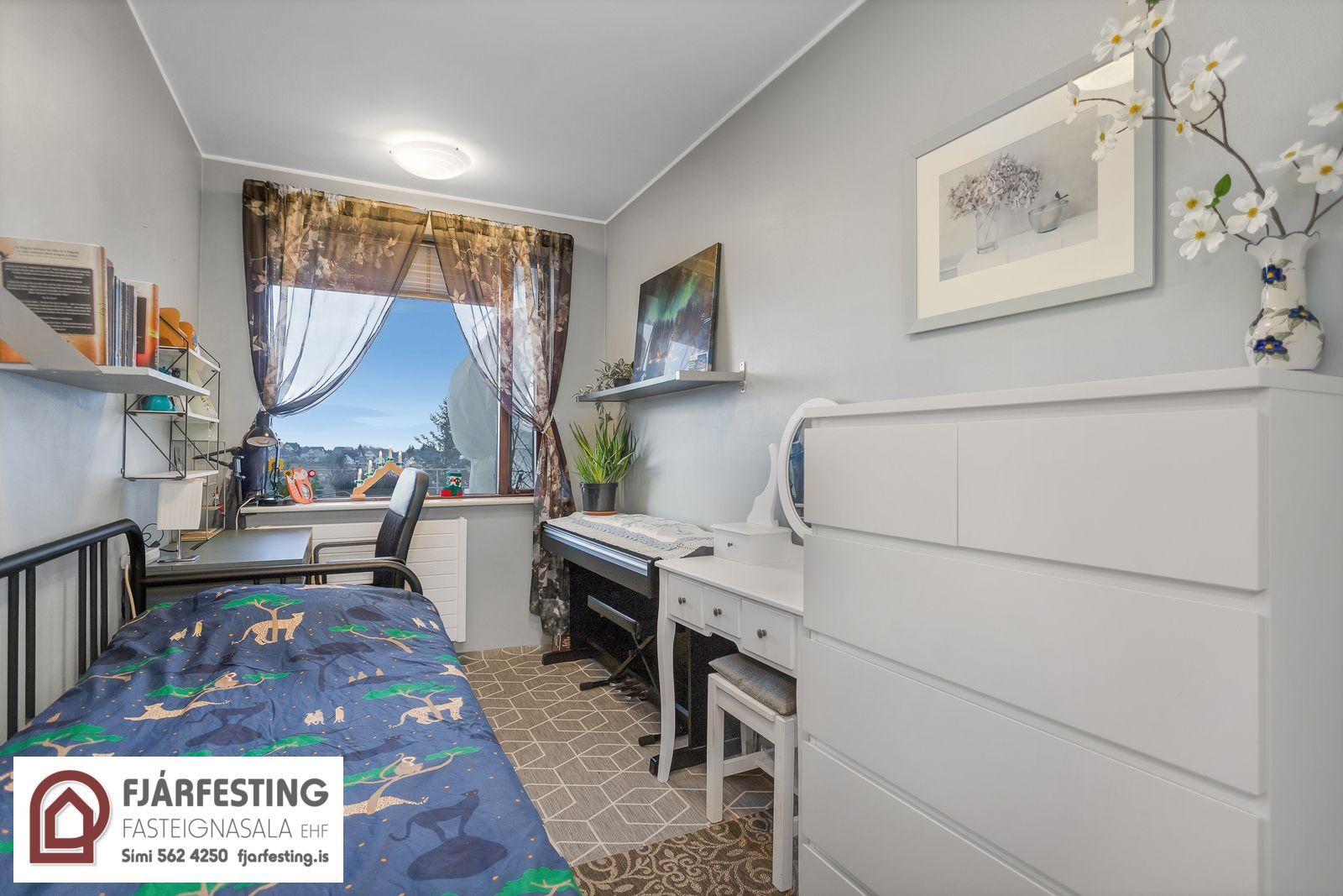 Nánari lýsing: Gengið er inn í anddyri og hol með parketi og fataskáp. Eldhús með nýlegri hvítri innréttingu, parketi á gólfi og borðkrók, gluggi er á eldhúsi. Mjög stór stofa og borðstofa með parketi á gólf, gengið er út á svalir. Mikið og fallegt útsýni er úr íbúðinni. Svefnherbergisgangur með parketi. Upprunalegt baðherbergi með flísum á veggjum og dúk á gólfi, baðker og innrétting. Hjónaherbergi með parketi á gólfi og fataskápum. Tvö góð barnaherbergi og annað með skáp.