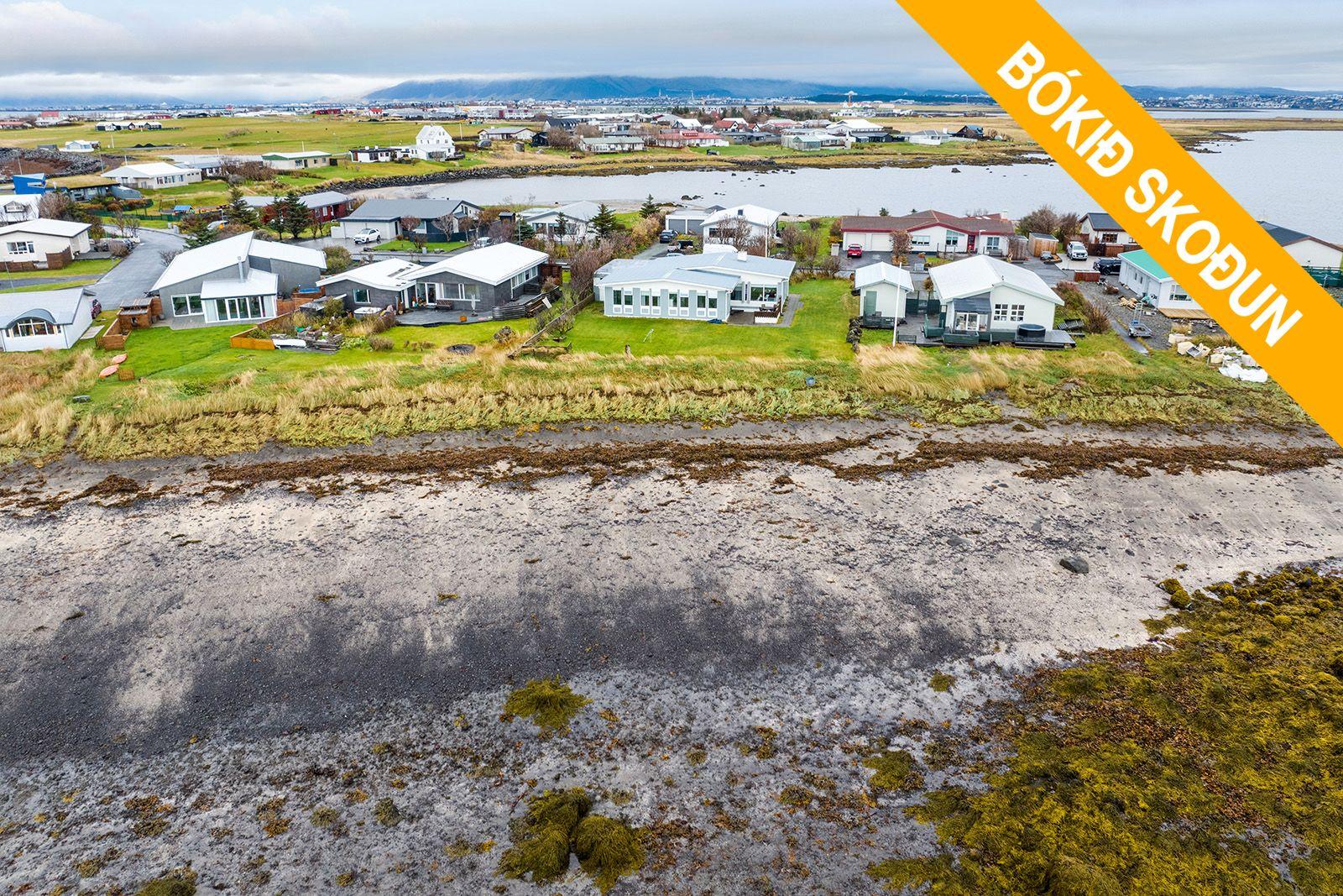 Komið er inn í alrými frá forstofu. Stórir gluggar í bjartri stofu með frábæru sjávarútsýni. Arin í stofu/borðstofu. Stofa og borðstofa með útgangi til á pall með heitum potti.
