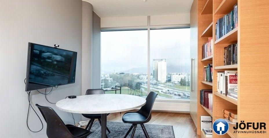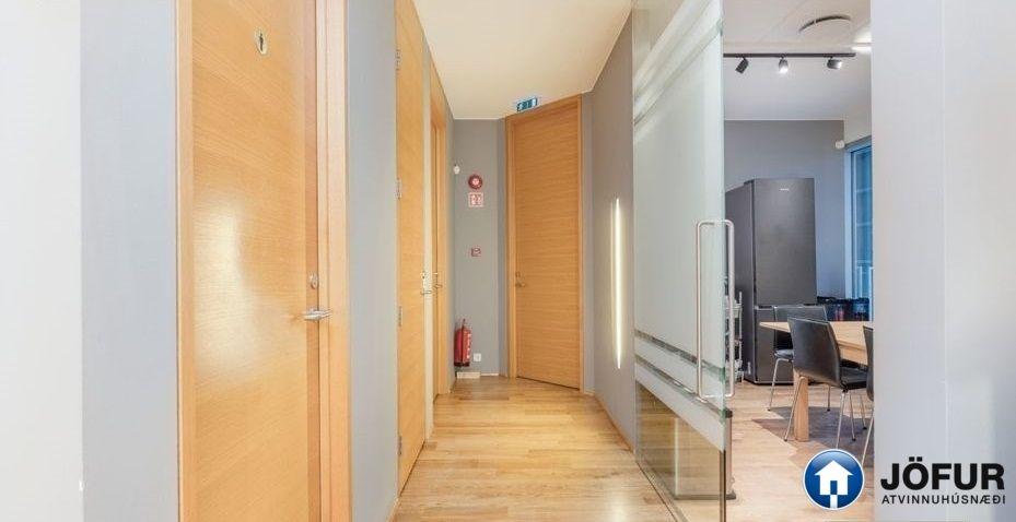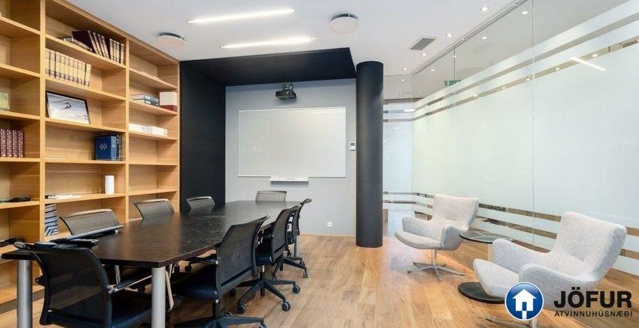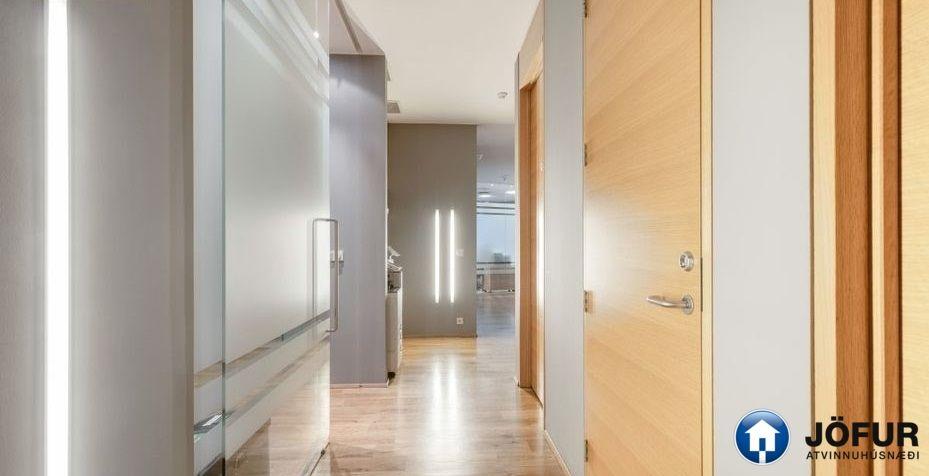 Húsnæðið skiptist í flotta móttöku, lokuð skrifstofurými með glerveggjum, fundarherbergi, góða kaffistofu og snyrtileg salerni með sturtu. Á gólfum er parket. Flottar innréttingar og fallegt útsýni.