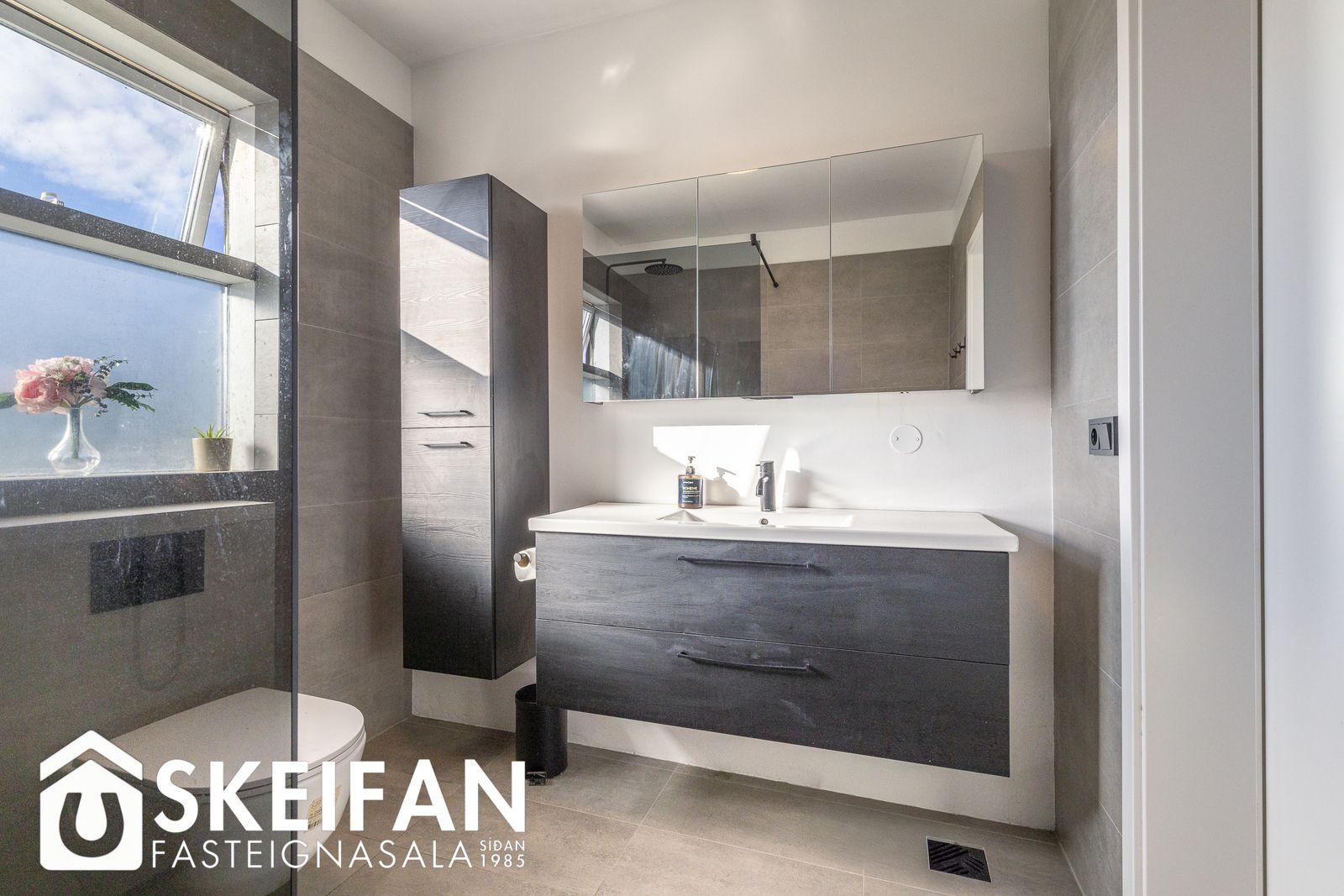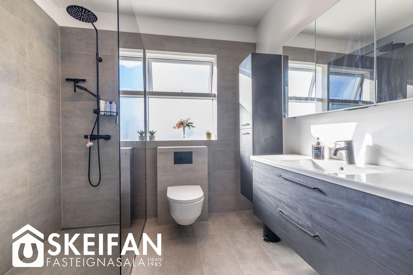 Baðherbergi er hið glæsilegasta, flísalagt nánast hólf í gólf, vönduð tæki frá Gröhe frá Ísleyfi Jónssyni, vegghengt salerni með ljúflokun, góð flísalögð og stór sturta með hertu gleri í vegg og góð innrétting.