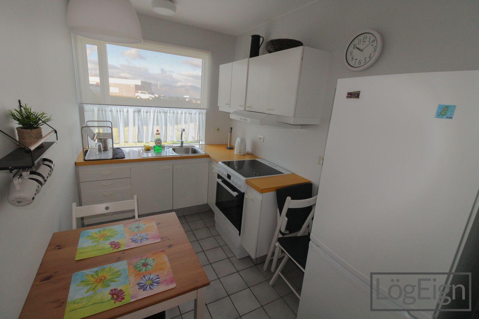 Nánari lýsing eignar; Gengið er inn í eignina úr sameiginlegu anddyri hússins. Strax á hægri hönd þegar komið er inn í íbúðina er baðherbergi og þar við hliðina er eldhús. Í enda íbúðar er svo svefnherbergi og stofa. Herbergi er gluggalaust og ná veggir sem aðskilja herbergið frá stofu og gang ekki alla leið upp í loft. Stofa er með stórum gluggum til vesturs. Eldhús er með hvítri inn réttréttingu með efri og neðri skápum og borðkrók. Baðherbergi er rúmgott miðað við stærð íbúðar með flísum á bæði gólfi og veggjum. Hvíta skápainnrétting með viðarborðplötu og vask er á baðherberginu og er þar gert ráð fyrir þvottavél. Innst á baðherberginu er sturta með sturtuskilrúmi og salerni. Lítil geymsla tilheyrir íbúð og er hún staðsett á jarðhæð. Húsið er í ágætu ástandi að utan og hefur fengið reglulegt viðhalda. Árið 2018 var húsið málað og farið í múrviðgerðir og var þá skipt um gler og glerlista á vesturhlið fjöleignarhússins.