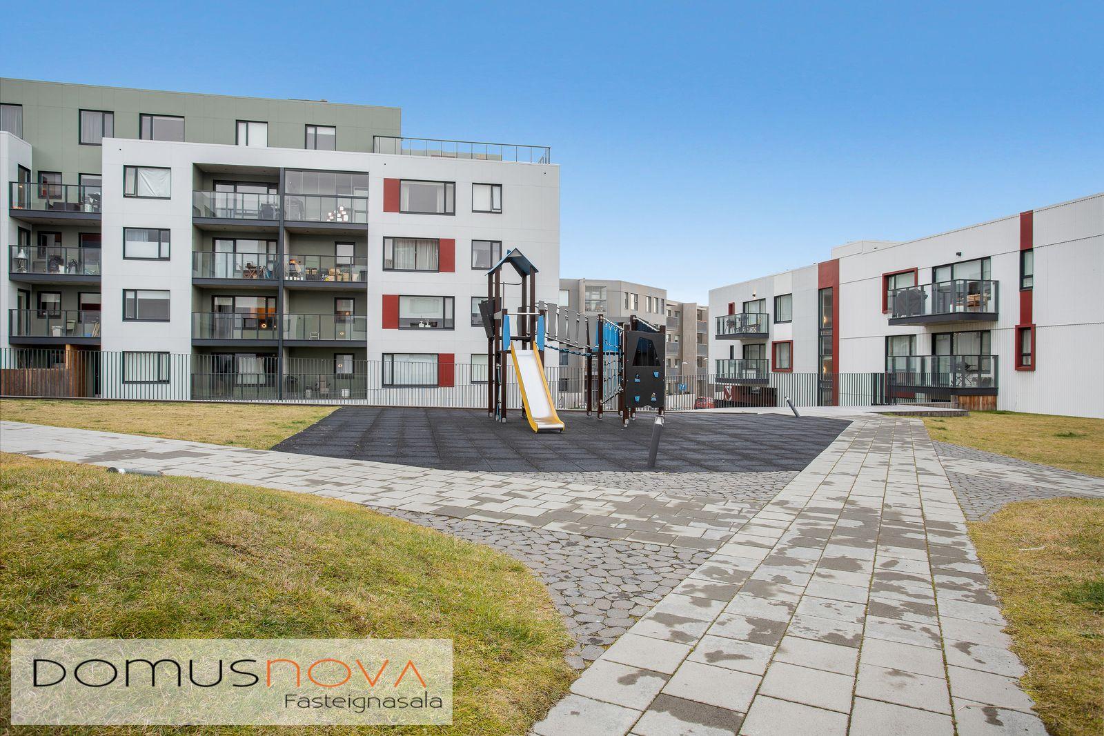 Nánari Lýsing: Anddyri – Fataskápar í hvítum lit og harðparket á gólfi. Hjónaherbergi – Hvítir fataskápar sem ná að lofti og Pergo harðparket á gólfi. Barnaherbergi – Ágætlega rúmgott barnaherbergi með hvítum fataskáp og Pergo harðparketi á gólfi. Alrými – Stofa/ eldhús – Gott opið og bjart eldhús og stofurými með útgengi á suðursvalir. Harðparket á gólfi. Eldhús – Eldhúsinnrétting er vönduð þýsk Nobila frá GKS innréttingum. Innbyggður ísskápur og uppþvottavél í innréttingu sem fylgja eigninni. Dökk vönduð borðplata og sama efni á vegg við innréttingu. Bakarofn í góðri vinnuhæð og rými fyrrir örbylgjuofn ofan við ofn. Þvottahús – Flísar á gólfi og rými fyrir þvottavél og þurkara. Baðherbergi – Gólf er flísalagt gráum flísum og veggir við sturturými eru flísalagðir gráum flísum. Glerþil við sturttu og handklæðaofn á vegg á móti sturtu. Snyrtileg dökk innrétting úr melamin efni með góðu skápaplássi og efri skápur með speglahurðum. Upphengt innfellt salerni á vegg.