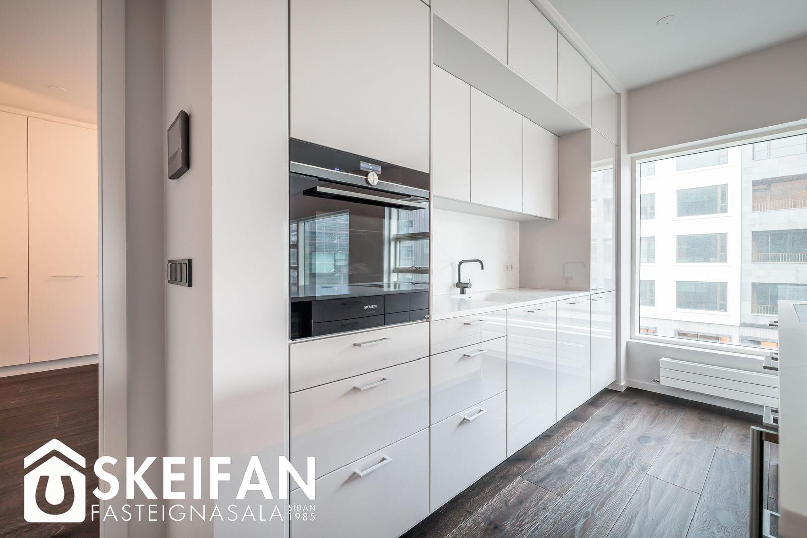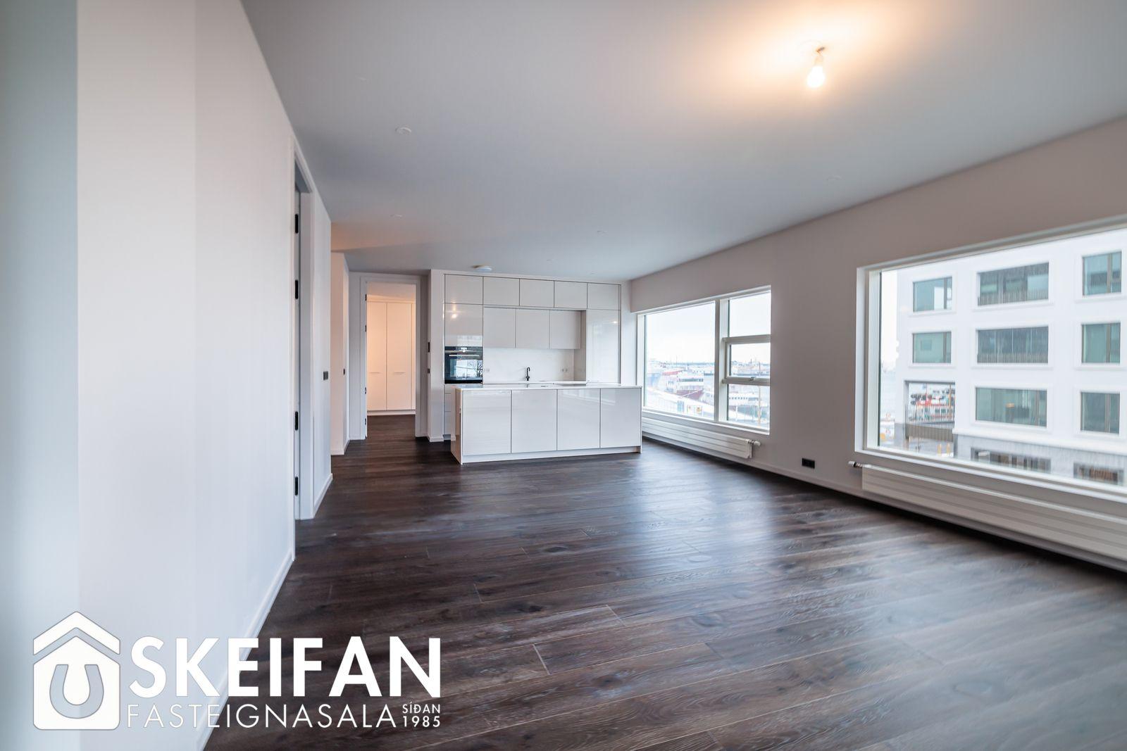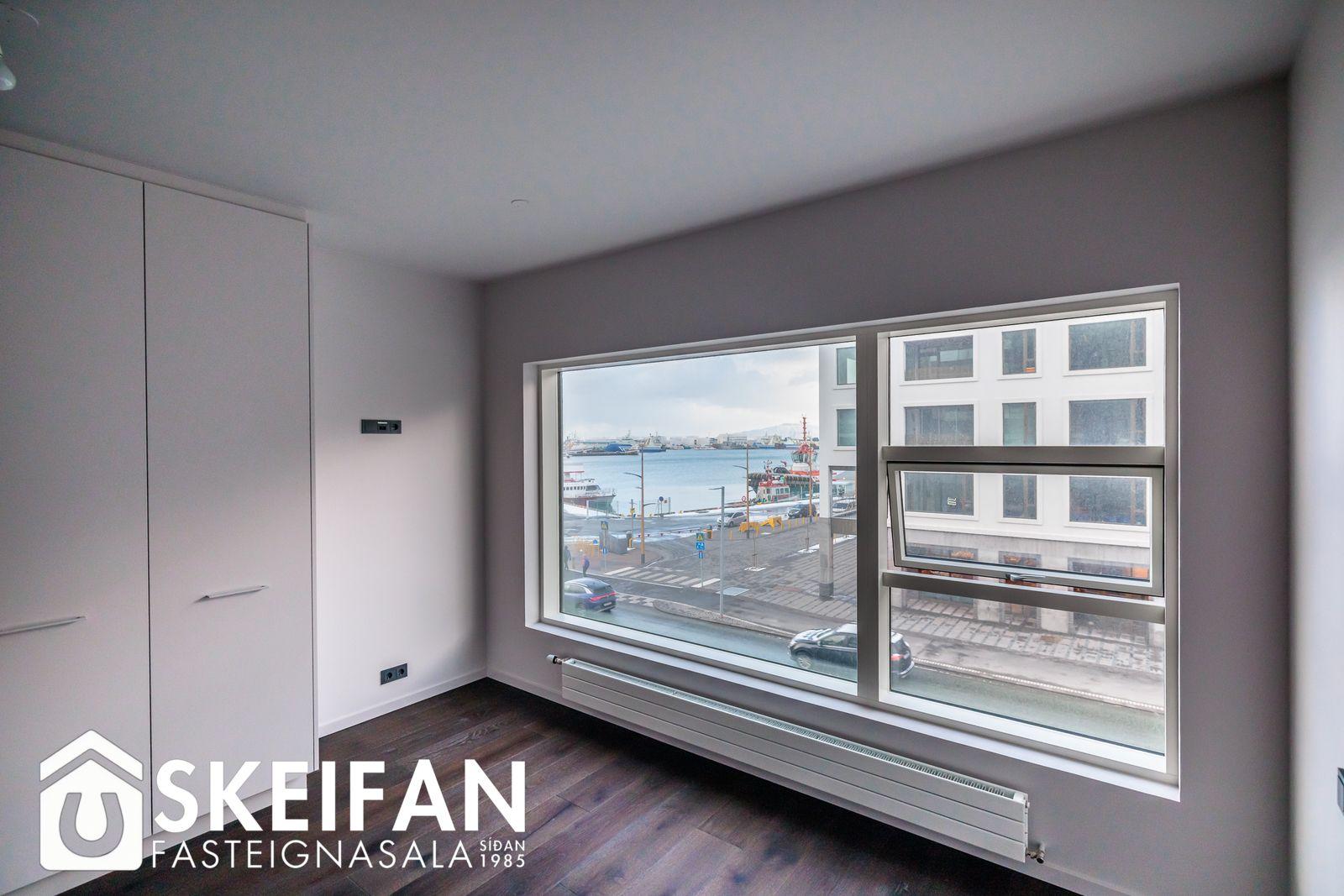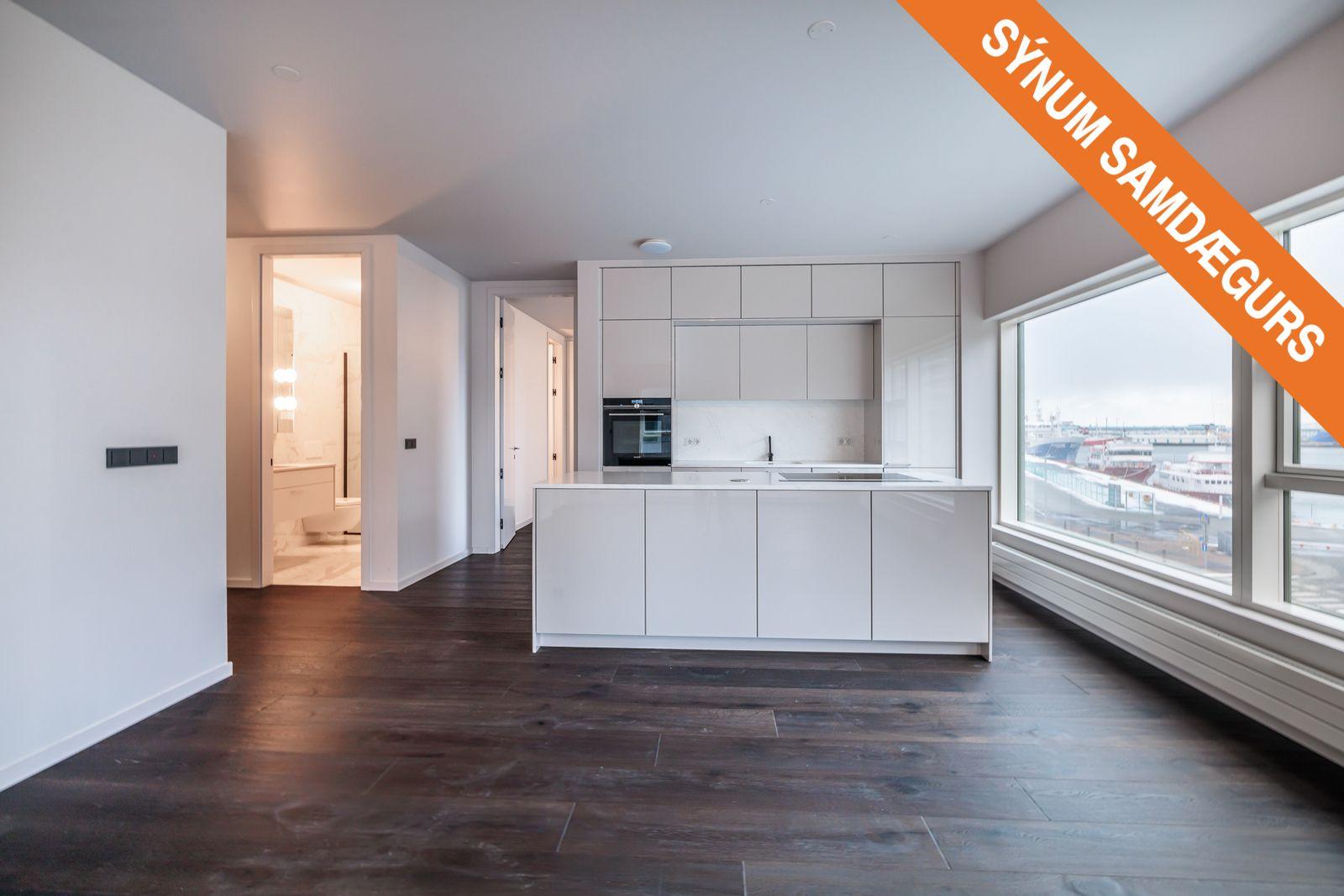 Halldór Kristján í síma: 618-9999 / HALLDOR@SKEIFAN.ISKolagata 1 er hluti af Hafnartorgi sem samanstendur af 70 íbúðum í háum gæðaflokki. Byggingarnar tengjast með sameiginlegum bílakjallara, sem tengist einnig við bílakjallara Hörpunnar ásamt örðum byggingum og verður með þeirri tengingu einn stærsti bílakjallari landsins. Hönnun bygginganna er fáguð og tímalaus með áherslur á efni og efnisáferðir, vandaðan frágang, vandaðar innréttingar, búnað og tæki.Almenn lýsing: Að innan er íbúðin máluð með gráu litaþema. Veggir, loft, hurðir og innréttingar eru samlitar. Útihurðir eru raflæstar og tengdar heildstæðu aðgangsstýrikerfi. Dyrasími með myndavél frá Bticino og þráðlausu e-net ljósastýrikerfi frá GIRA. Allar íbúðir eru með loftræstikerfi þar sem upphituðu fersklofti er dælt inn í íbúðir og í votrýmum er vélrænt útsog.