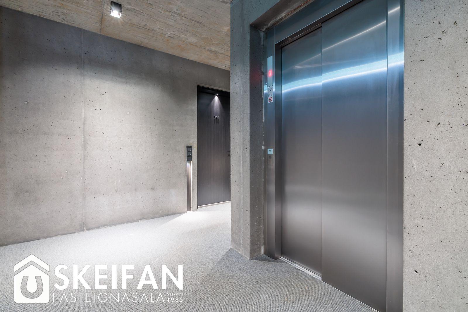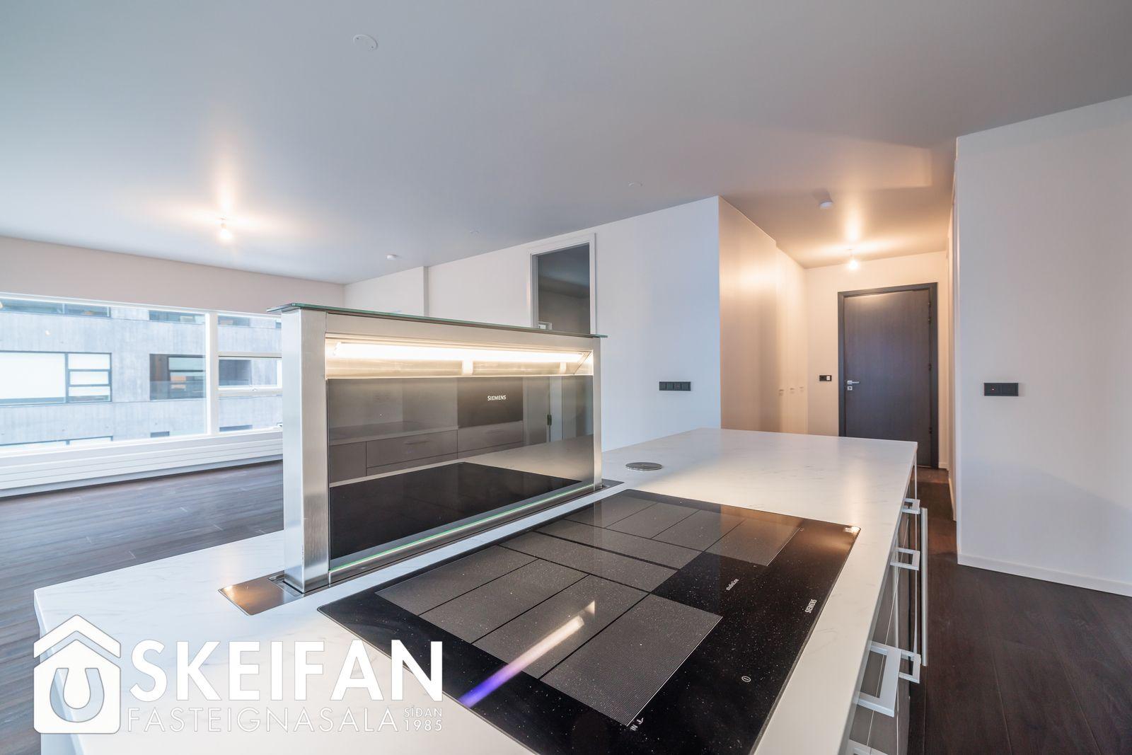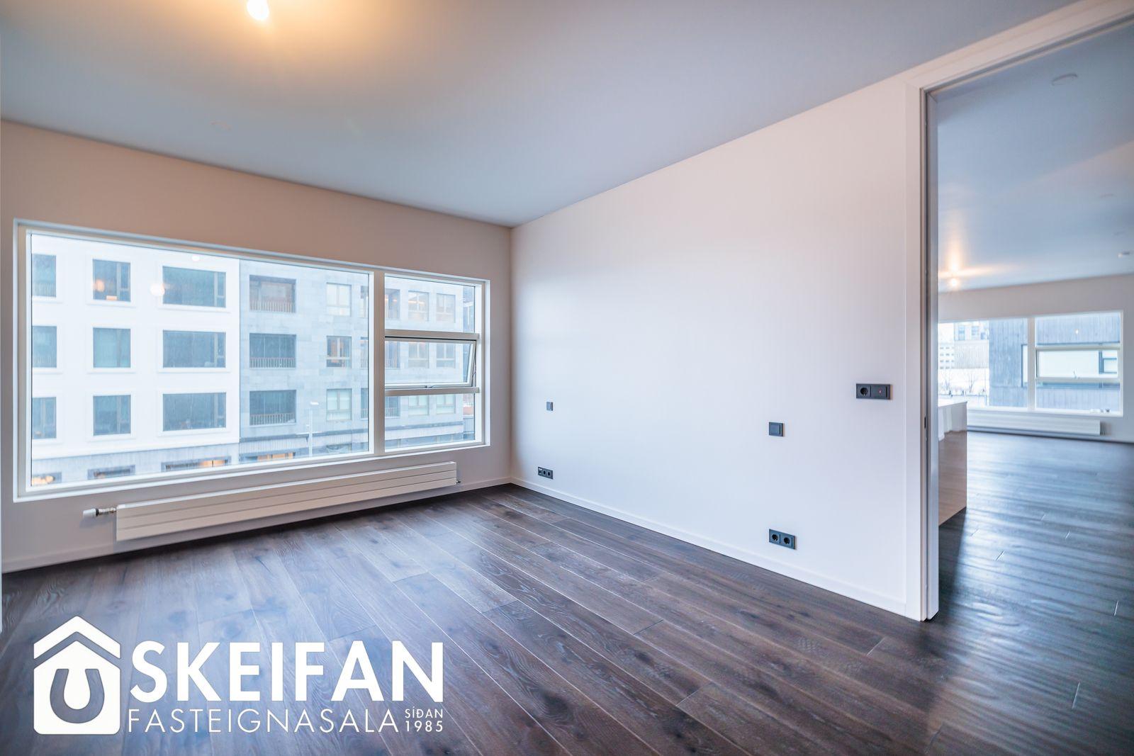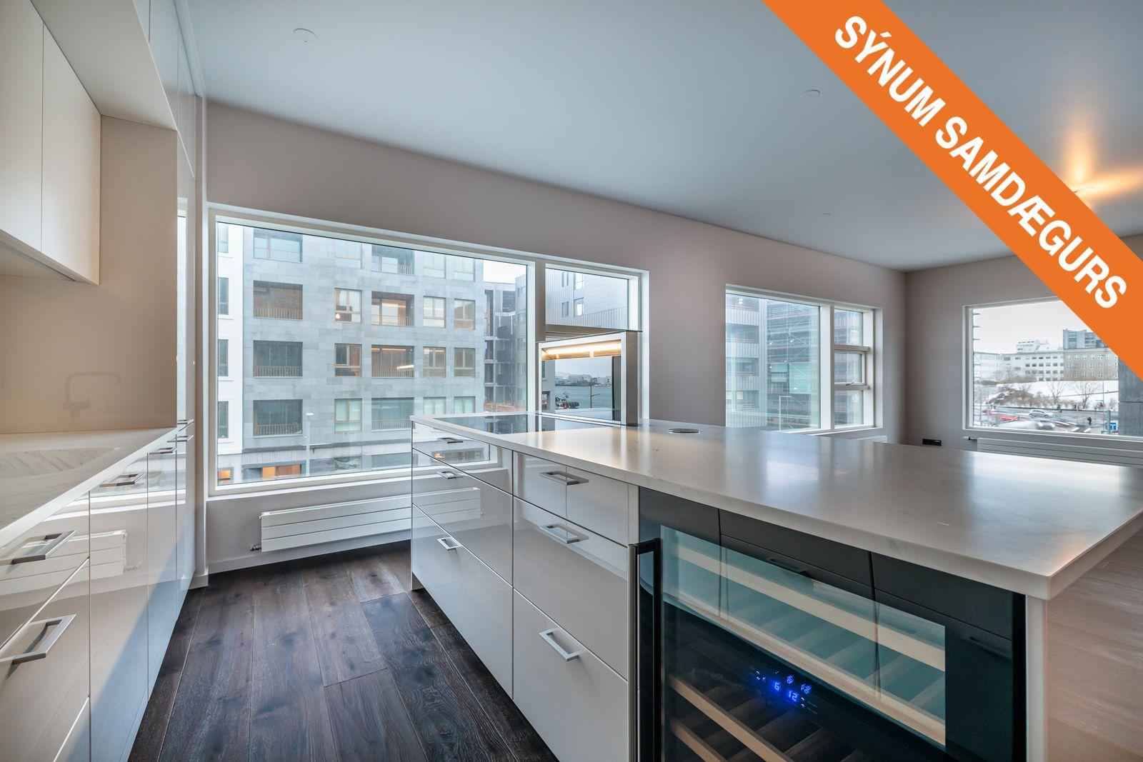 Halldór Kristján í síma: 618-9999 / HALLDOR@SKEIFAN.ISKolagata 1 er hluti af Hafnartorgi sem samanstendur af 70 íbúðum í háum gæðaflokki. Byggingarnar tengjast með sameiginlegum bílakjallara, sem tengist einnig við bílakjallara Hörpunnar ásamt örðum byggingum og verður með þeirri tengingu einn stærsti bílakjallari landsins. Hönnun bygginganna er fáguð og tímalaus með áherslur á efni og efnisáferðir, vandaðan frágang, vandaðar innréttingar, búnað og tæki.Almenn lýsing: Að innan er íbúðin máluð með gráu litaþema. Veggir, loft, hurðir og innréttingar eru samlitar. Útihurðir eru raflæstar og tengdar heildstæðu aðgangsstýrikerfi. Dyrasími með myndavél frá Bticino og þráðlausu e-net ljósastýrikerfi frá GIRA. Allar íbúðir eru með loftræstikerfi þar sem upphituðu fersklofti er dælt inn í íbúðir og í votrýmum er vélrænt útsog.