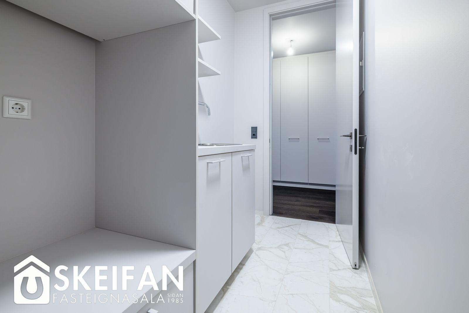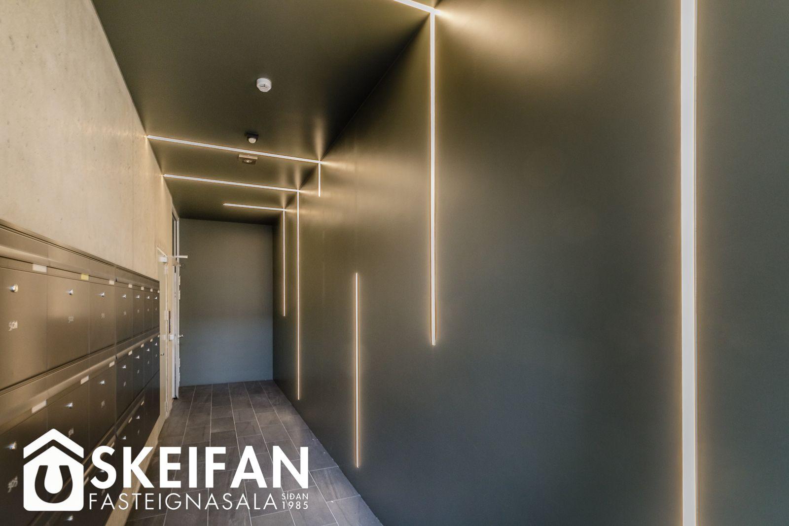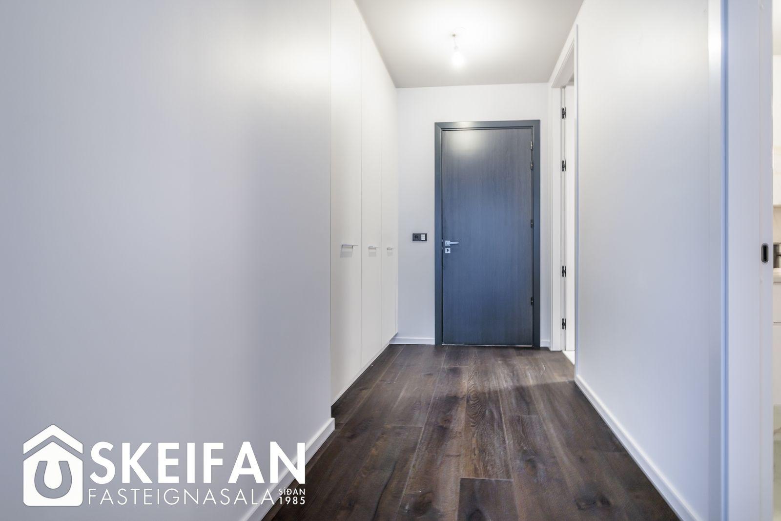 Anddyri: Fataskápar eru í anddyri sem eru spónlagðir að innan með lýsingu og hurðum. Ytra byrði er sprautu lakkað í litaþema íbúðarinnar. Innvols er frá Innval með fylgihluti af vandaðri gerð.