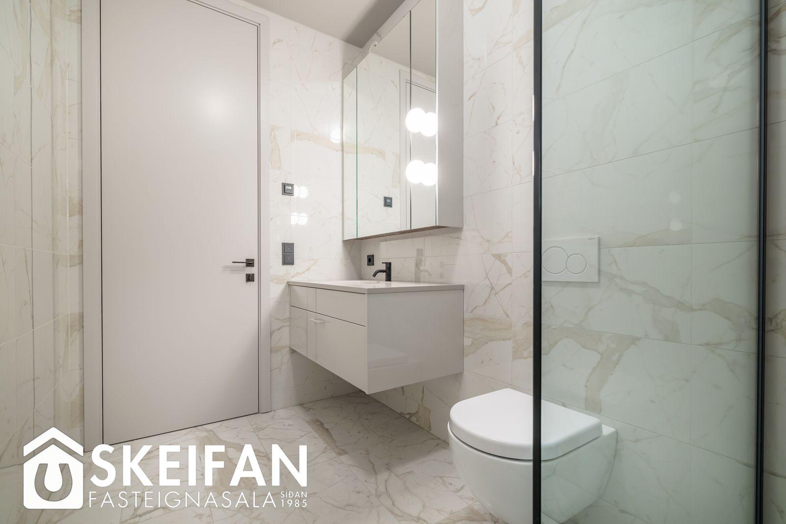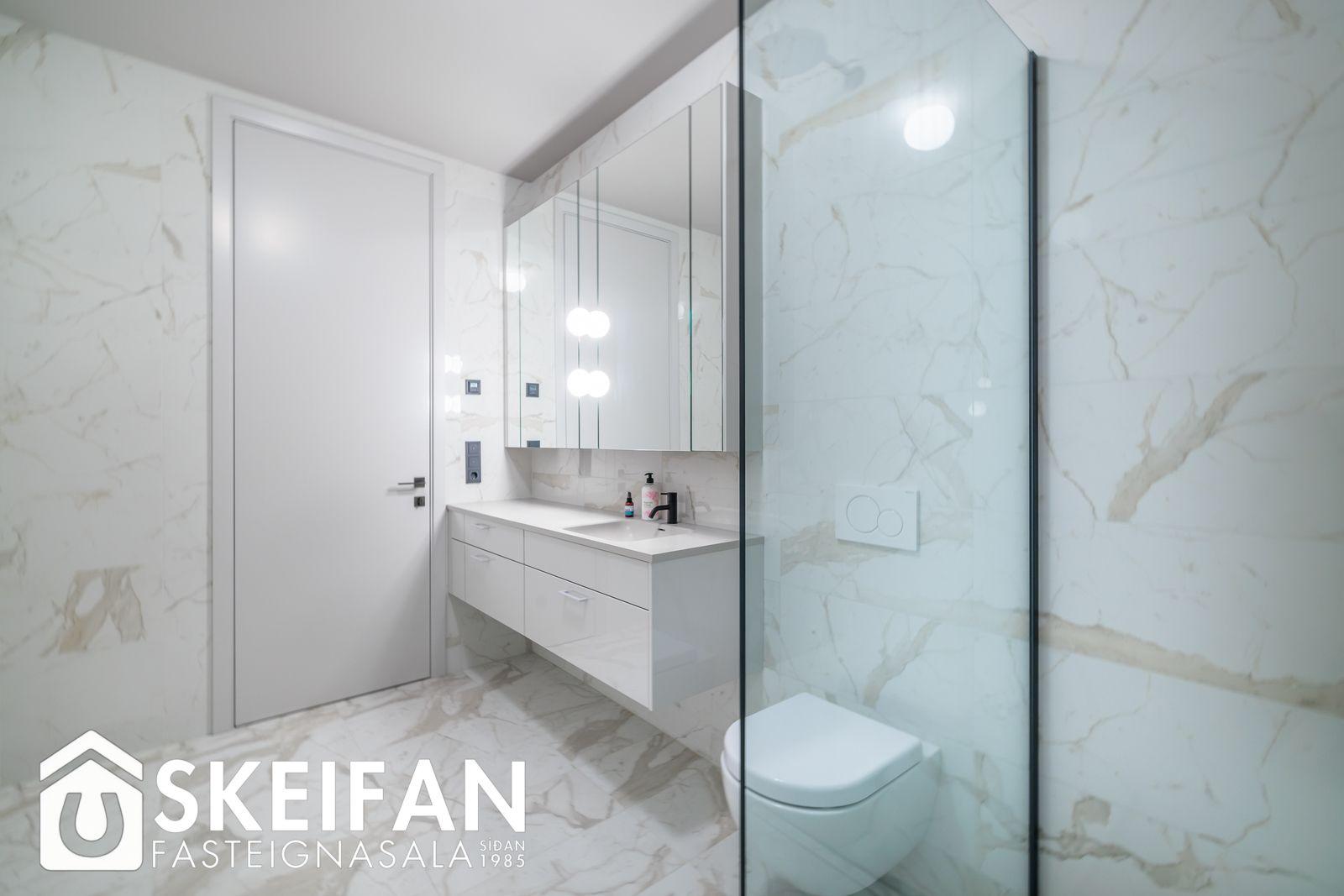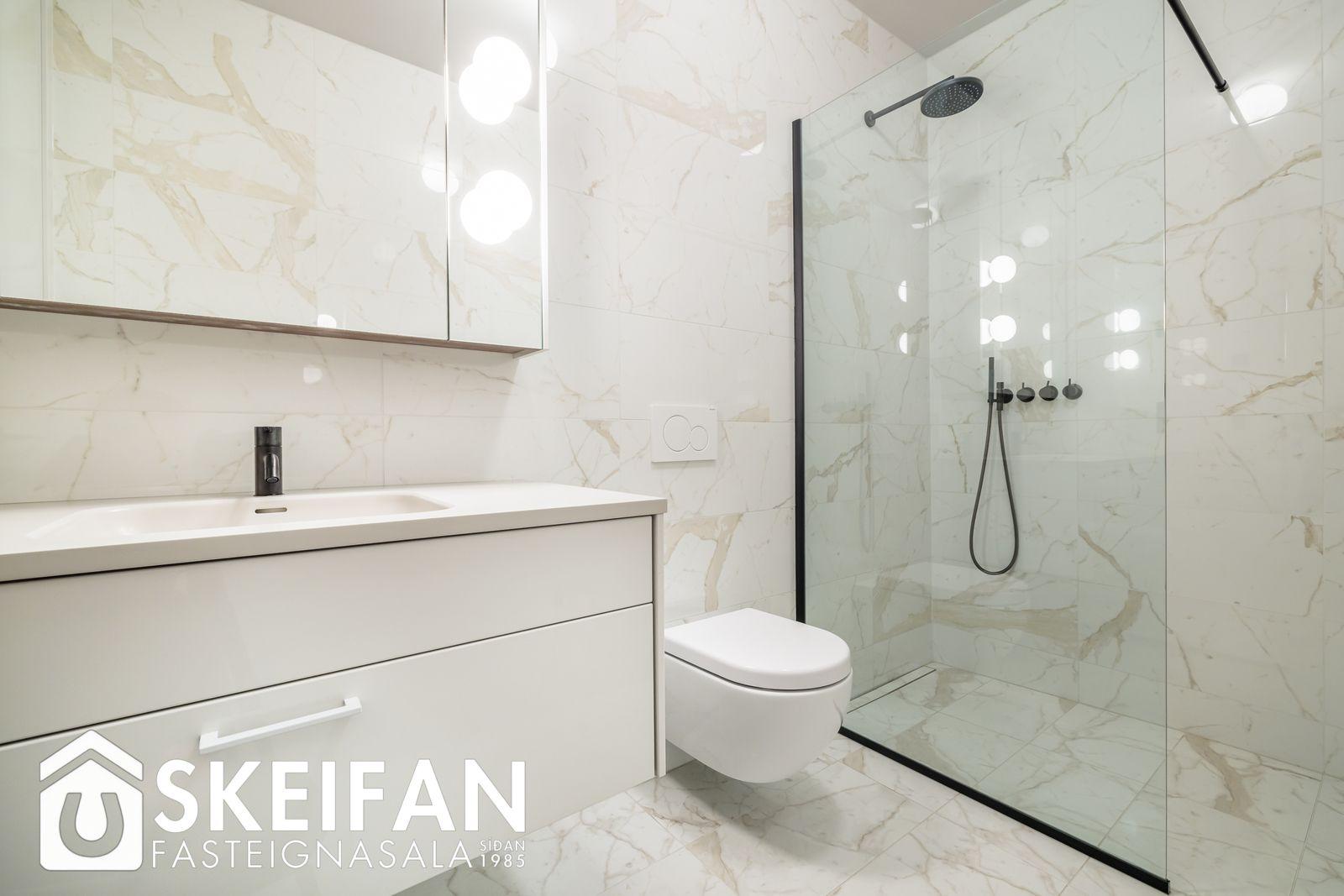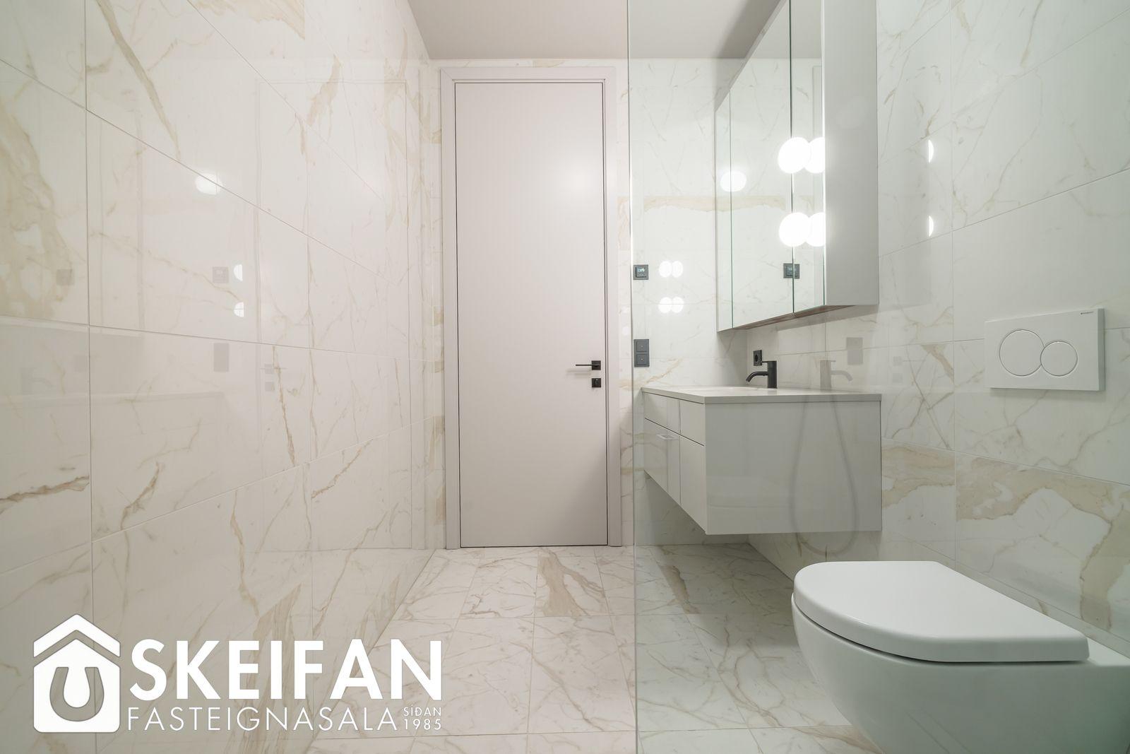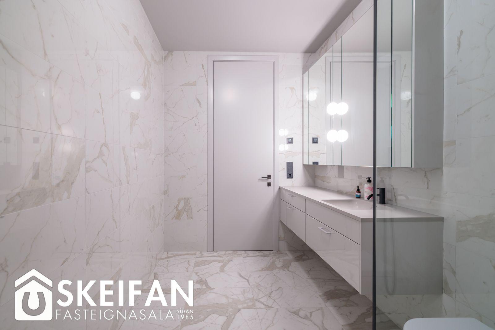 Baðherbergi: Votrými eru flísalögð með ítölskum gæðaflísum með marmaramynstri frá Iris. Innrétting er í litaþema íbúðar, háglans grá frá Noblessa með Meganite borðplötu og innbyggðum vaski úr sama efni. Speglalýsing á baðherbergjum er Mini Glo Ball frá Flos. Hreinlætistæki eru frá Vola. Salerni upphengd með innbyggðum vatnskassa.
