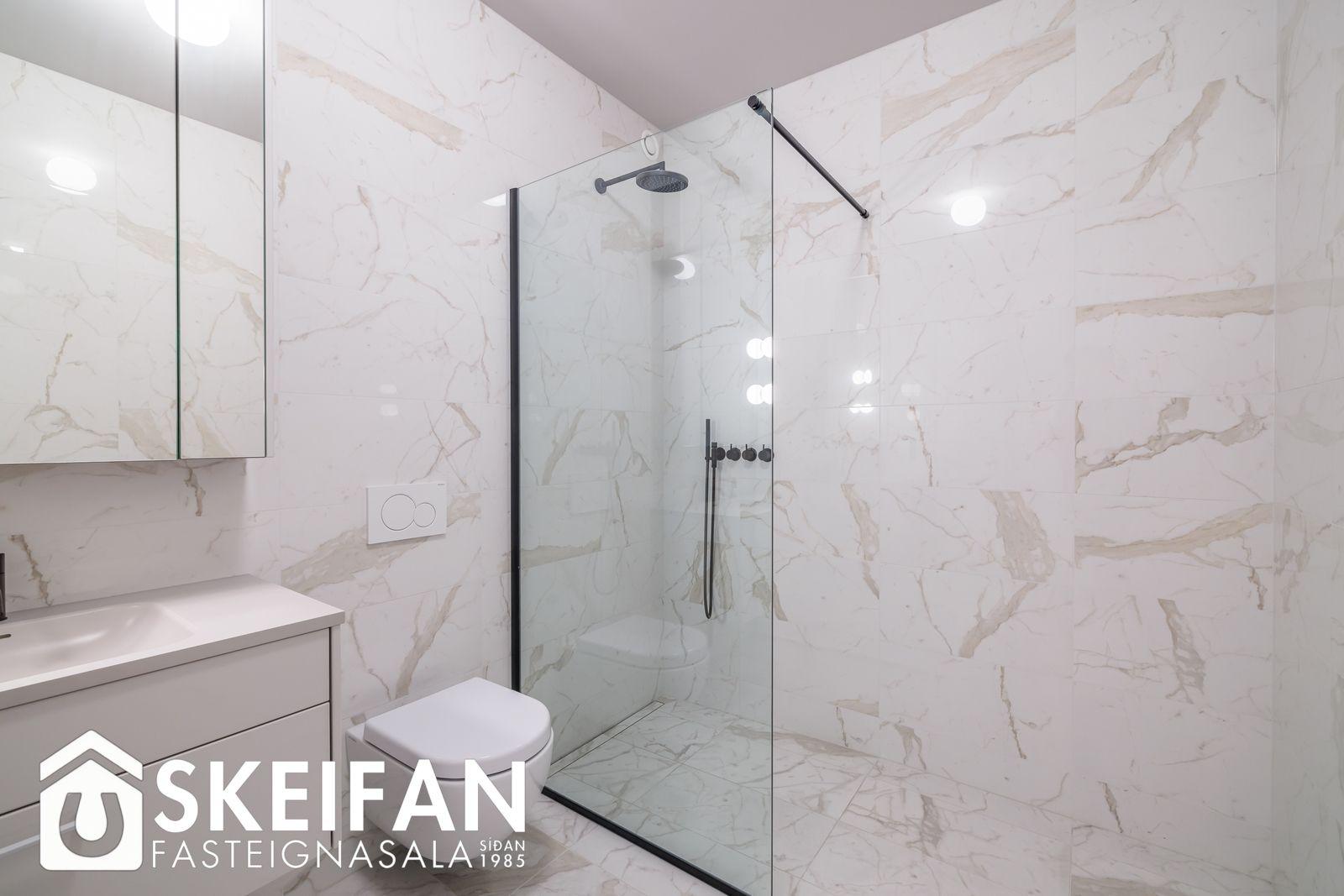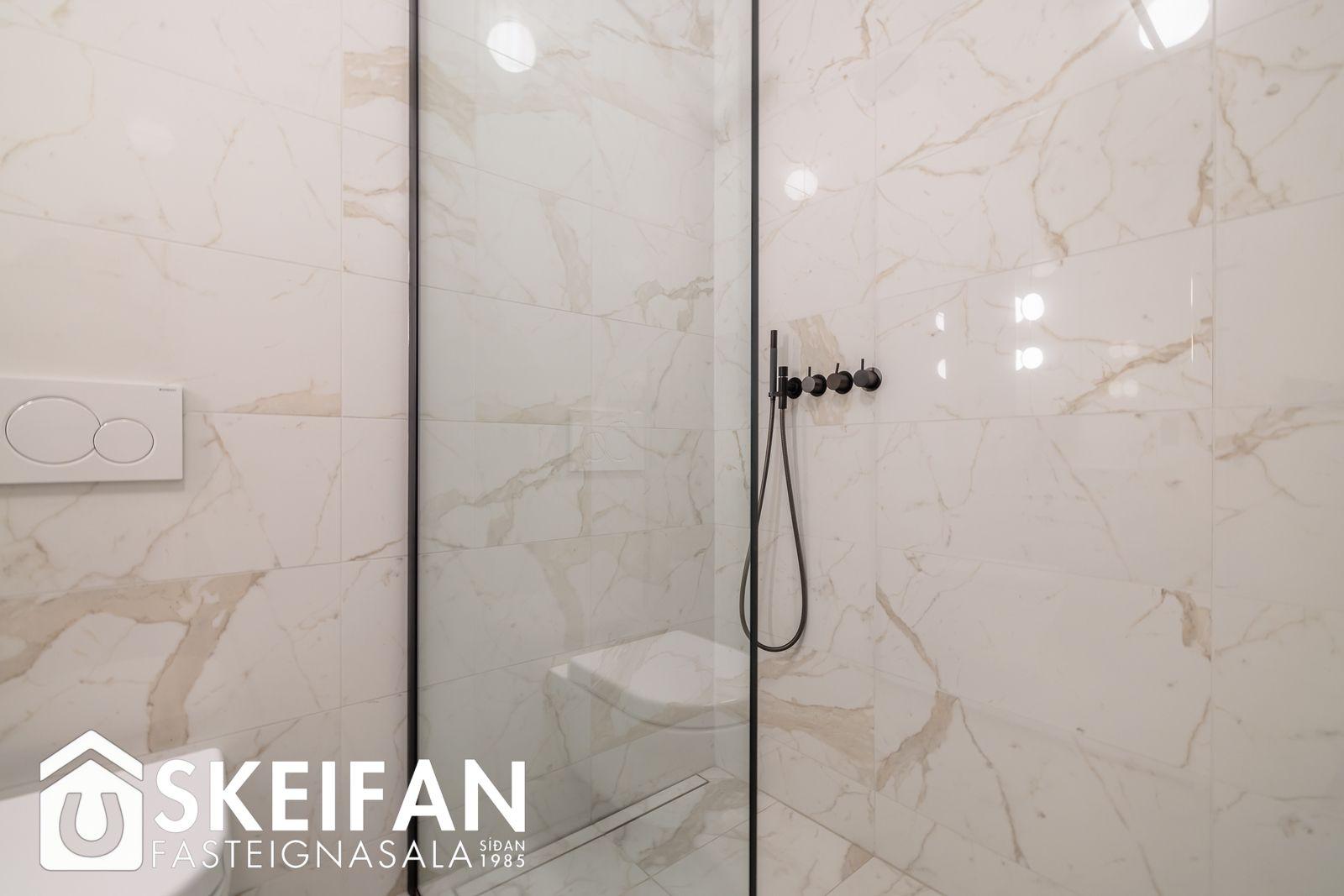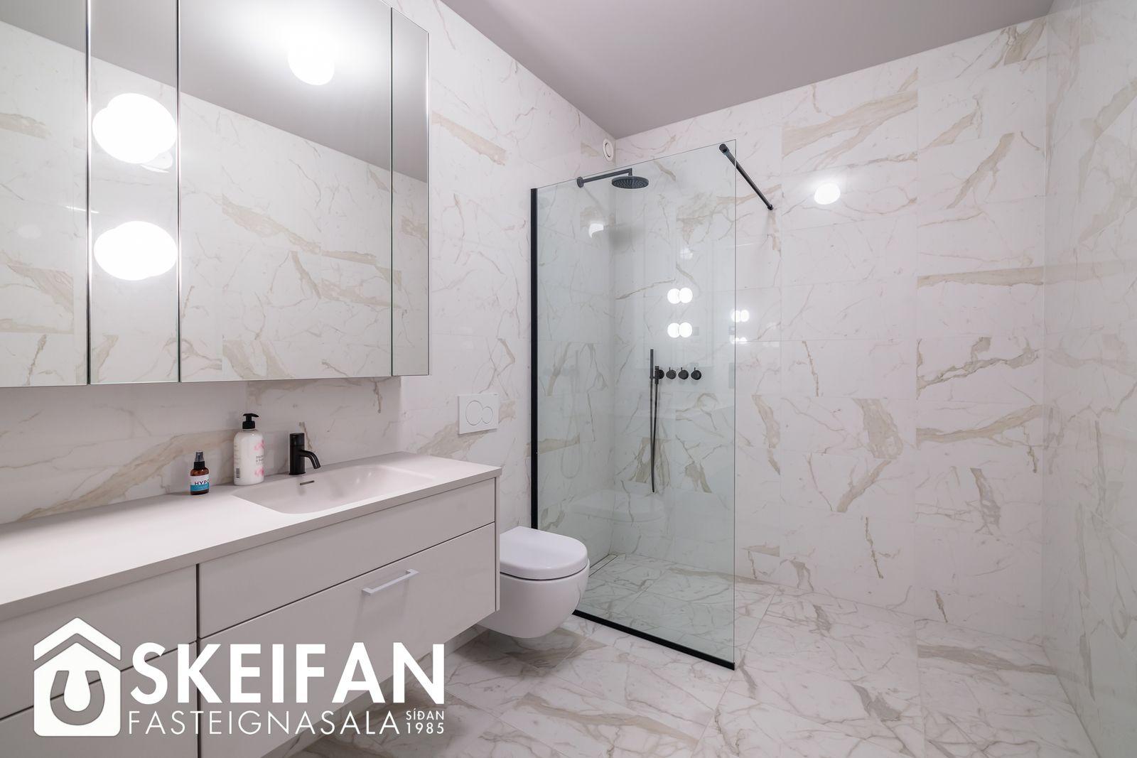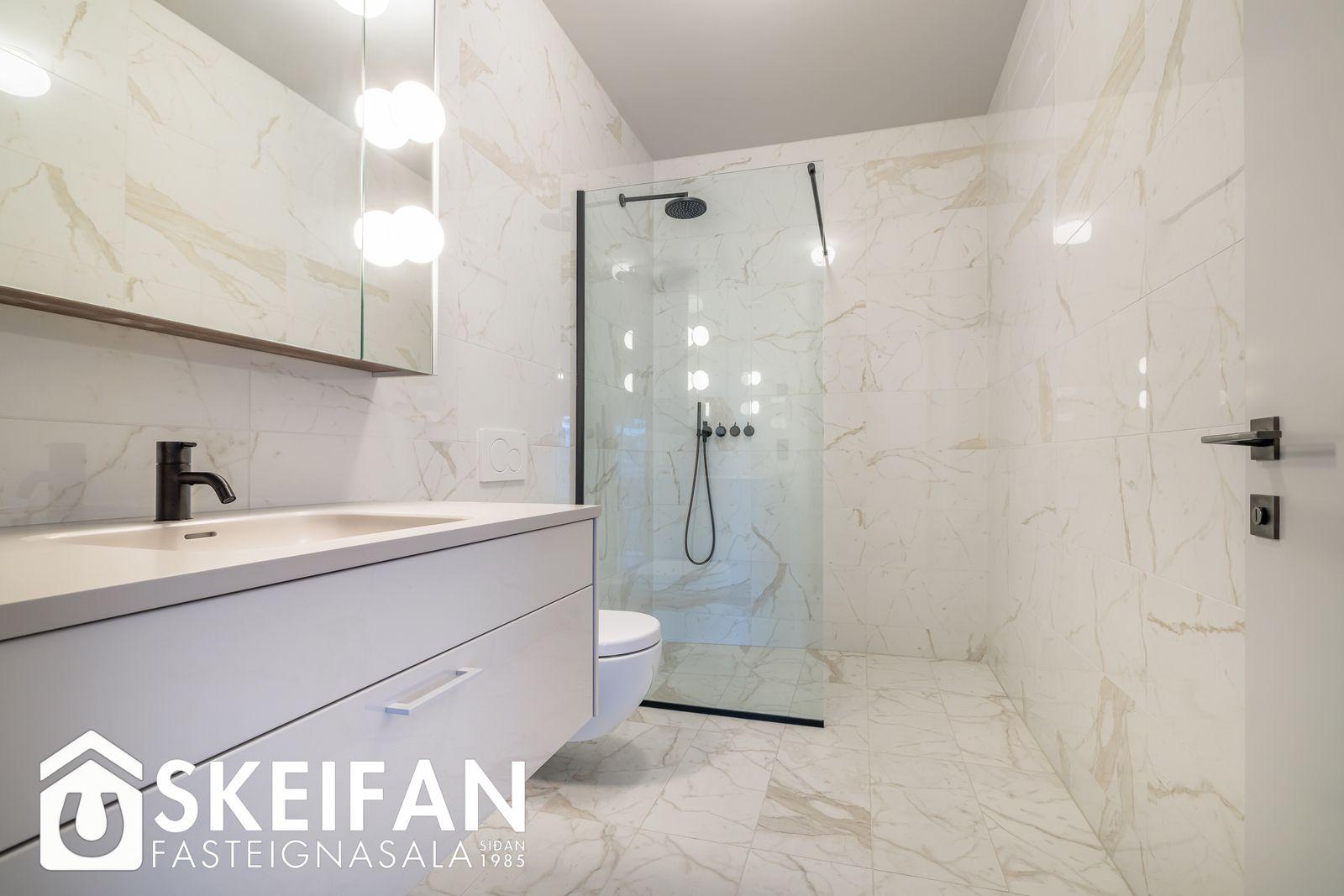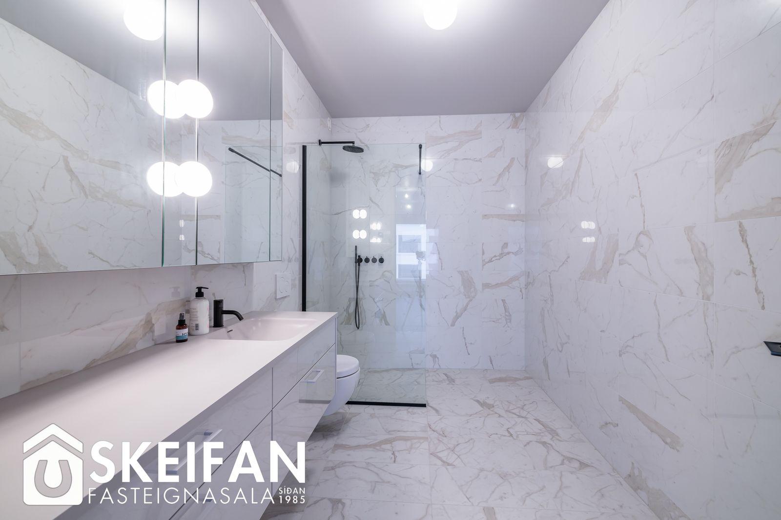 Baðherbergi: Votrými eru flísalögð með ítölskum gæðaflísum með marmaramynstri frá Iris. Innrétting er í litaþema íbúðar, háglans grá frá Noblessa með Meganite borðplötu og innbyggðum vaski úr sama efni. Speglalýsing á baðherbergjum er Mini Glo Ball frá Flos. Hreinlætistæki eru frá Vola. Salerni upphengd með innbyggðum vatnskassa.