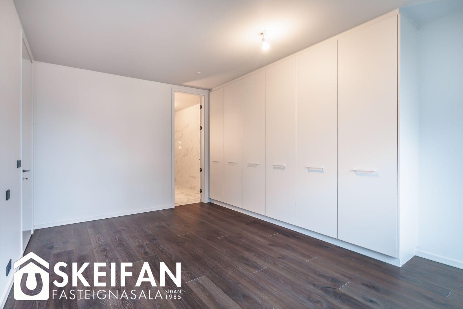 Hjónaherbergi: Fataskápar í svefnherbergjum eru spónlagðir að innan og með hurðum og ytra byrði sem eru sprautu lakkaðar í litaþema íbúðarinnar. Innvols er frá Innval með fylgihluti af vandaðri gerð.