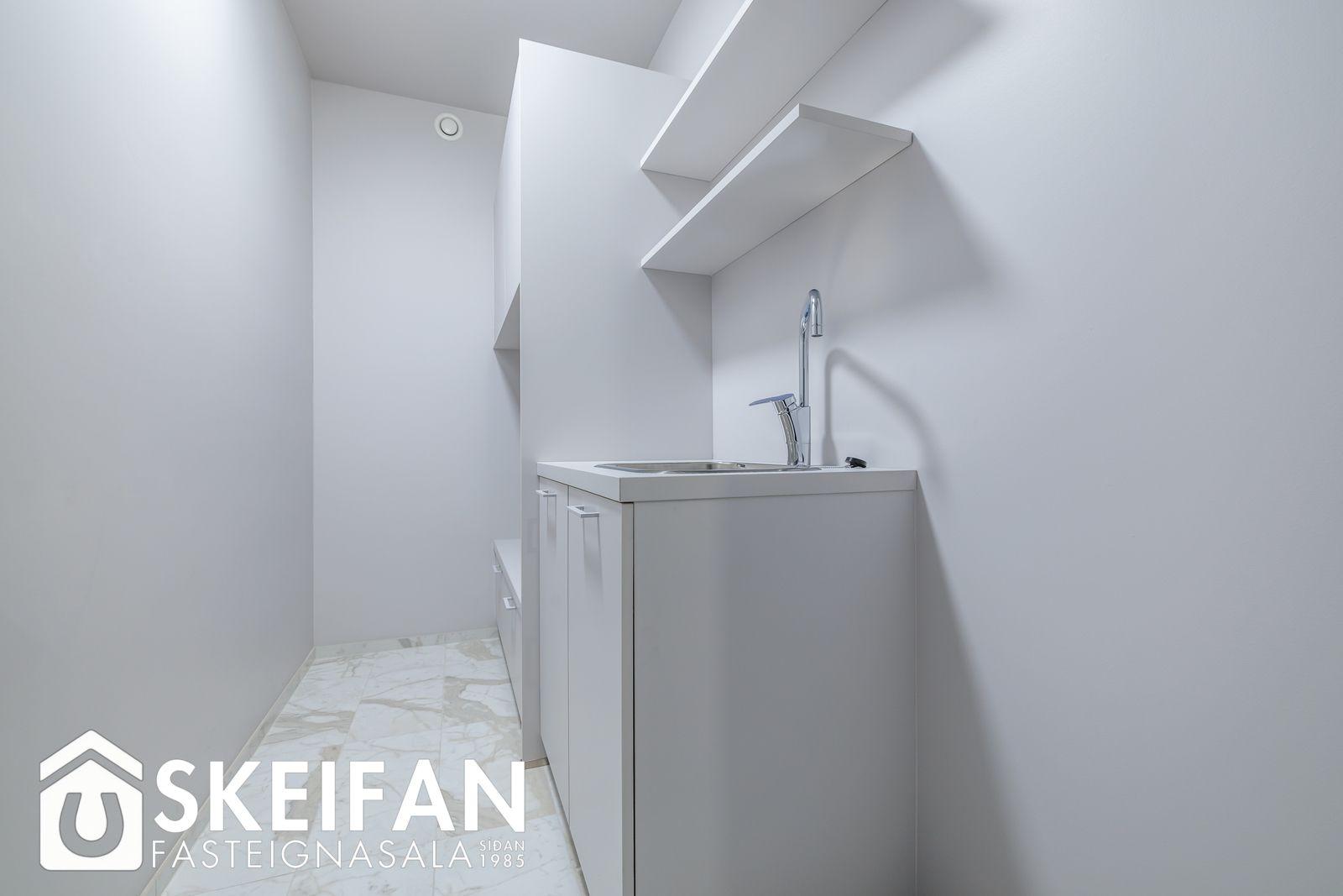 Þvottaherbergi: Flísalögð með sömu flísum og í baðherbergi. Innrétting er frá Noblessa í sama litaþema. Rakaheldir ljósakúpplar eru í þvottaherbergi.