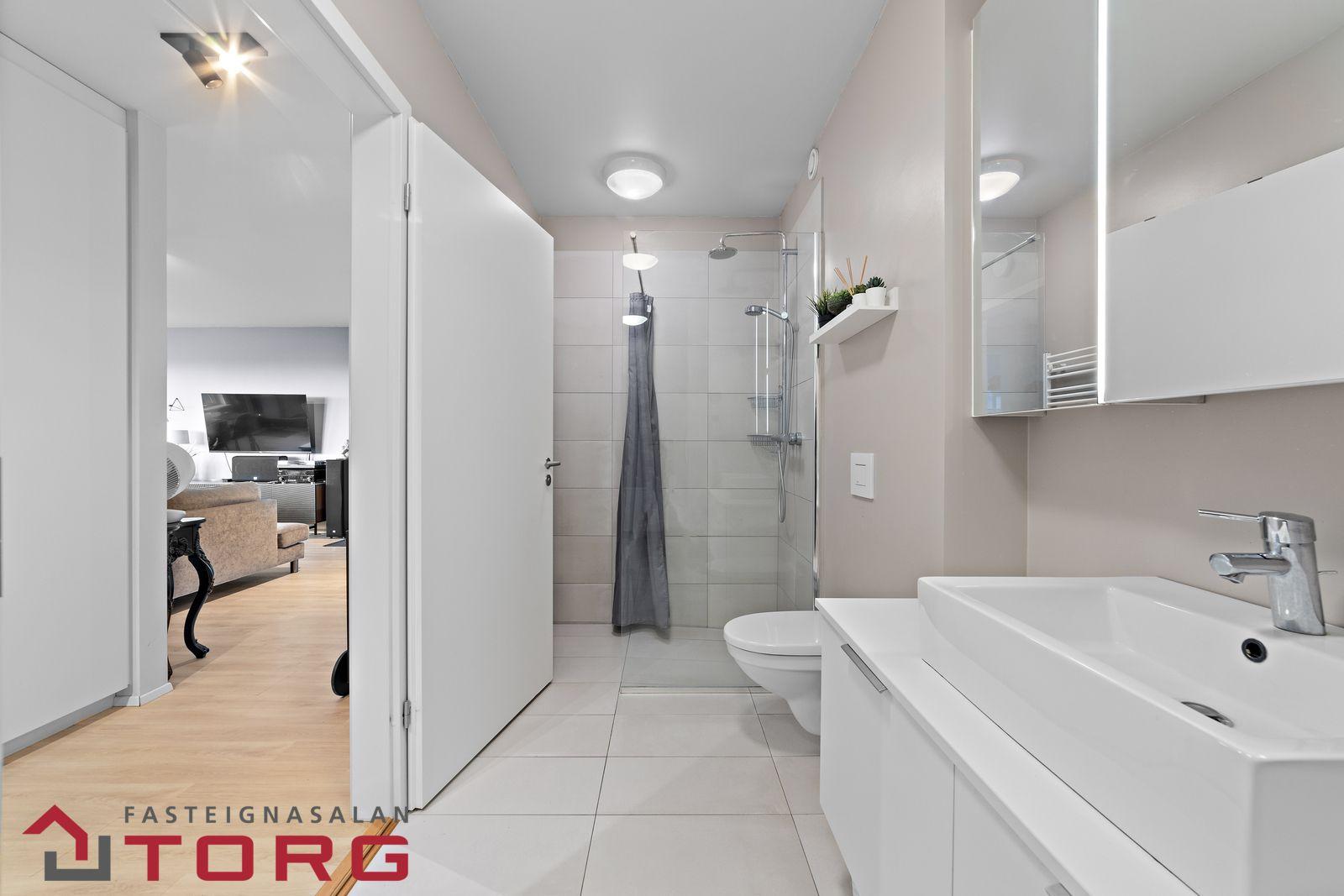 Baðherbergi. Falleg innrétting, speglahurðaskápur með lýsingu, walk in sturta, upphengt salerni, handklæðaofn. Tengi fyrir þvottavélar er inni á baðherberginu.
