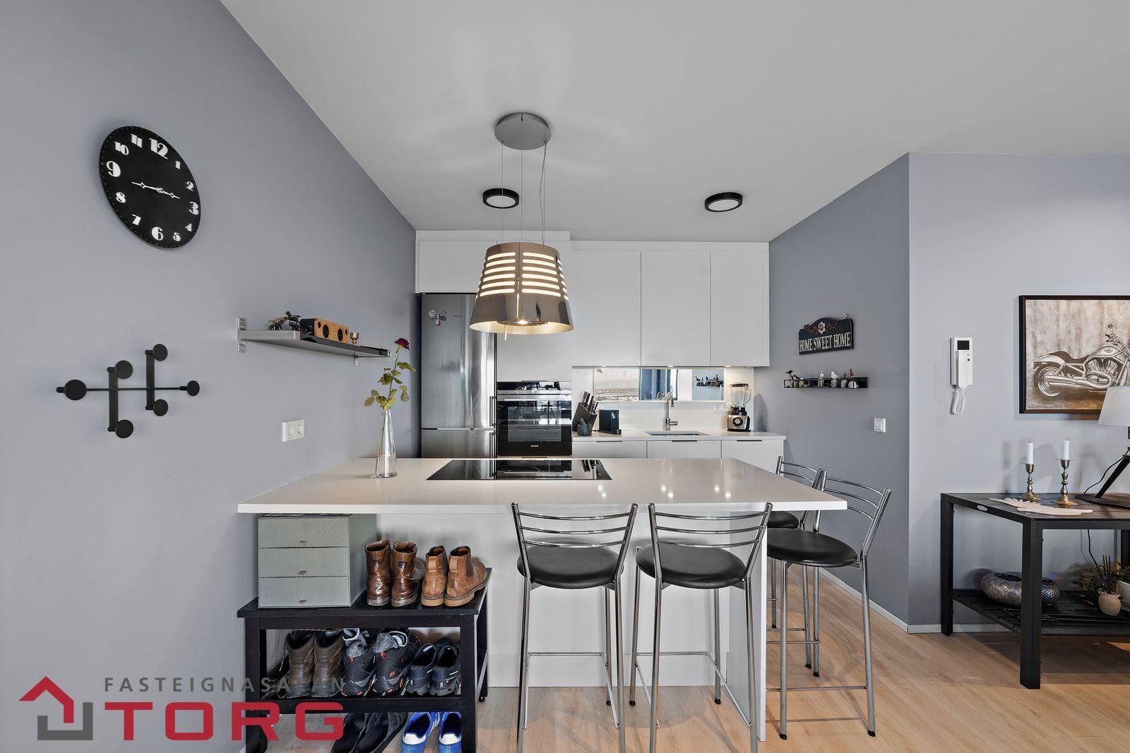 Eldhús. Opið og fallegt eldhús. Góð hvít eldhúsinnrétting með loftháum skápum. Þykkar marmaraplötur á borðum og á veggnum við eldhúsvask. Helluborð á eyju, innbyggð uppþvottavél. Bakaraofn í vinnuhæð. Tæki frá Siemens og gufugleypir frá AEG.